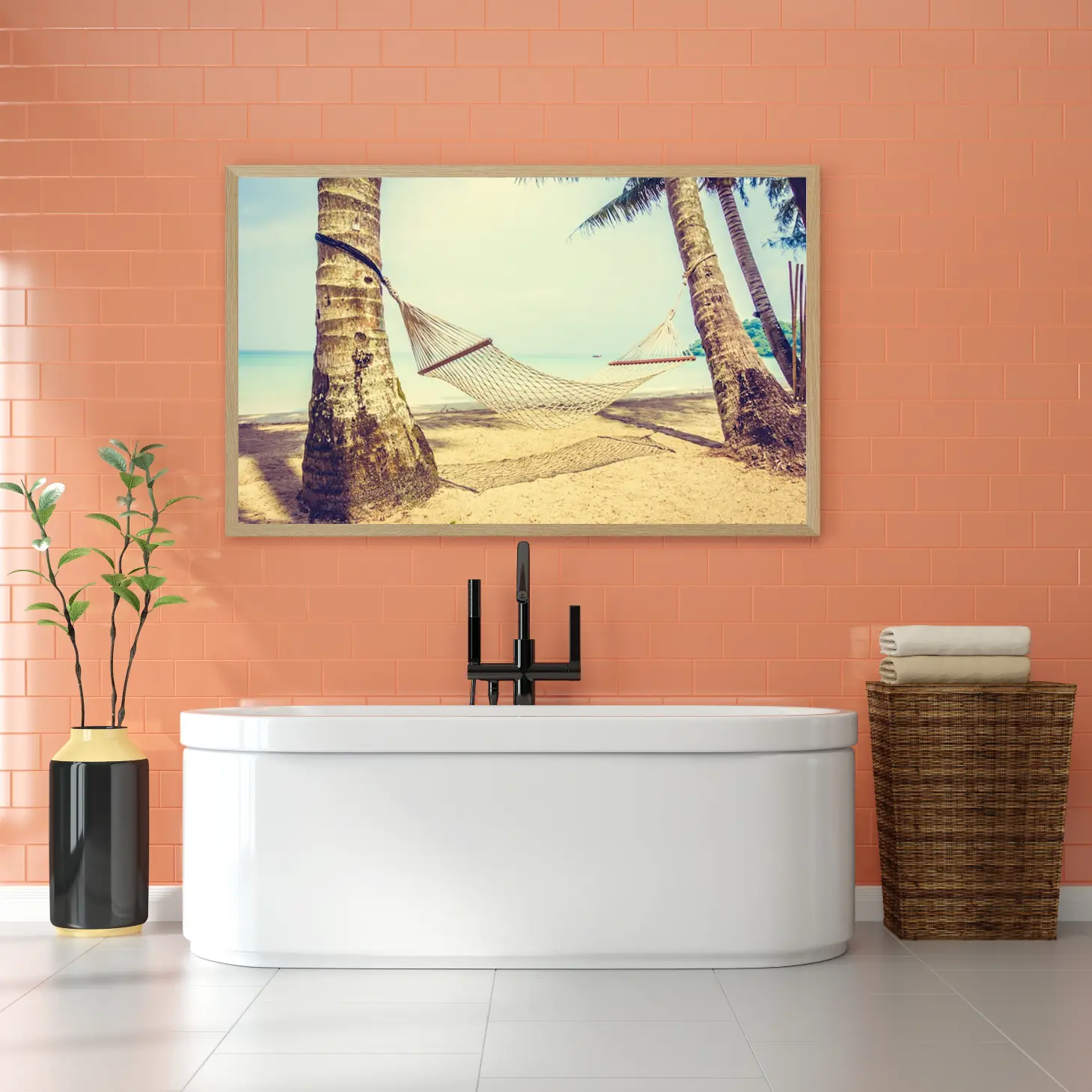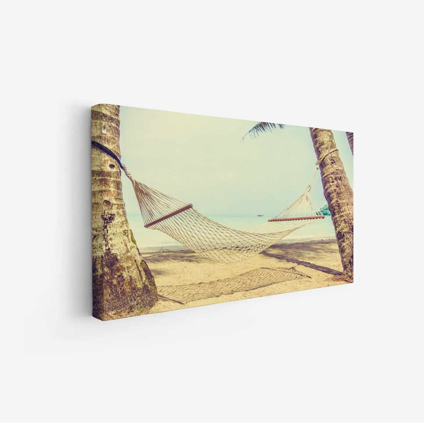استمتع بأجواء الاسترخاء مع هذه اللوحة الفنية التي تجسد لحظة هادئة تحت أشعة الشمس، حيث تتدلى أرجوحة بين أشجار النخيل على شاطئ رملي. تضفي الألوان الدافئة لمسة من السكينة والجمال، مما يجعلها إضافة مثالية لأي مساحة تبحث عن لمسة من الهدوء والراحة.
