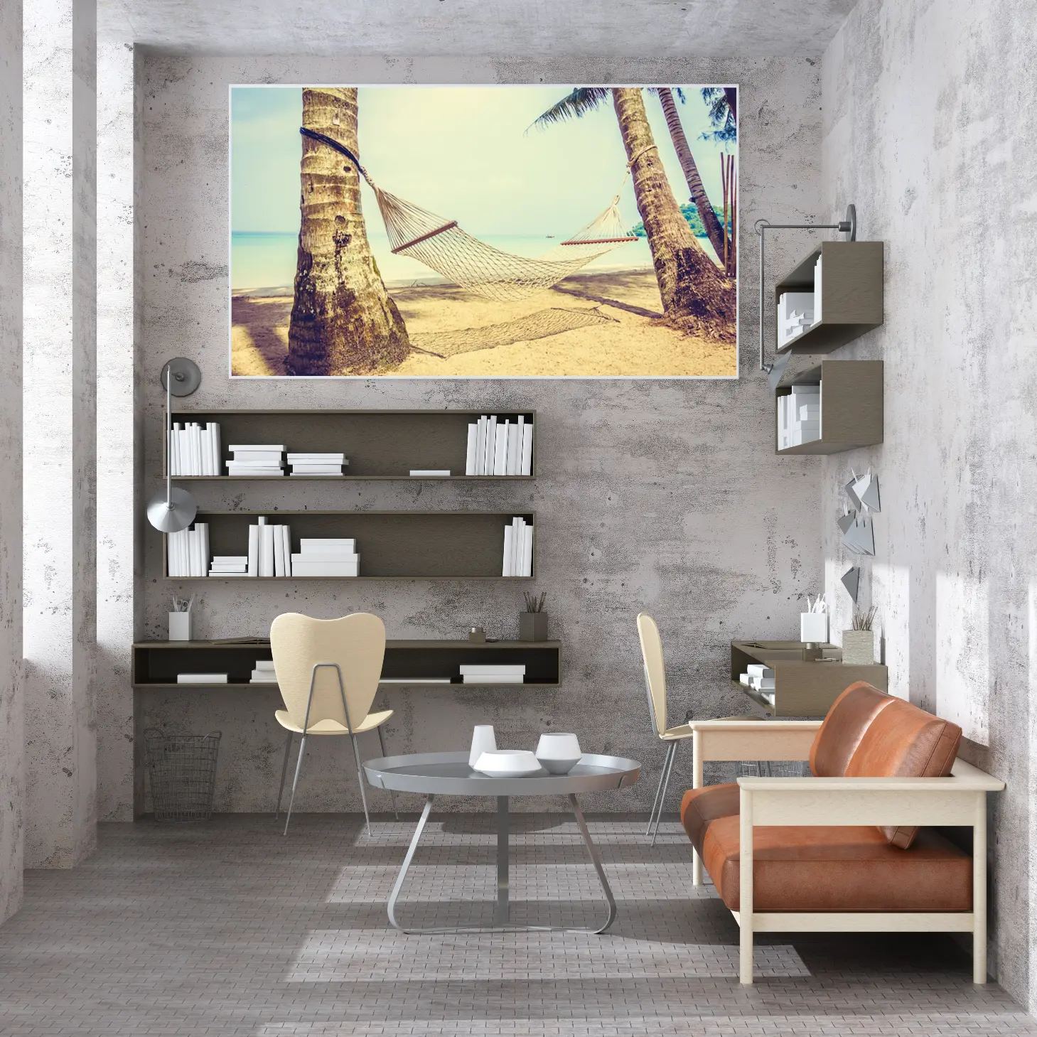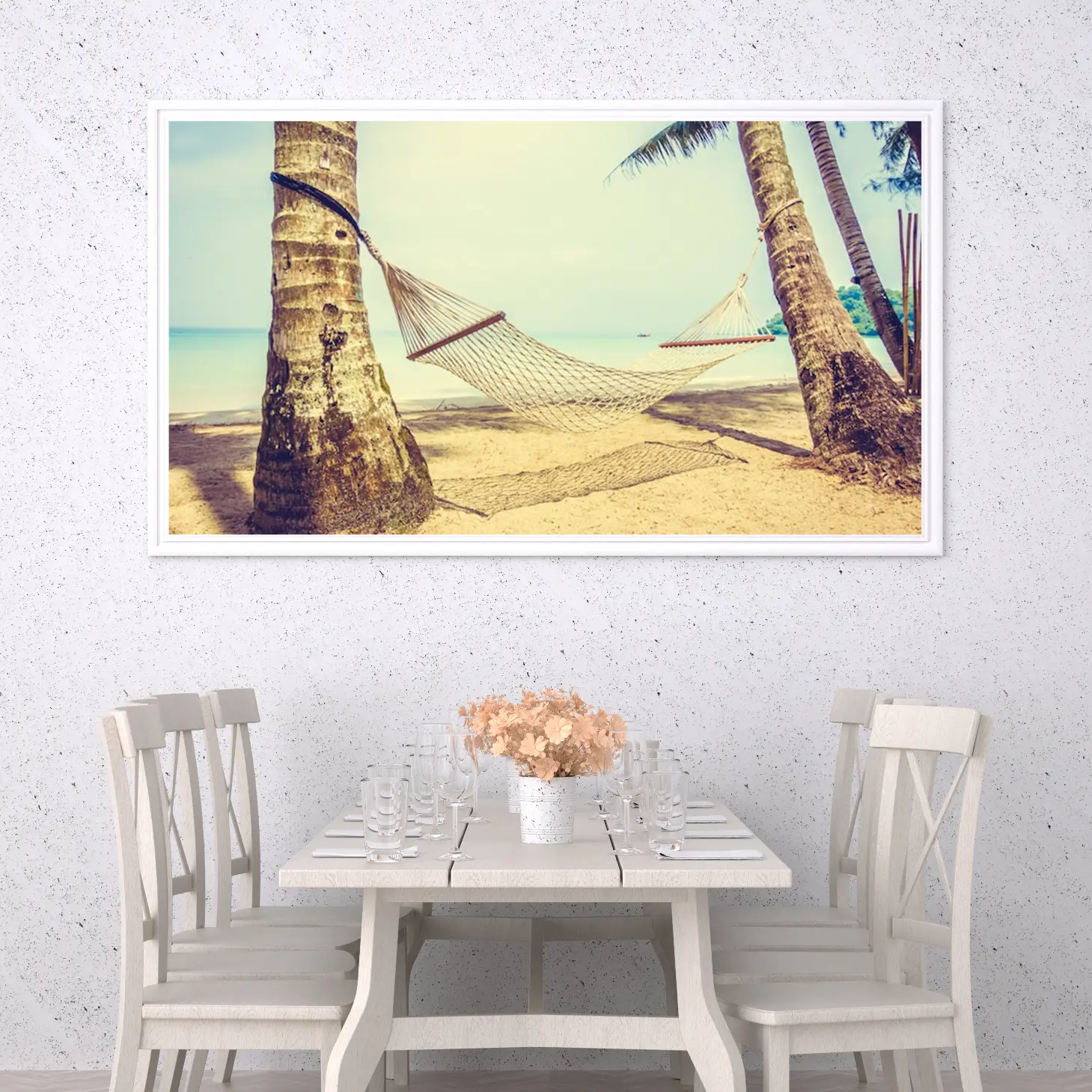 تجسد هذه اللوحات الفنية روح الاسترخاء والهدوء، حيث تنقل المشاهد إلى شاطئ ساحر تحت أشعة الشمس الدافئة. تتوسط اللوحة أرجوحة معلقة بين شجرتين، مما يضفي لمسة من السكينة والراحة. الألوان الهادئة والمشرقة تعكس جمال الطبيعة، مما يجعلها خيارًا مثاليًا لتزيين المساحات الداخلية.