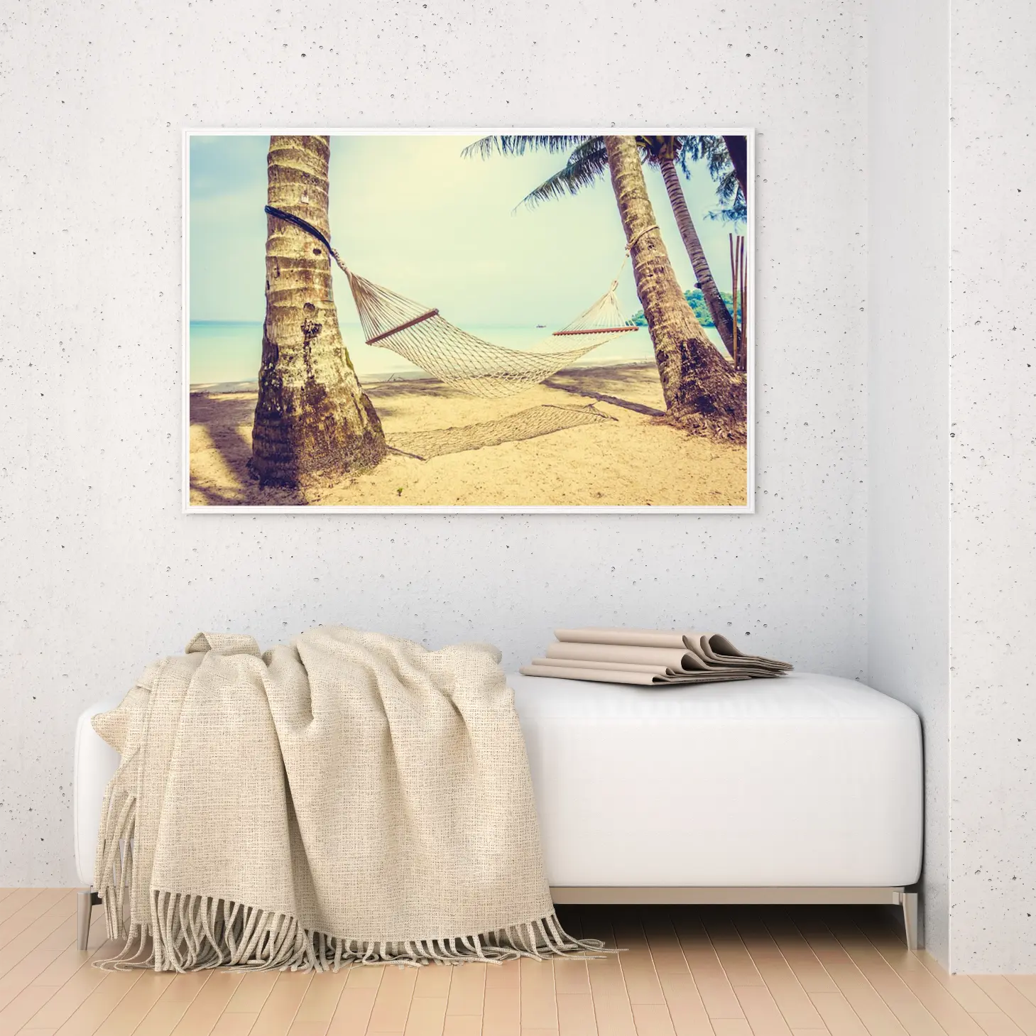 لوحات مناظر طبيعية لشاطئ هادئ مع أرجوحة بين أشجار النخيل، ألوان دافئة وجو استرخائي. لوحات فخمة، لوحات جدارية للمنزل، لوحات أنيقة.