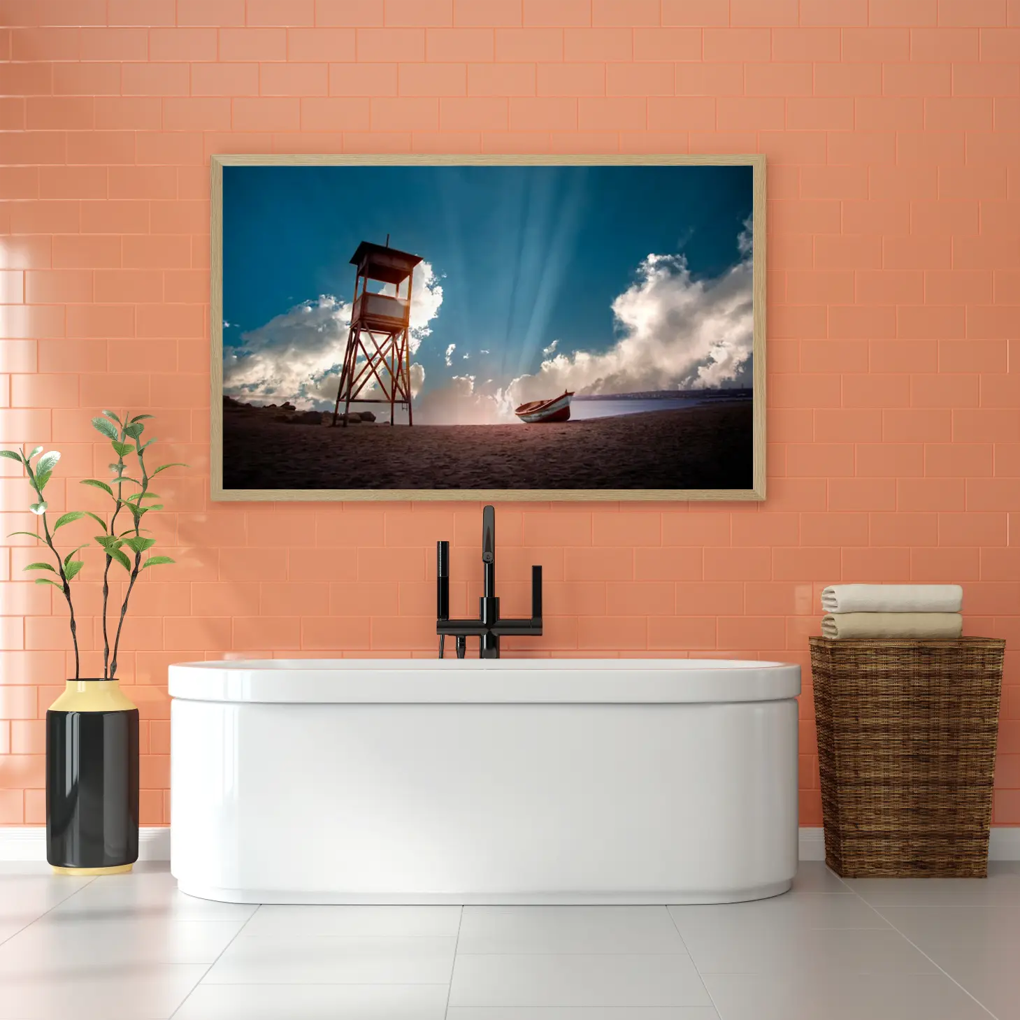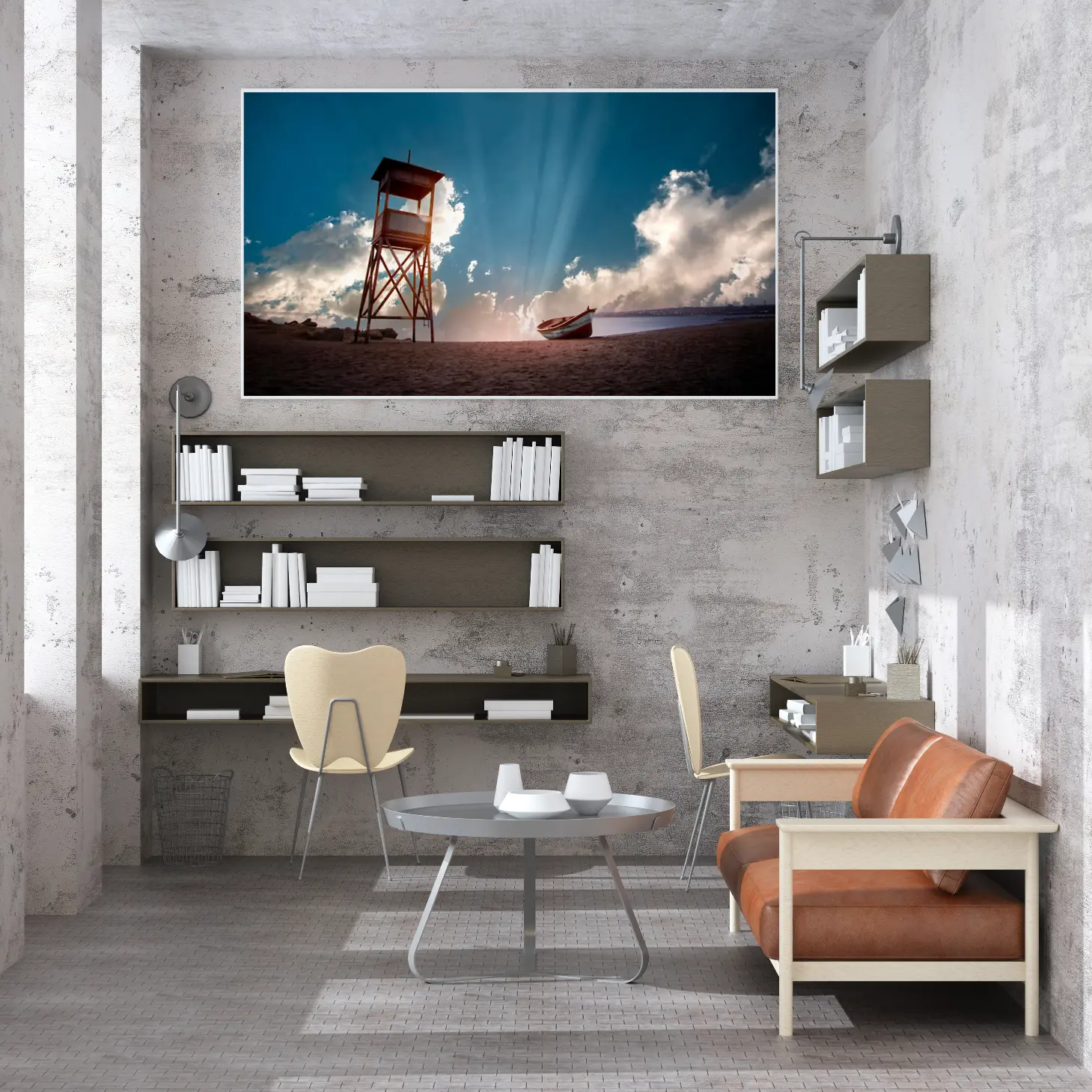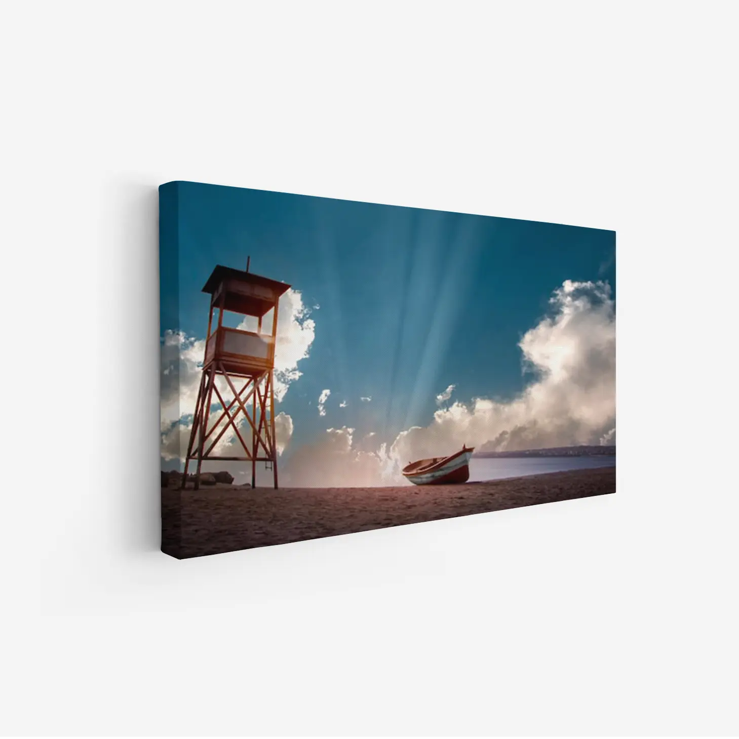 تجسد هذه اللوحات كانفاس جمال الطبيعة البحرية بأسلوب عصري يجذب الأنظار ويضفي لمسة من السحر على أي مساحة. تتألق الألوان الزاهية في مشهد يجمع بين السماء الزرقاء الصافية والسحب البيضاء المتناثرة، مما يخلق تباينًا رائعًا يلفت الانتباه. في قلب هذا المشهد، يبرز برج المراقبة الخشبي، الذي يرمز إلى الأمان والمراقبة، مما يضيف عمقًا ورمزية إلى العمل الفني.