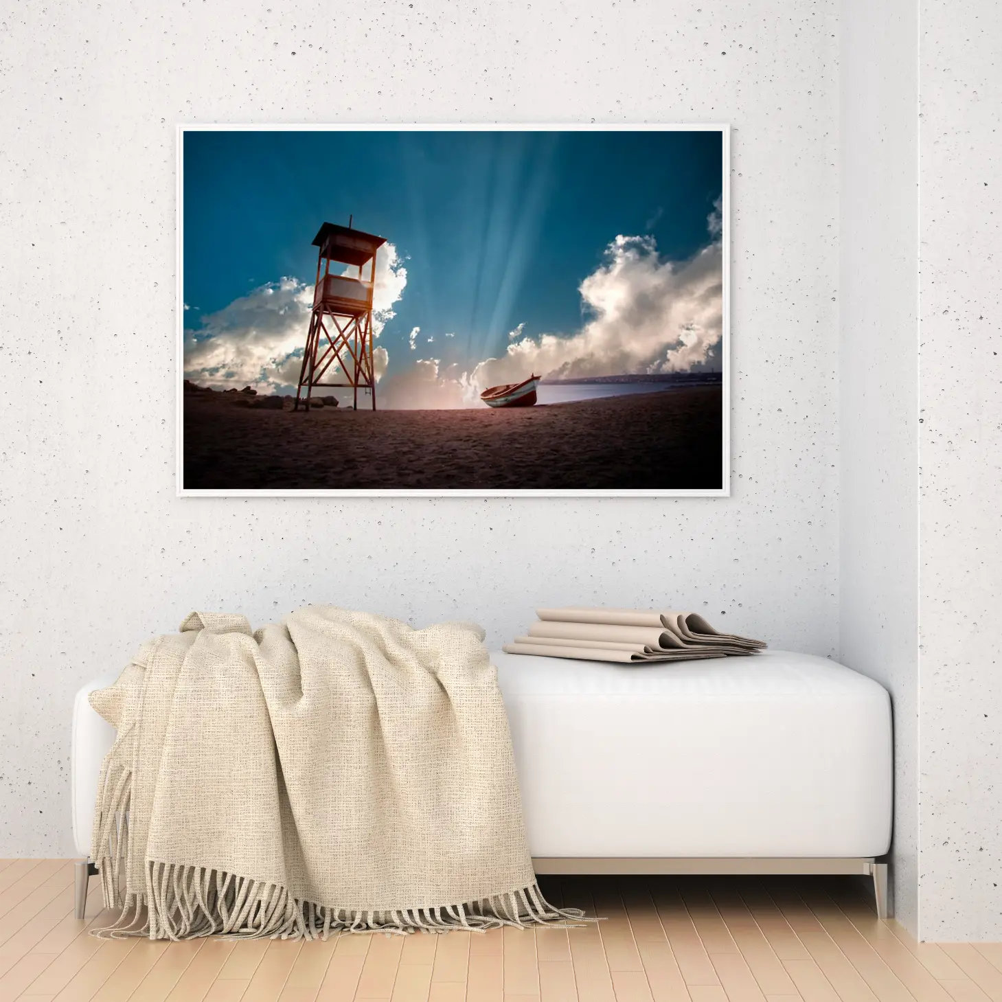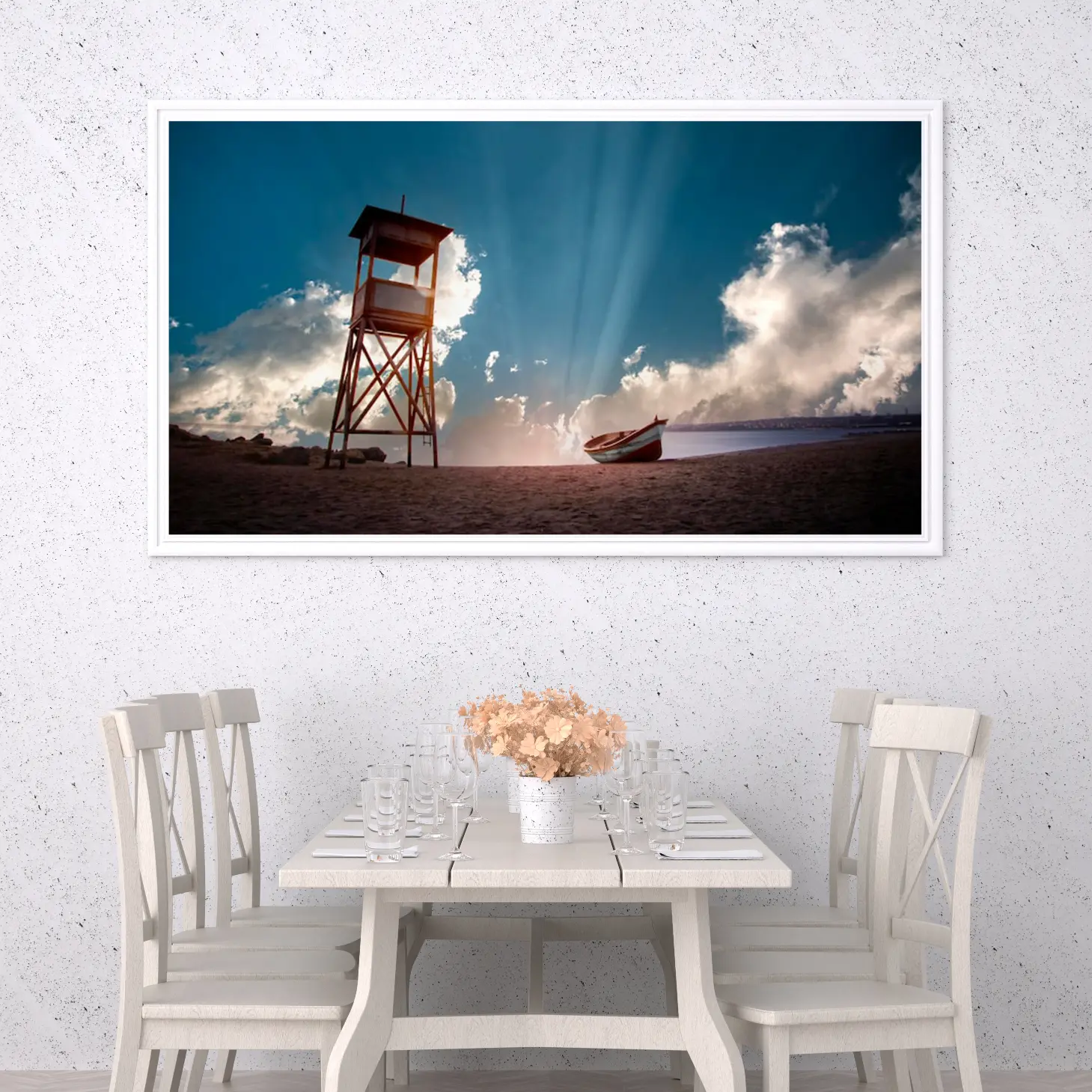 لوحات مناظر طبيعية لشاطئ هادئ مع برج مراقبة وقارب، ألوان زرقاء وبيضاء، جو مريح. لوحات فخمة، لوحات جدارية للمنزل، لوحات أنيقة.