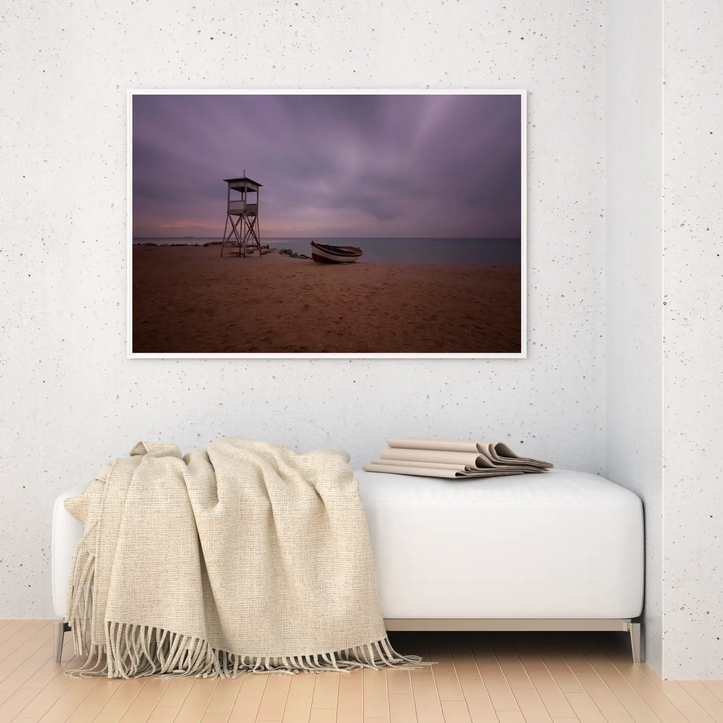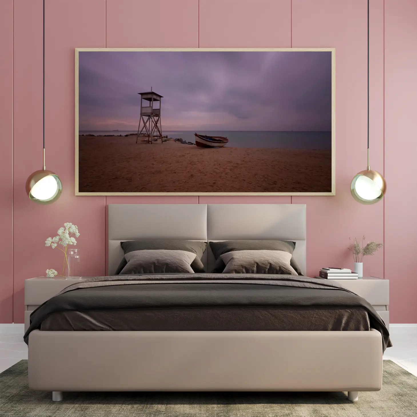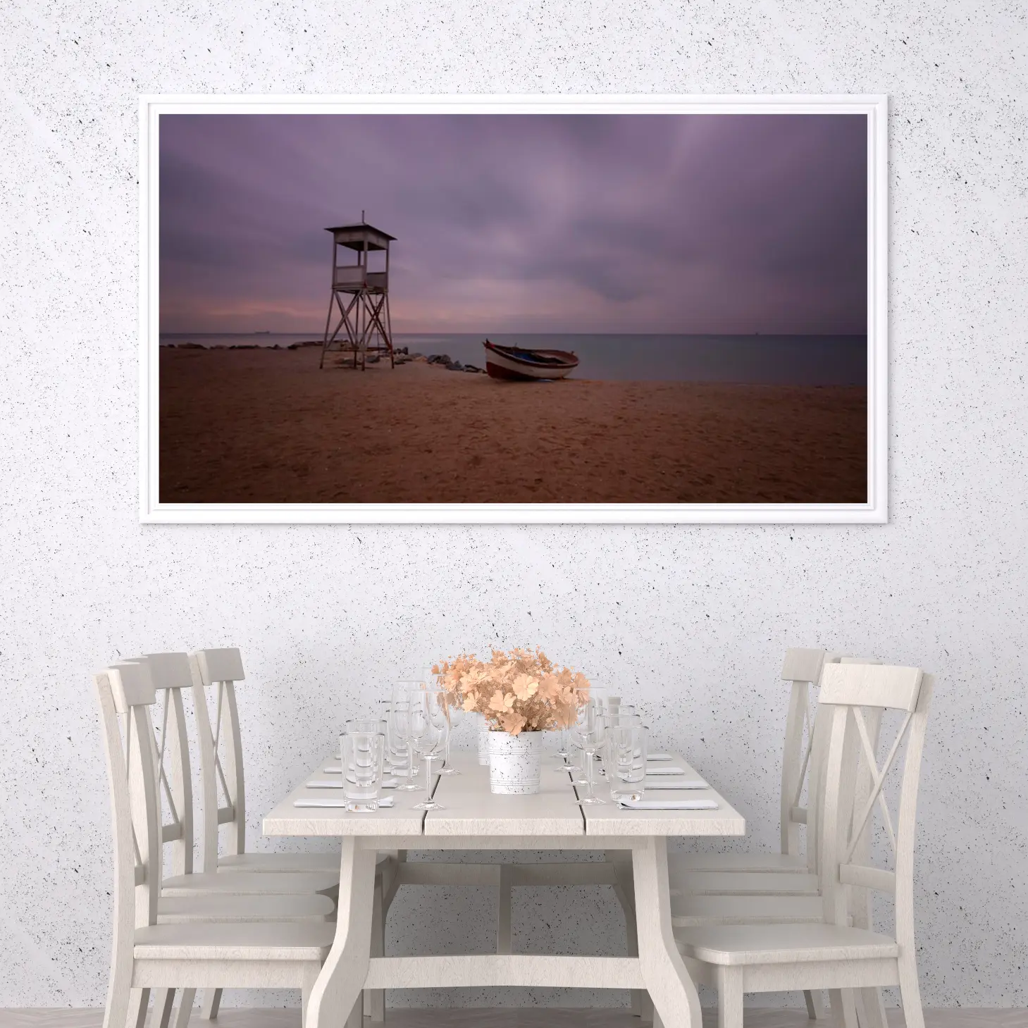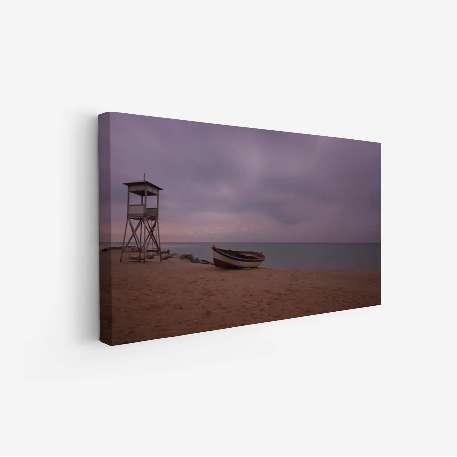 لوحات مناظر طبيعية لشاطئ هادئ مع قارب خشبي وبرج مراقبة، ألوان دافئة وسماء غائمة، لوحات فخمة، لوحات جدارية للمنزل.