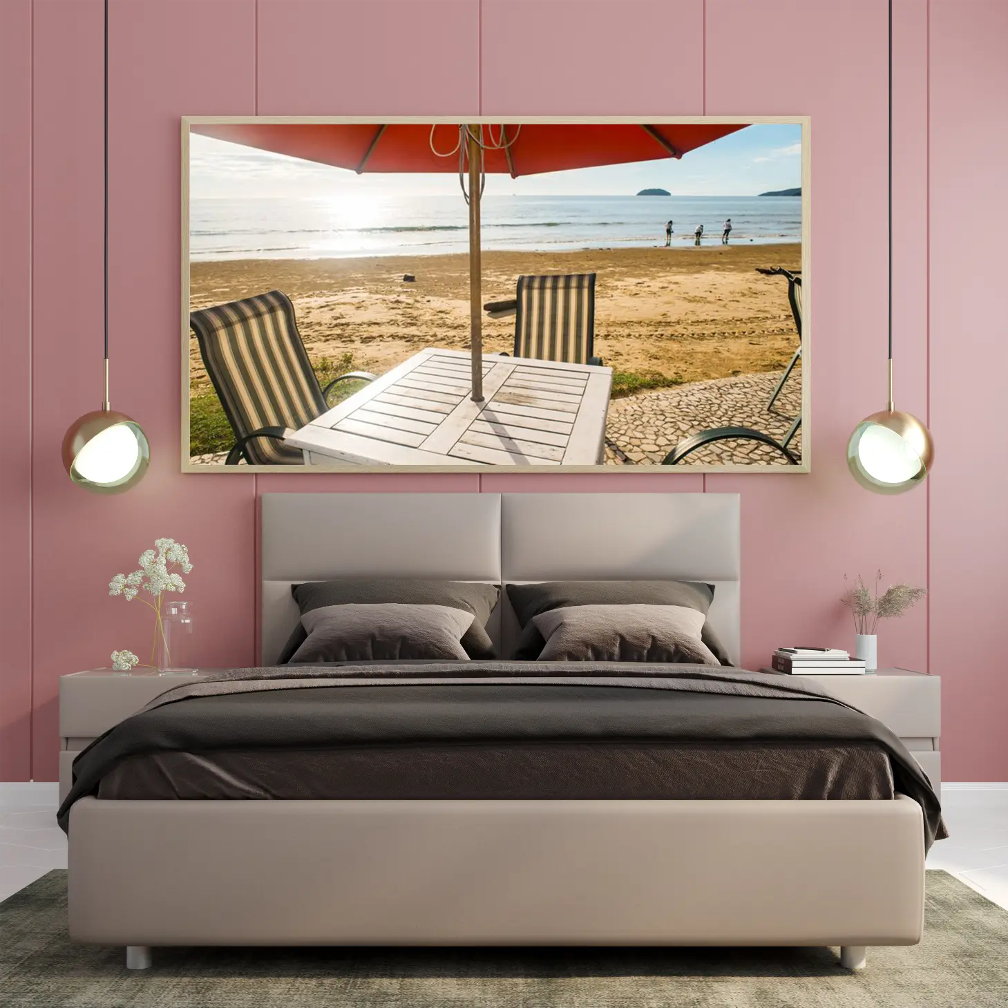 لوحات مناظر طبيعية لشاطئ هادئ مع كراسي ومظلة حمراء، ألوان دافئة وجو مريح. لوحات جدارية للمنزل، لوحات فخمة، لوحات أنيقة.