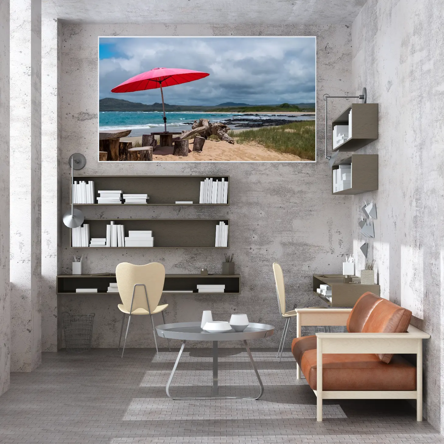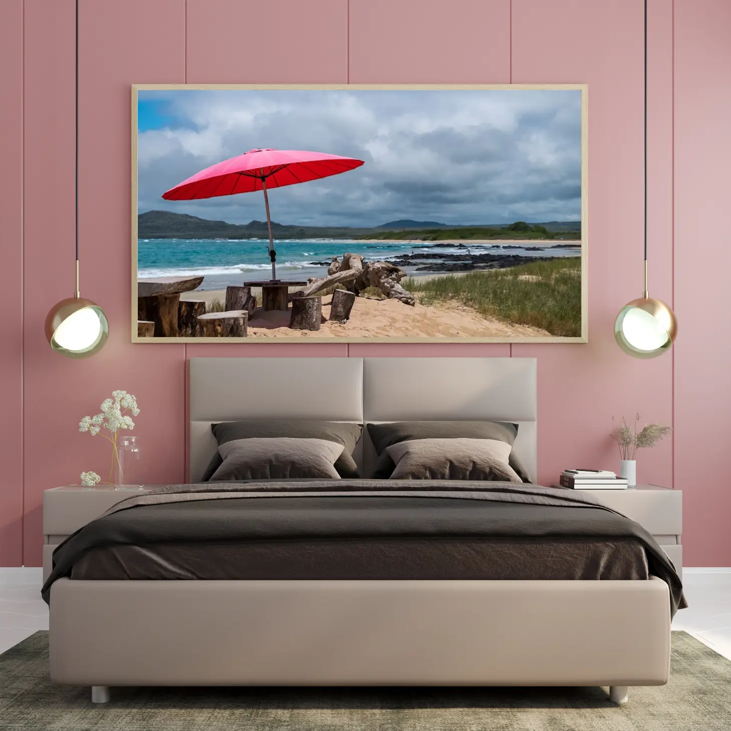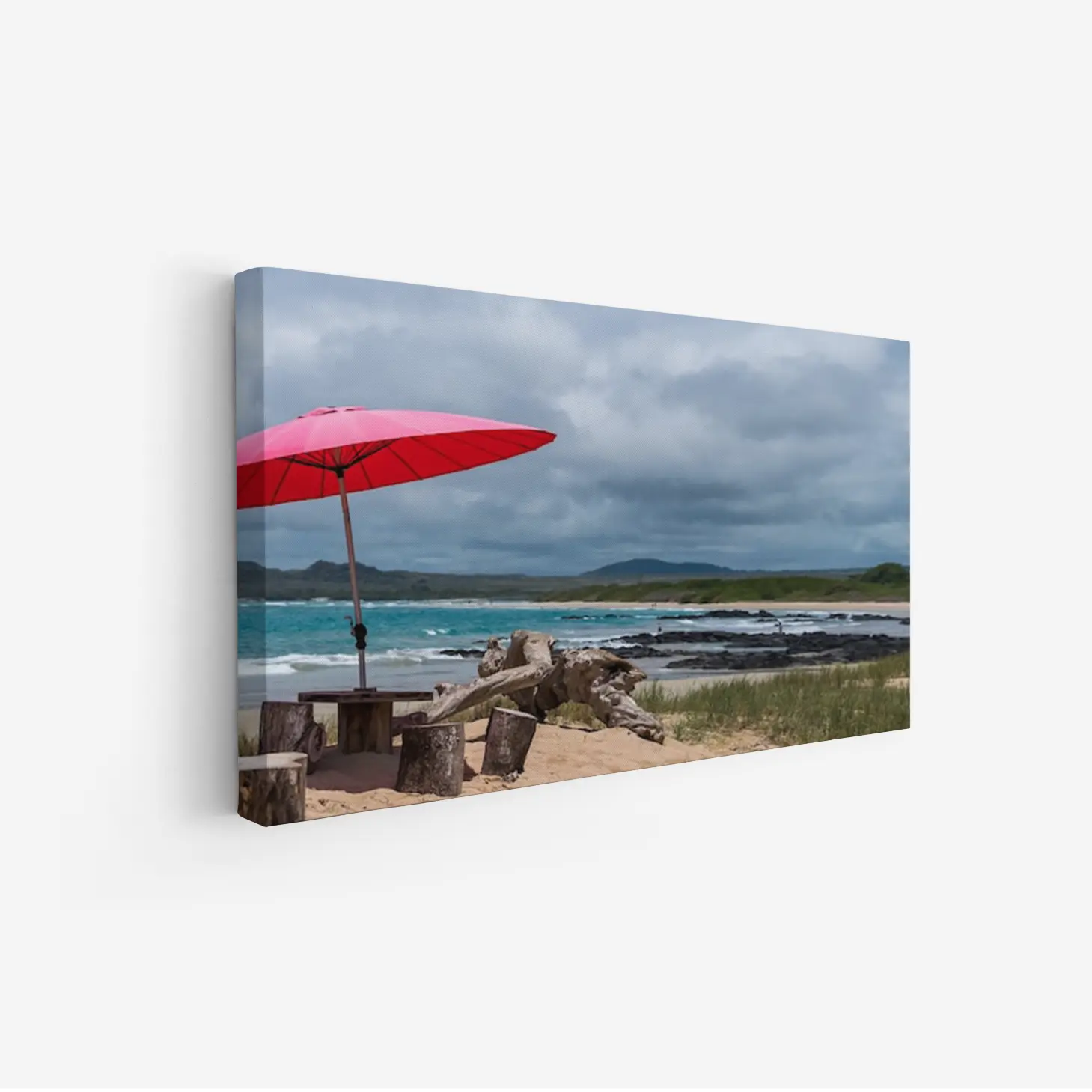 تجسد هذه اللوحات كانفاس جمال الطبيعة الخلابة، حيث تتناغم الألوان الزاهية مع المناظر الطبيعية الساحرة. يبرز في المشهد مظلة حمراء زاهية، تضفي لمسة من الحيوية على الشاطئ الهادئ، مما يجعلها نقطة جذب بصرية مثيرة. تتناغم الألوان مع تدرجات الأزرق في مياه البحر، مما يعكس شعورًا بالانتعاش والهدوء، ويجعلها مثالية كديكور جداري يضفي لمسة من الأناقة على أي مساحة.