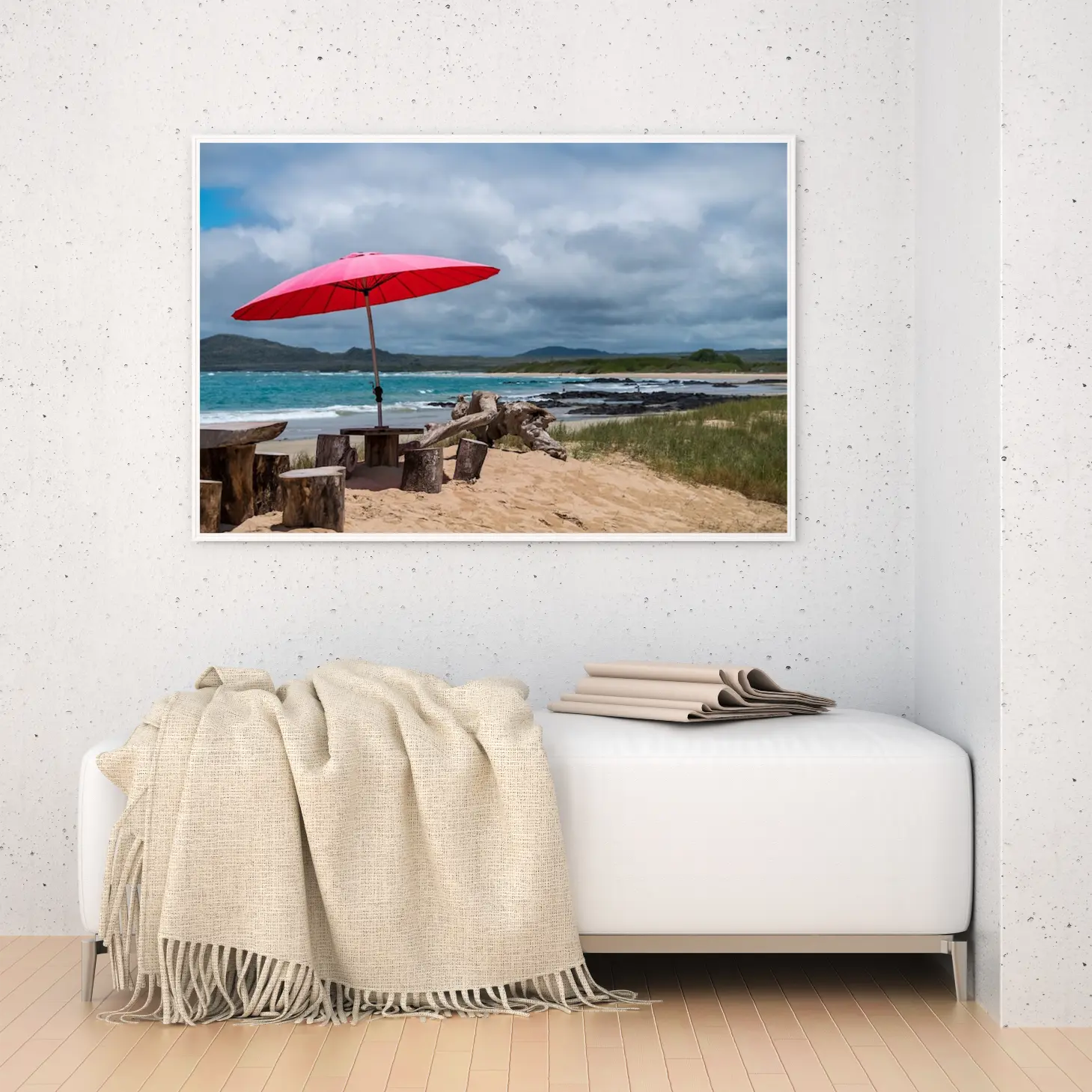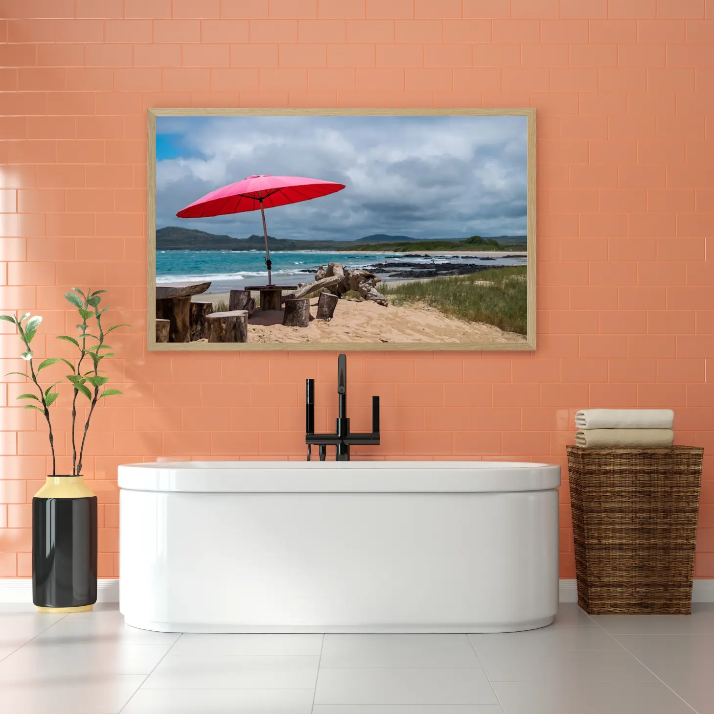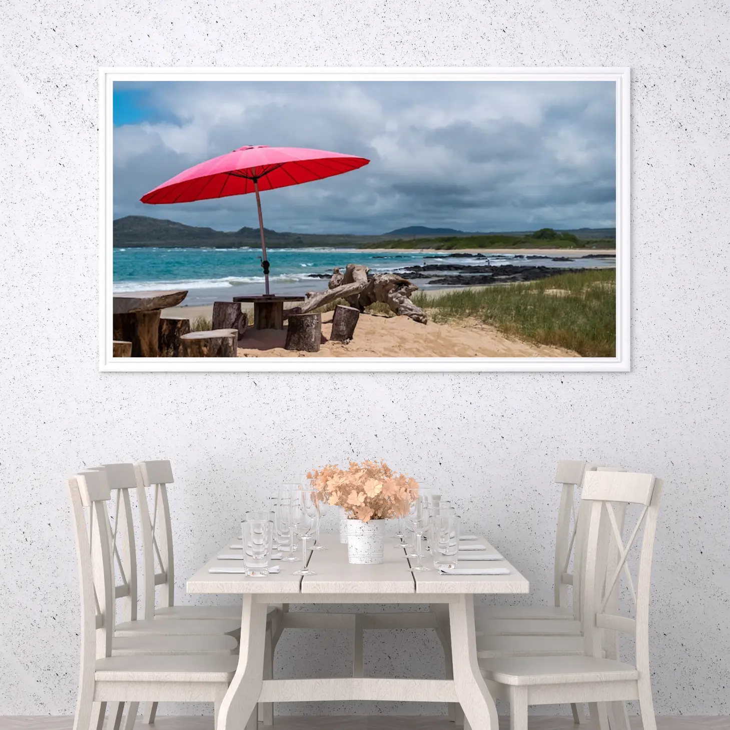 تجسد هذه اللوحات كانفاس جمال الطبيعة الخلابة، حيث تتناغم الألوان الزاهية مع المناظر الطبيعية الساحرة. يبرز في المشهد مظلة حمراء زاهية، تضفي لمسة من الحيوية على الشاطئ الهادئ، مما يجعلها نقطة جذب بصرية مثيرة. تتناغم الألوان مع تدرجات الأزرق في مياه البحر، مما يعكس شعورًا بالانتعاش والهدوء، ويجعلها مثالية كديكور جداري يضفي لمسة من الأناقة على أي مساحة.