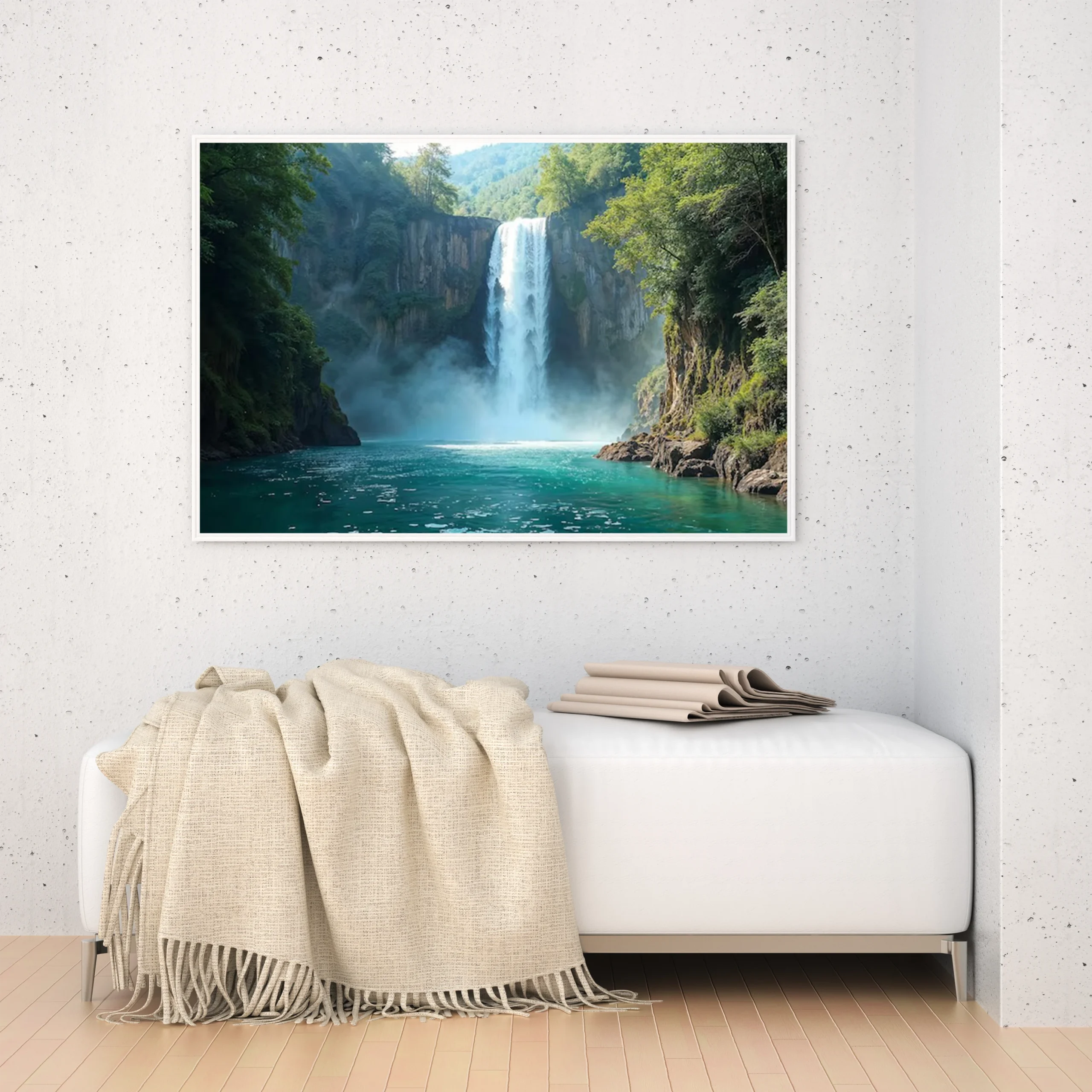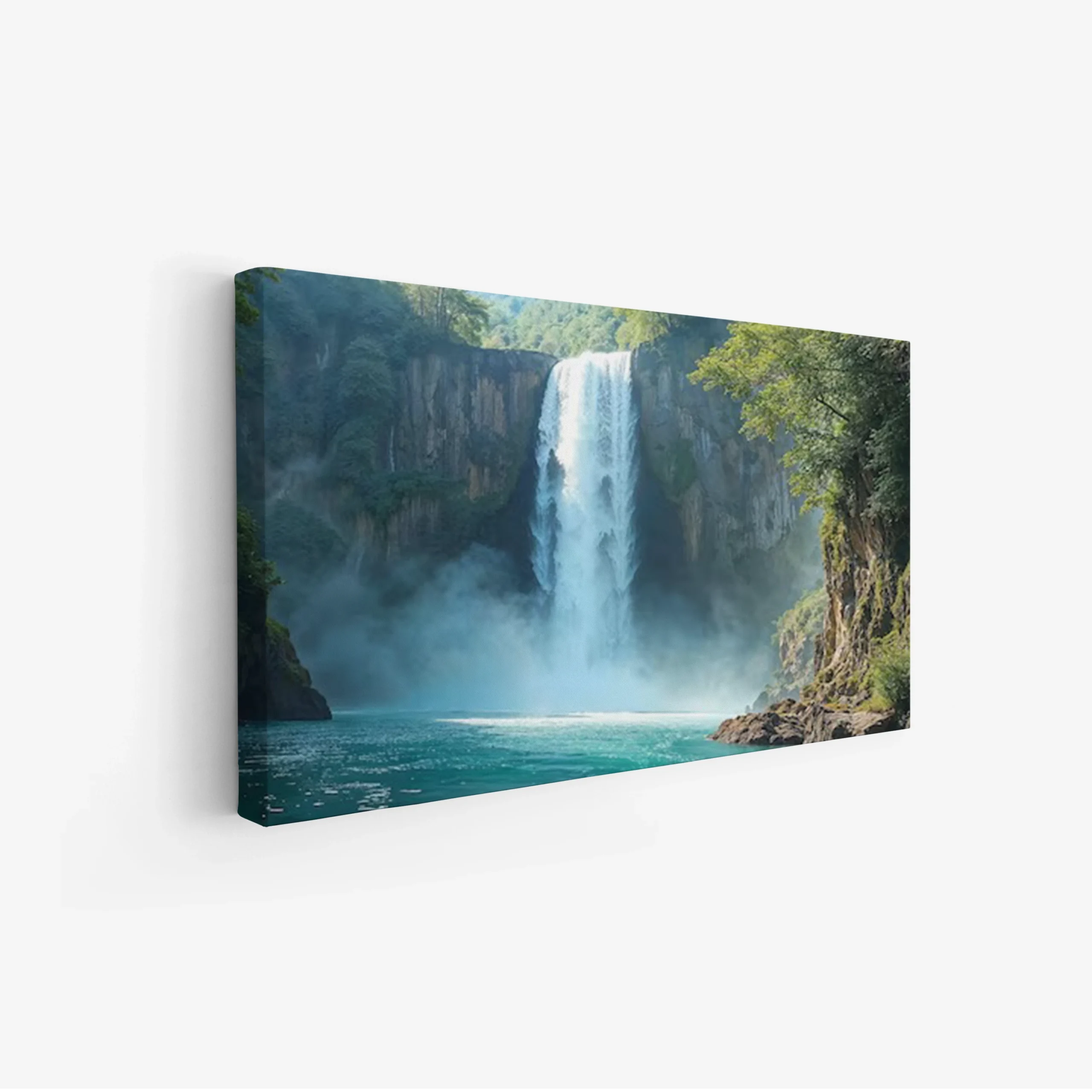 استمتع بجمال الطبيعة الخلابة مع هذه اللوحة التي تجسد شلالًا رائعًا يتدفق بين أحضان الجبال الخضراء. الألوان الزاهية والمياه الفيروزية تضفي لمسة من السكينة والهدوء على أي مساحة، مما يجعلها الخيار المثالي لإضافة لمسة فنية مميزة إلى منزلك.