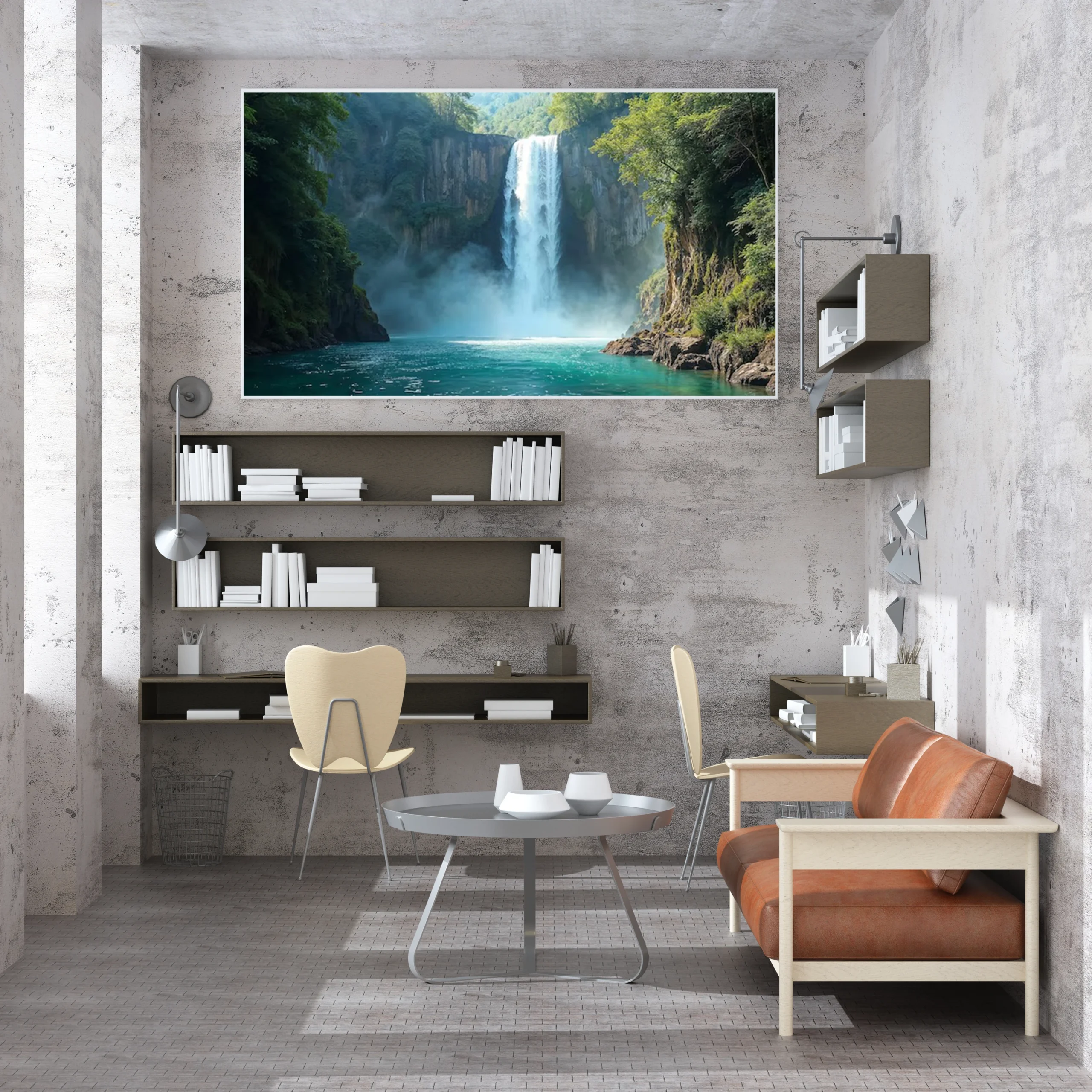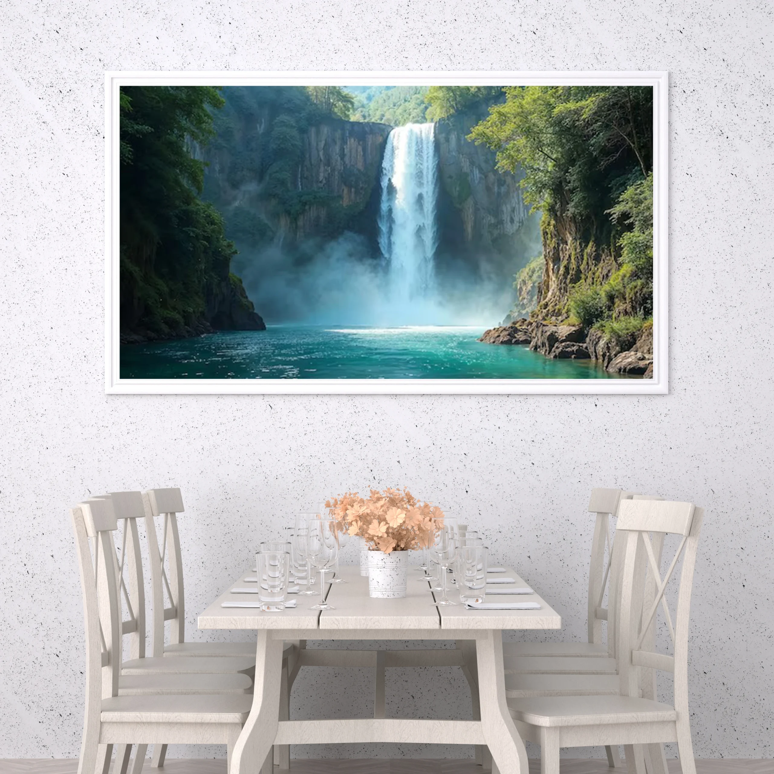 استمتع بجمال الطبيعة الخلابة مع هذه اللوحة الفنية التي تجسد شلالاً رائعاً محاطاً بالخضرة. تضفي الألوان الزاهية والحركة الديناميكية للمياه لمسة من الحيوية على أي مساحة، مما يجعلها خياراً مثالياً لإثراء ديكور منزلك أو مكتبك.