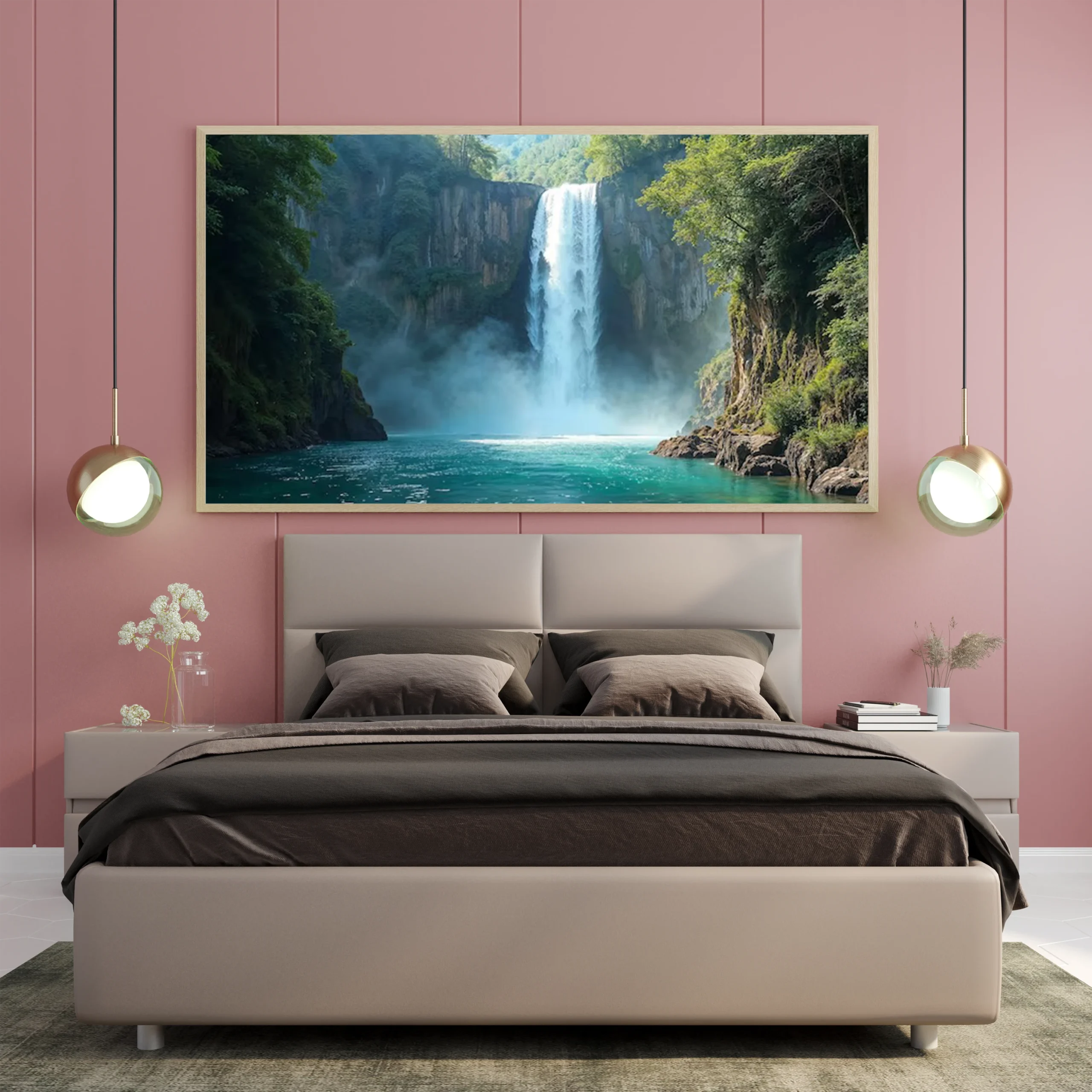 لوحات مناظر طبيعية لشلالات رائعة تحيط بها غابات خضراء ومياه زرقاء صافية، جو هادئ ومريح. لوحات فنية عصرية، لوحات جدارية للمنزل، لوحات أنيقة.