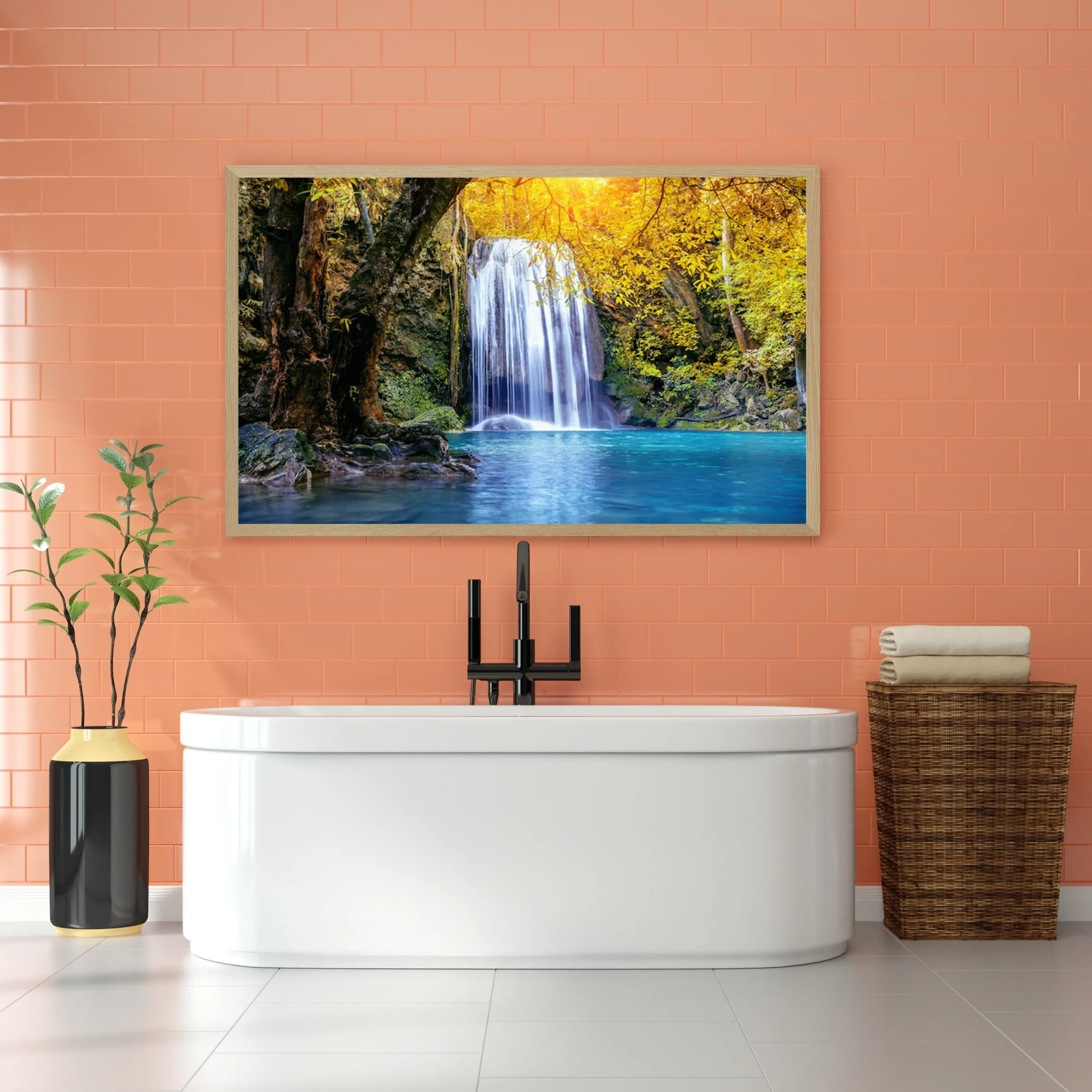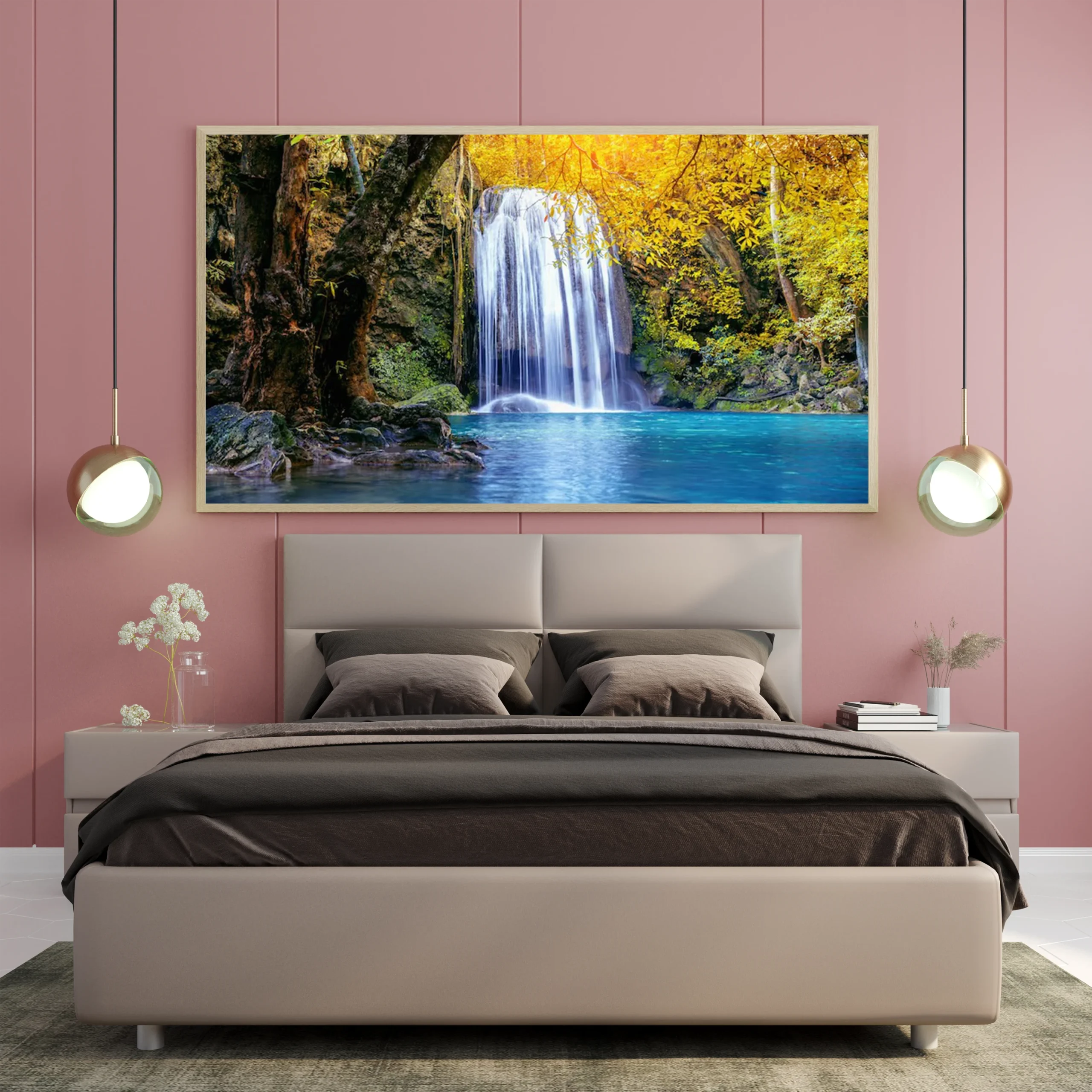 لوحات مناظر طبيعية لشلالات مائية محاطة بأشجار خضراء وألوان دافئة، جو هادئ ومريح. لوحات فنية عصرية، لوحات جدارية للمنزل، لوحات أنيقة.