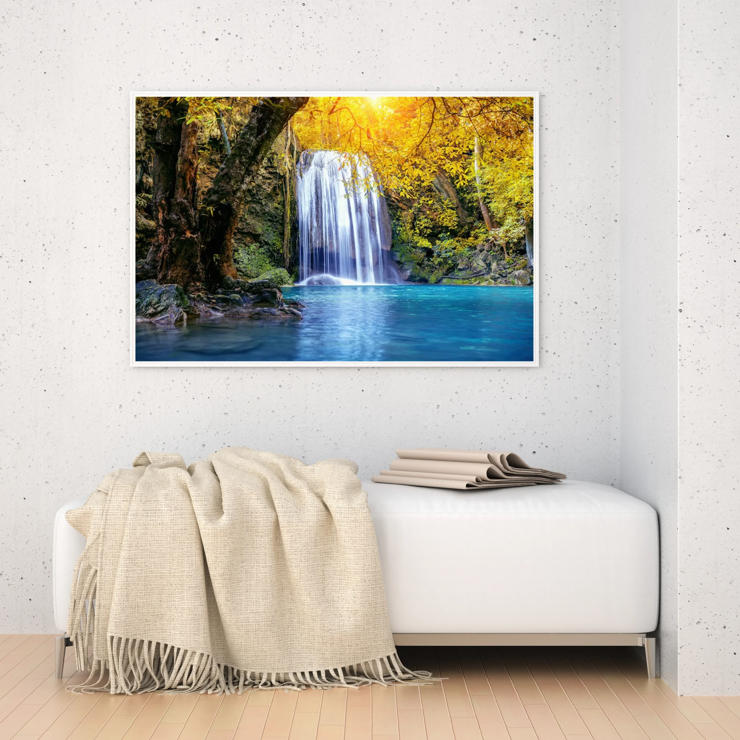 تجسد هذه اللوحات كانفاس جمال الطبيعة الخلابة، حيث تتدفق المياه من شلال رائع محاط بأشجار خضراء وأوراق صفراء تتلألأ تحت أشعة الشمس. تعكس الألوان الزاهية والمشرقة إحساسًا بالهدوء والسكينة، مما يجعلها خيارًا مثاليًا لإضفاء لمسة من الحيوية على أي مساحة داخلية. إن تباين الألوان بين الأزرق العميق للمياه والذهبي للأوراق يخلق تناغمًا بصريًا يجذب الأنظار ويعزز من جمالية الديكور المنزلي.