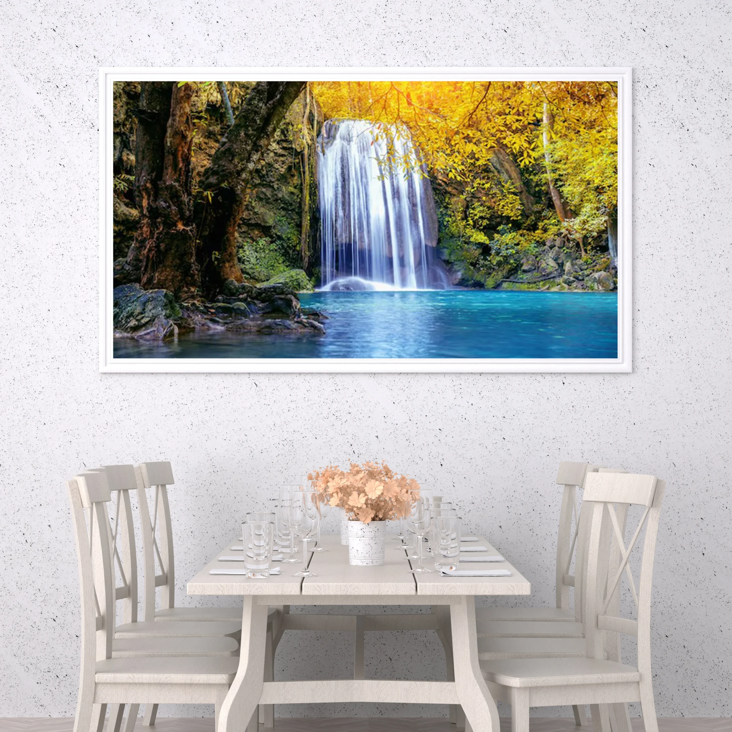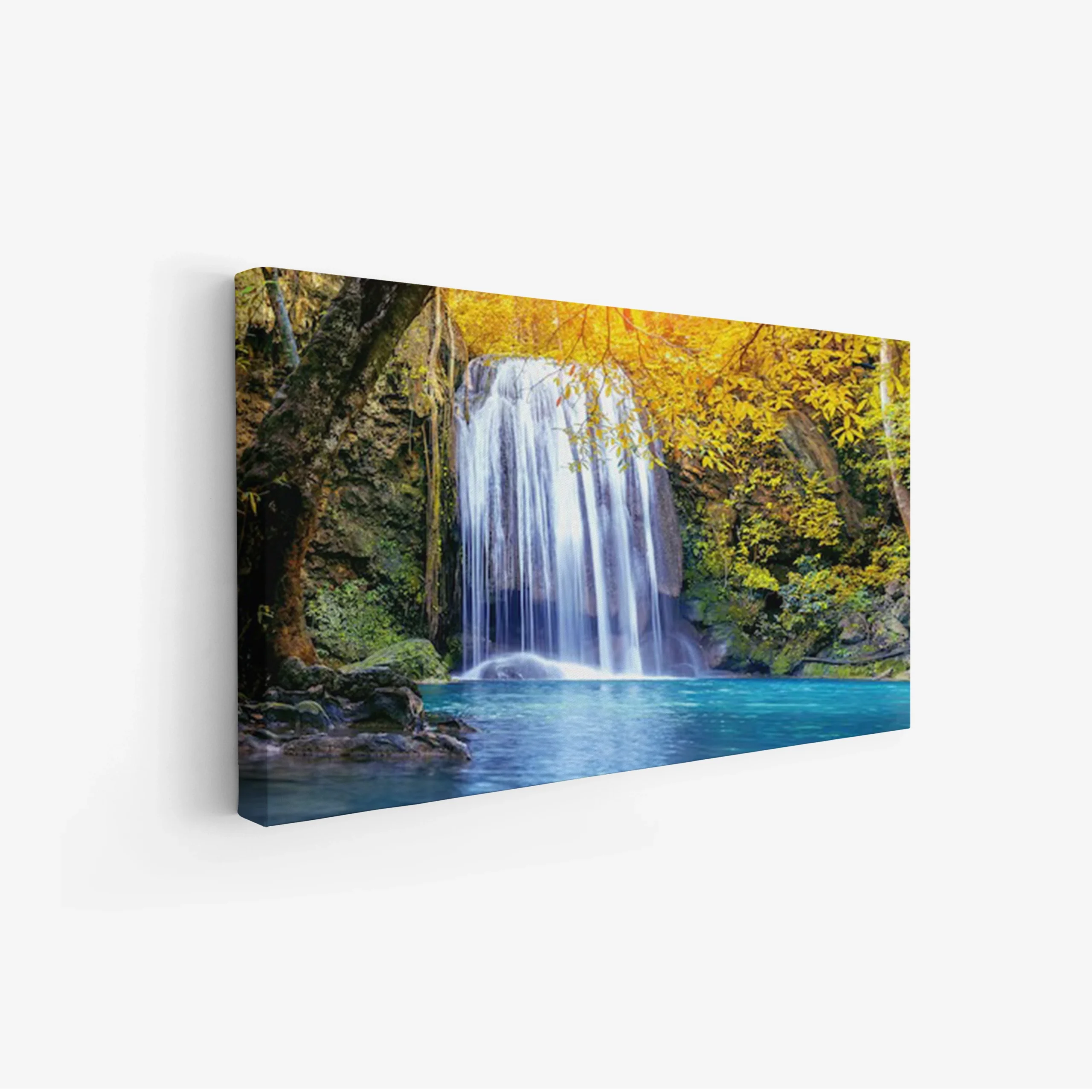 تجسد هذه اللوحات كانفاس جمال الطبيعة الخلابة، حيث تتدفق المياه من شلال رائع، محاطة بأشجار خضراء وأوراق صفراء تتلألأ تحت أشعة الشمس. تعكس الألوان الزاهية في هذا العمل الفني روح الحياة، مما يجعله خيارًا مثاليًا لإضفاء لمسة من الحيوية على أي مساحة داخلية. إن تدرجات الأزرق في المياه تعزز الشعور بالهدوء والسكينة، مما يجعلها مثالية لتزيين الجدران في المنازل أو المكاتب.
