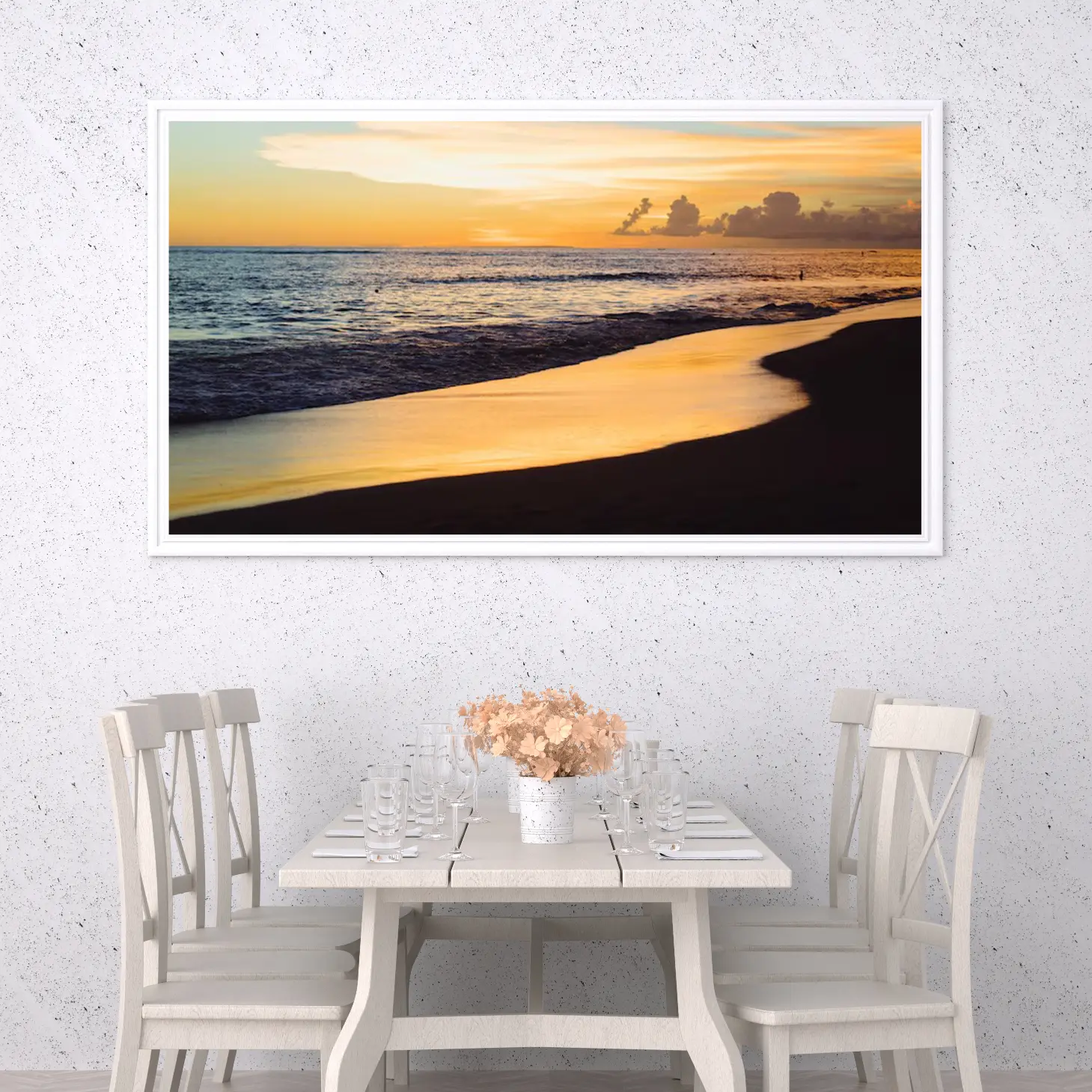تتميز هذه القطعة الفنية بتفاصيل دقيقة تعكس حركة الأمواج وتفاعلها مع ضوء الشمس الغارب. يمكن للمرء أن يشعر وكأنه يخطو على الشاطئ، حيث تلامس الأمواج الرمل الدافئ. هذا الشعور بالانغماس في الطبيعة يجعلها إضافة مثالية لأي ديكور منزلي، حيث تضفي لمسة من الانتعاش والحيوية.