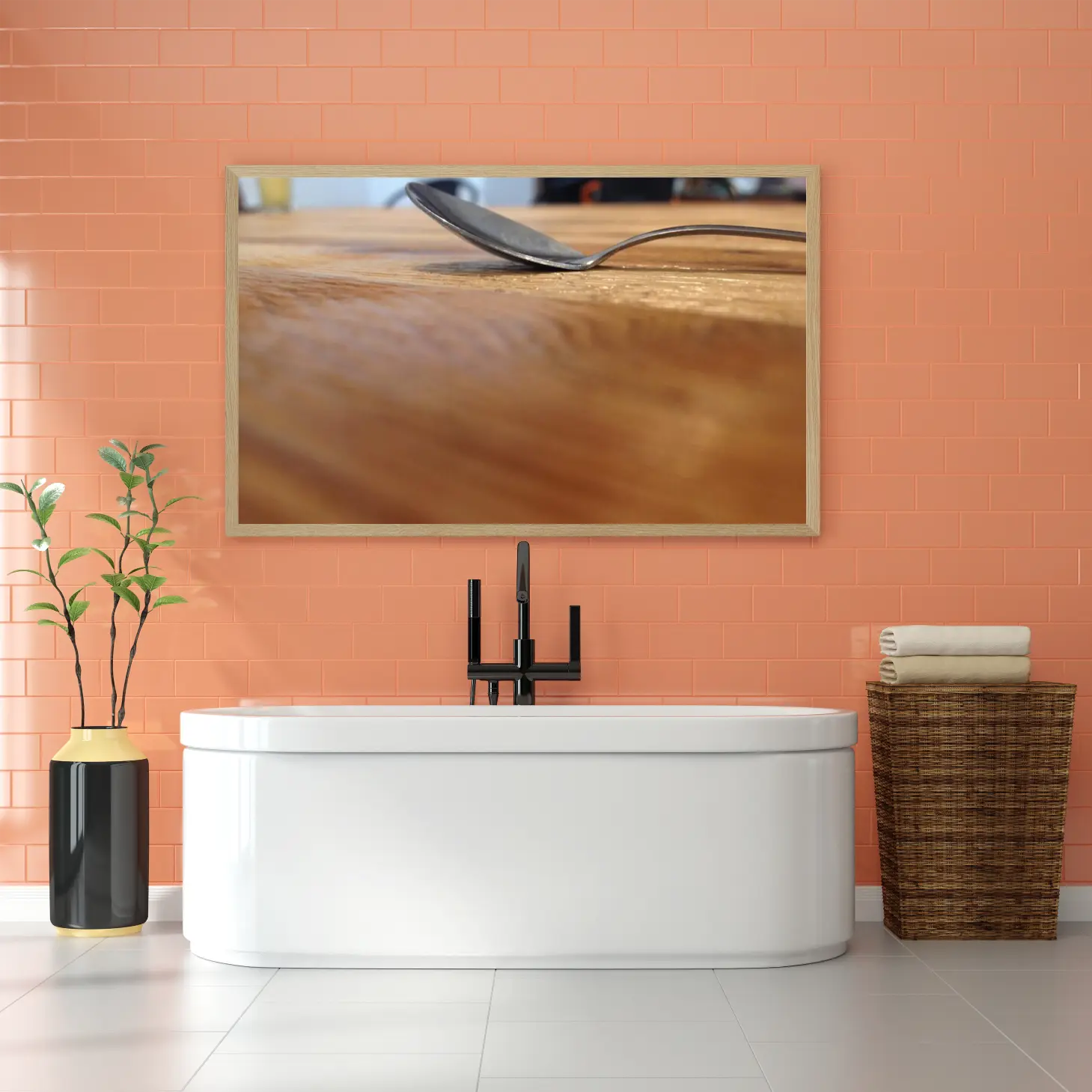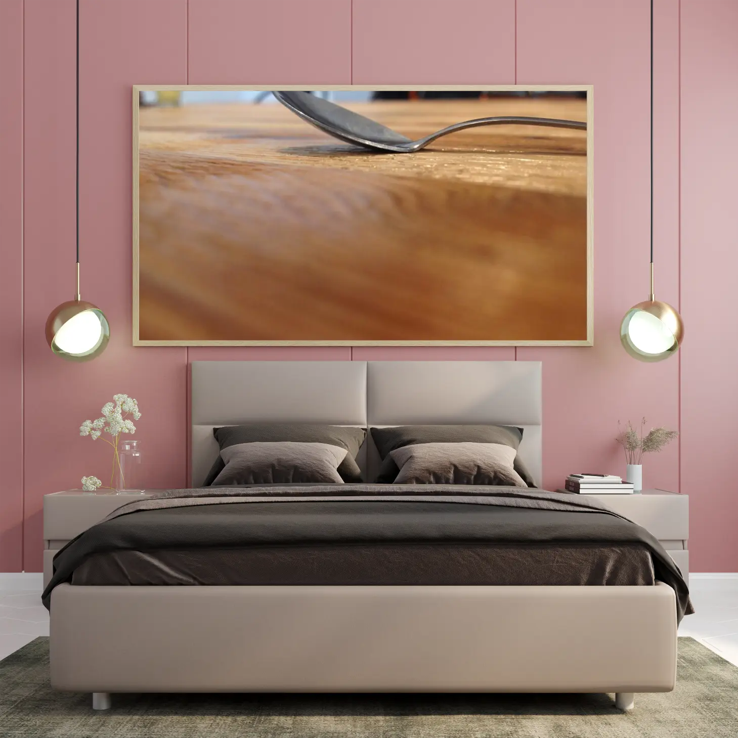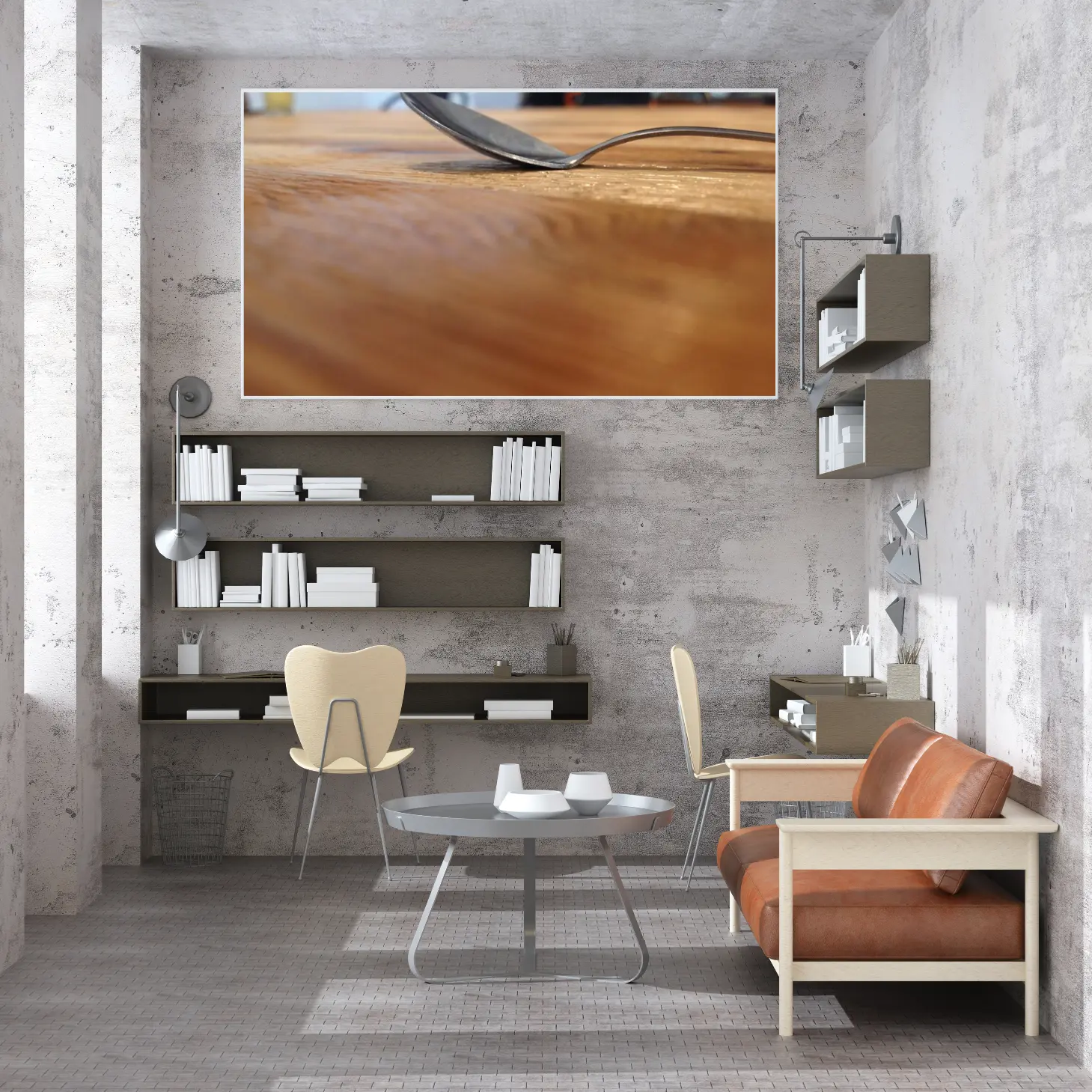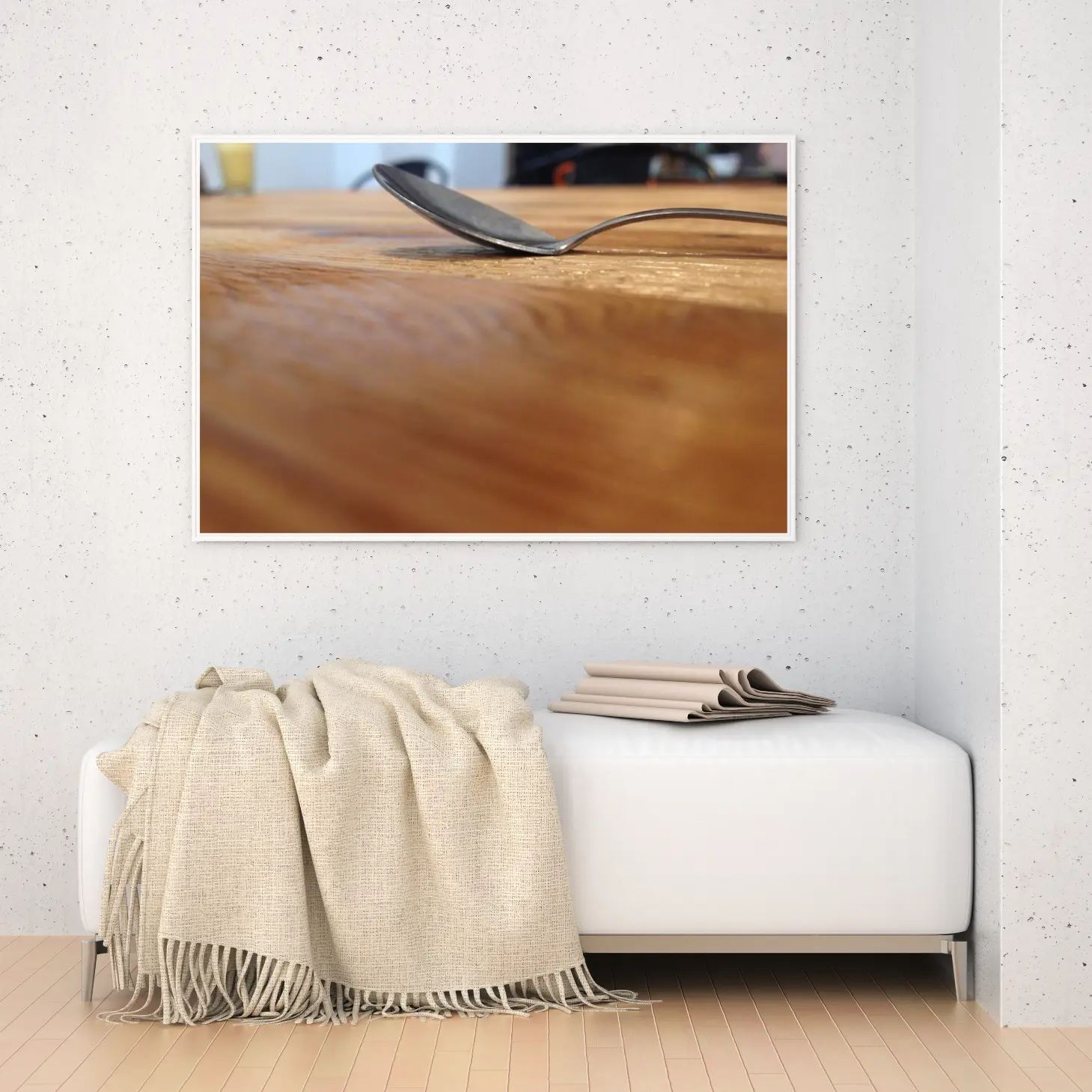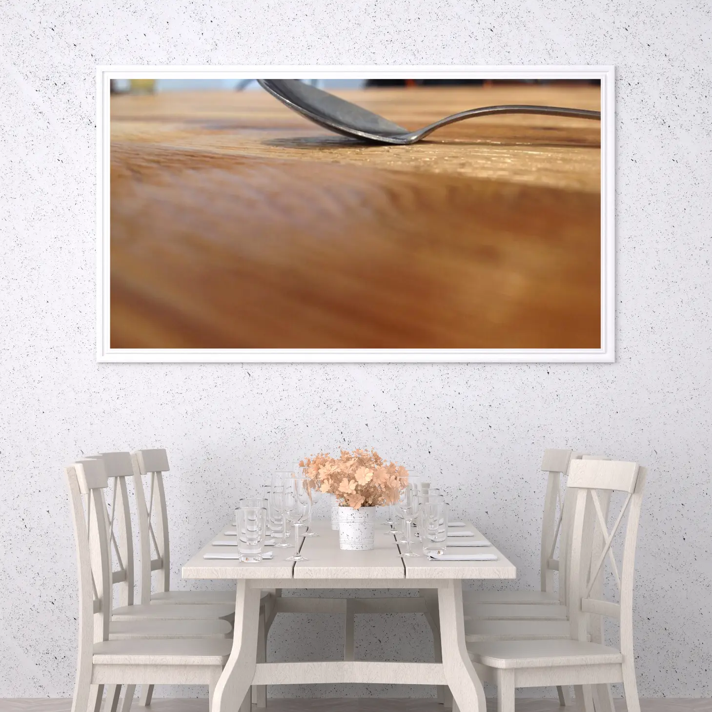 تتجلى في هذه اللوحة جماليات الحياة اليومية، حيث يلتقي الفن بالبساطة في مشهد يعكس لحظة عابرة من الروتين اليومي. يظهر في الصورة ملعقة معدنية تتكئ برفق على سطح خشبي، مما يضفي إحساسًا بالدفء والراحة. هذا المشهد البسيط يخلق أجواءً مريحة، ويعزز من نمط الحياة العصري الذي يقدّر التفاصيل الصغيرة ويحتفي بها، مما يجعلها إضافة مثالية لأي مساحة.