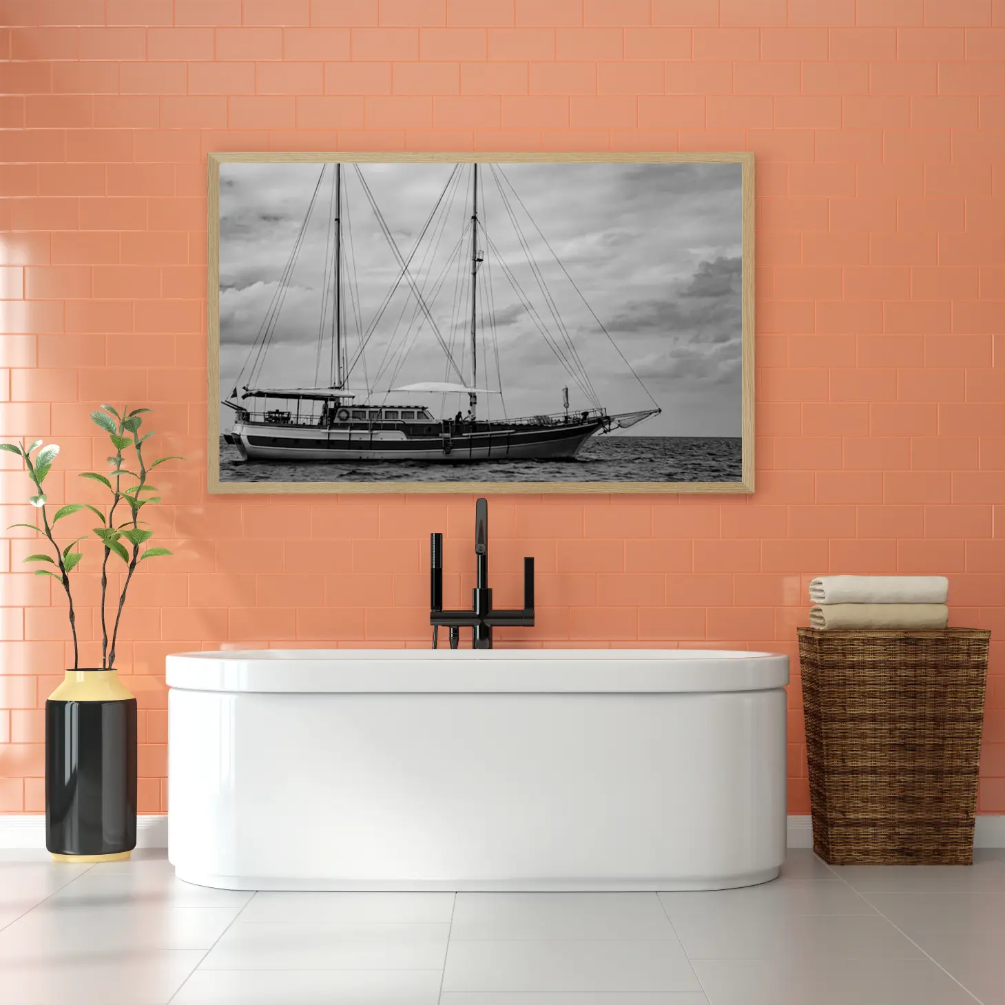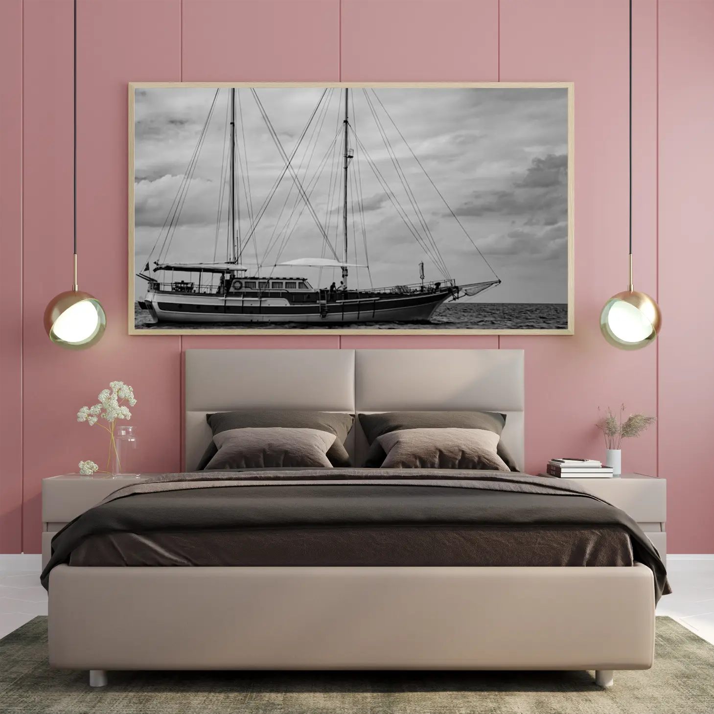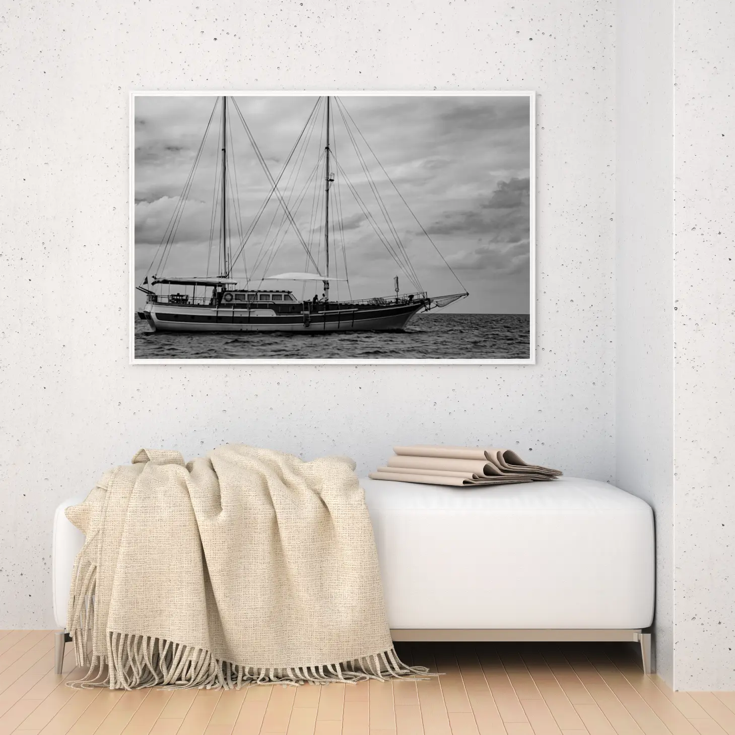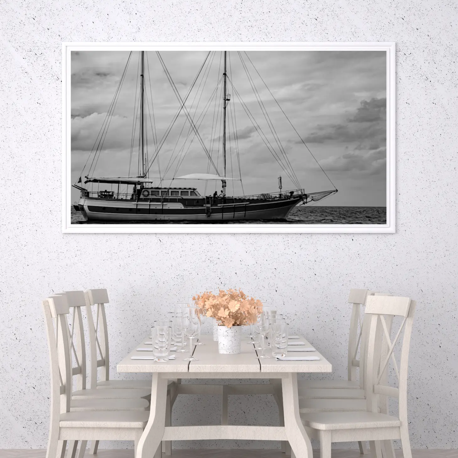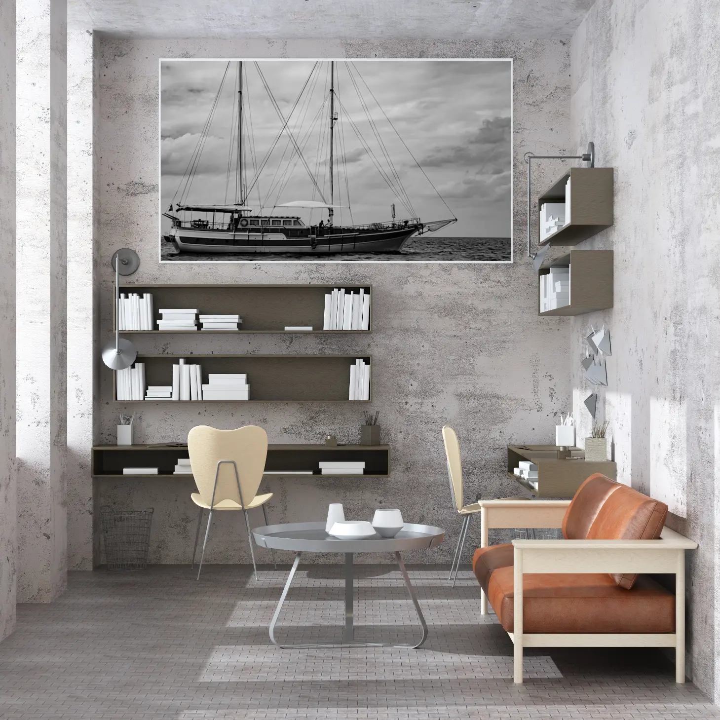 لوحة بحرية بتدرجات الرمادي، تظهر قاربًا بأشرعة مرتفعة تحت سماء غائمة، تعكس أجواء هادئة، لوحات مناظر طبيعية، لوحات كانفاس.