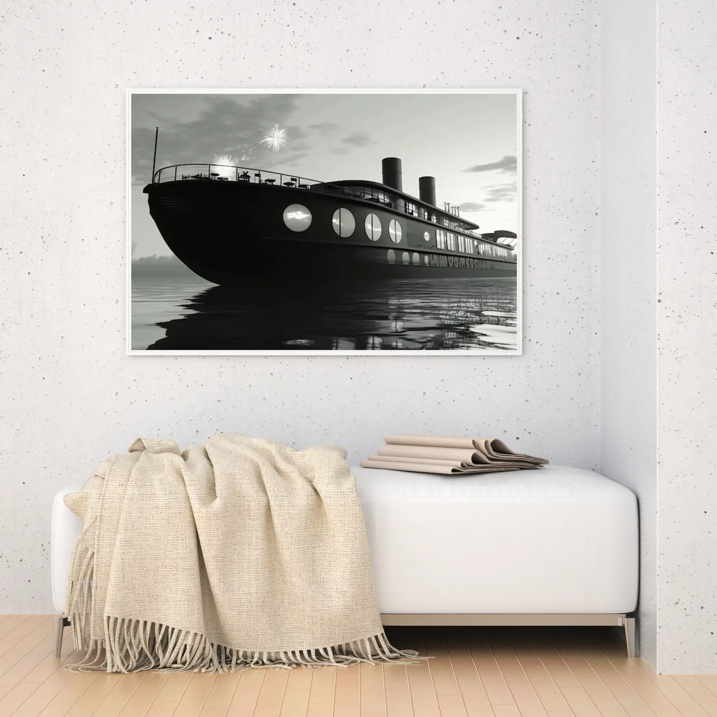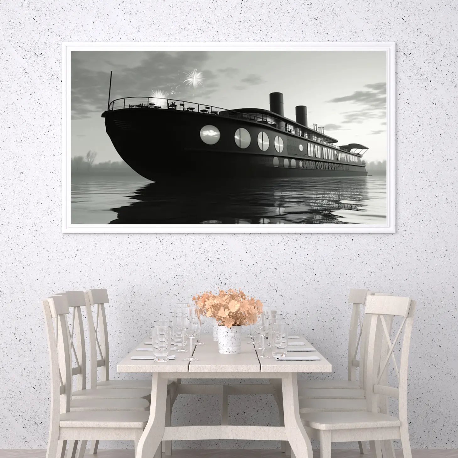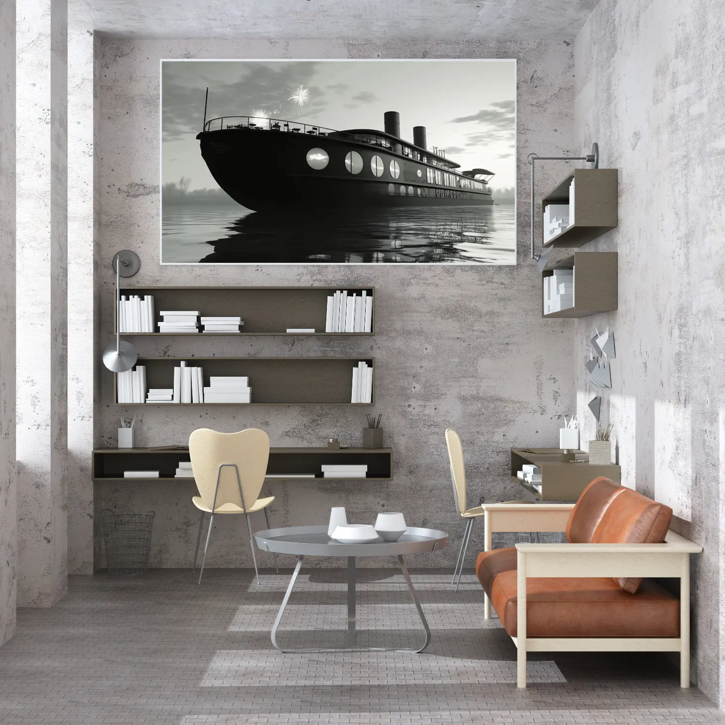 تجسد هذه اللوحة الفنية مشهدًا مهيبًا يجمع بين الأناقة والعمق، حيث يظهر قارب فاخر يطفو برشاقة على سطح الماء، محاطًا بأجواء ساحرة تعكس جمال الطبيعة. تبرز التفاصيل الدقيقة في التصميم، مما يخلق تأثيرًا بصريًا يجذب الأنظار ويضفي لمسة من الفخامة على أي مساحة. إن الألوان المتناغمة، رغم كونها بالأبيض والأسود، تعكس تباينًا رائعًا يضفي عمقًا على اللوحة، مما يجعلها خيارًا مثاليًا لإضفاء جو من الرقي والهدوء على المكان.