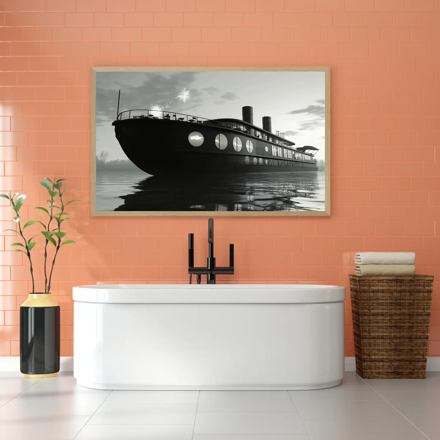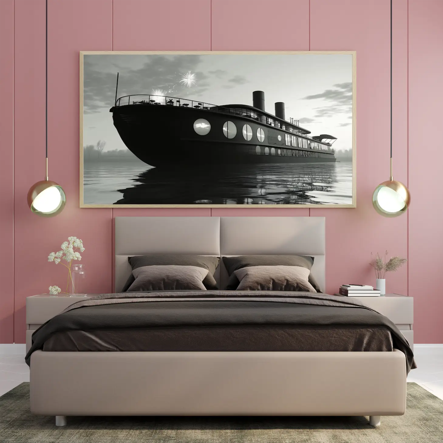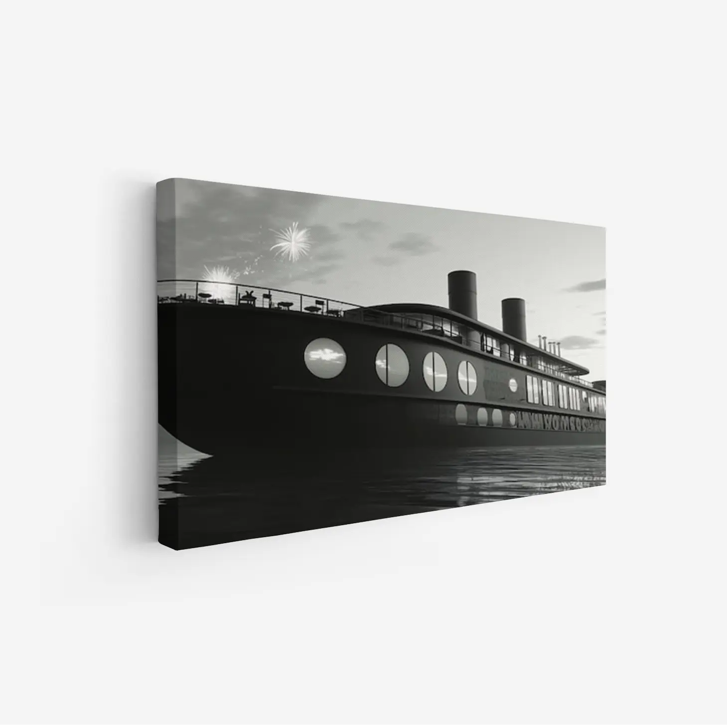 تجسد هذه اللوحة الفنية مشهدًا مهيبًا يجمع بين الأناقة والعمق، حيث يظهر قارب فاخر يطفو برشاقة على سطح الماء، محاطًا بأجواء ساحرة تعكس جمال الطبيعة. تبرز التفاصيل الدقيقة في التصميم، مما يخلق تأثيرًا بصريًا يجذب الأنظار ويضفي لمسة من الفخامة على أي مساحة. إن الألوان المتناغمة، رغم كونها بالأبيض والأسود، تعكس تباينًا رائعًا يضفي عمقًا على اللوحة، مما يجعلها خيارًا مثاليًا لإضفاء جو من الرقي والهدوء على المكان.