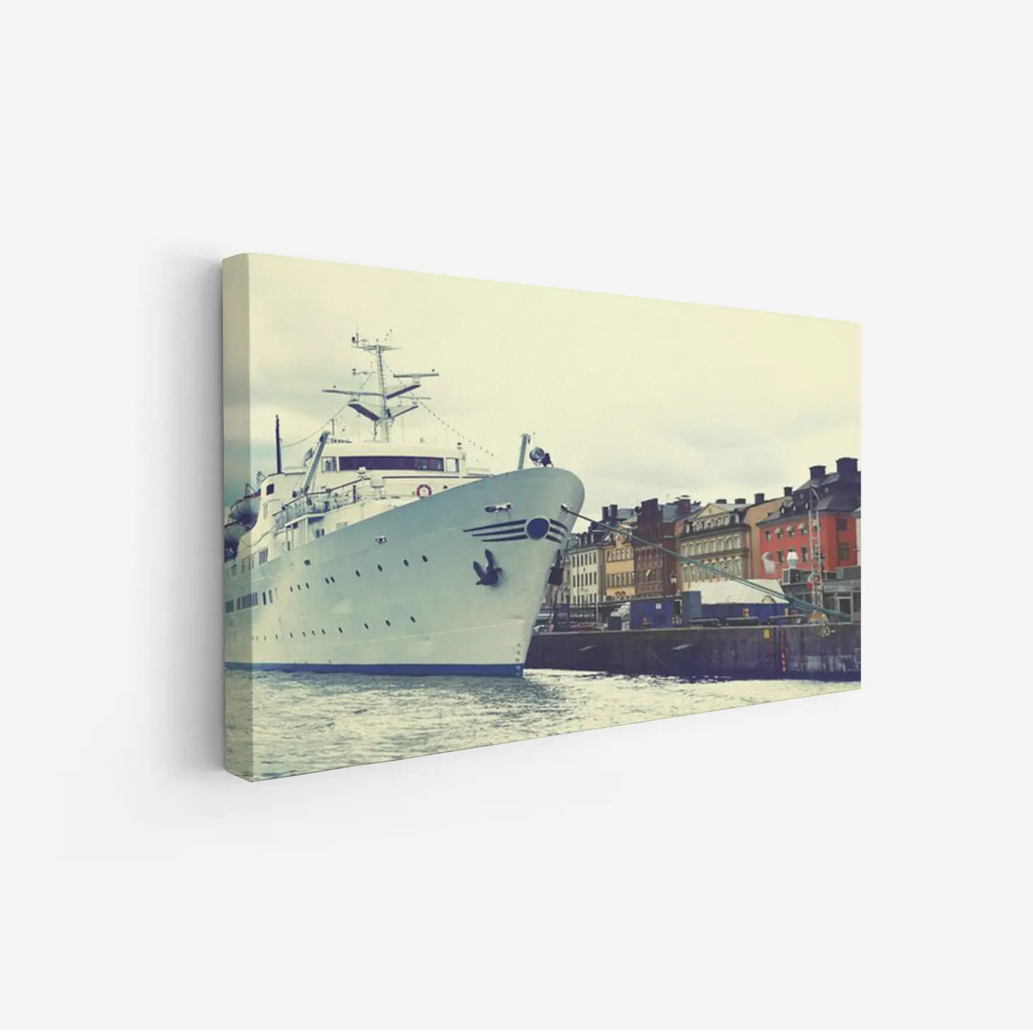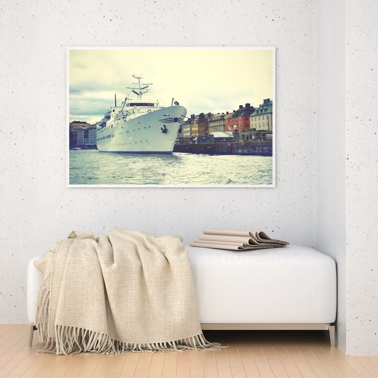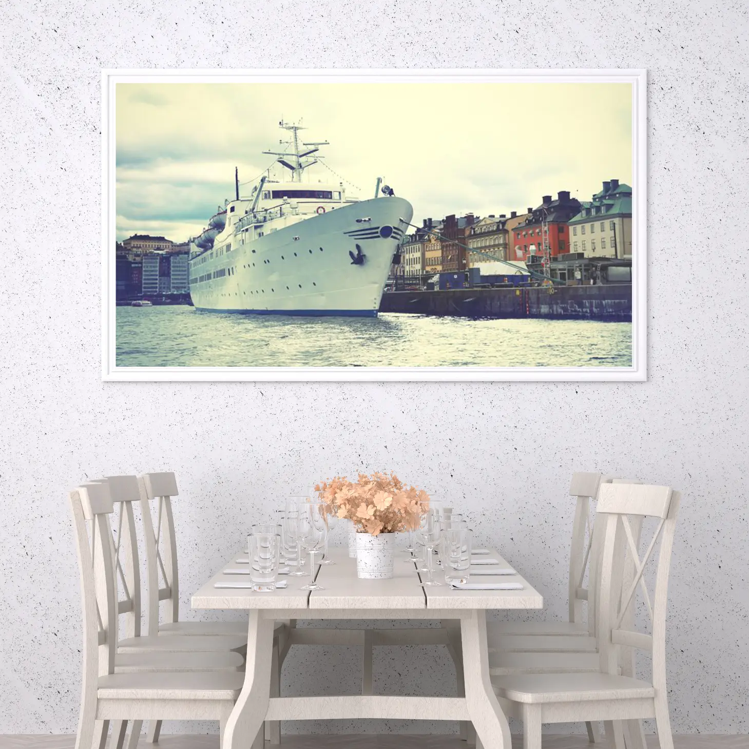 لوحة بحرية بسفينة بيضاء تبحر في مياه هادئة مع مباني ملونة في الخلفية، لوحات مناظر طبيعية، لوحات كانفاس.