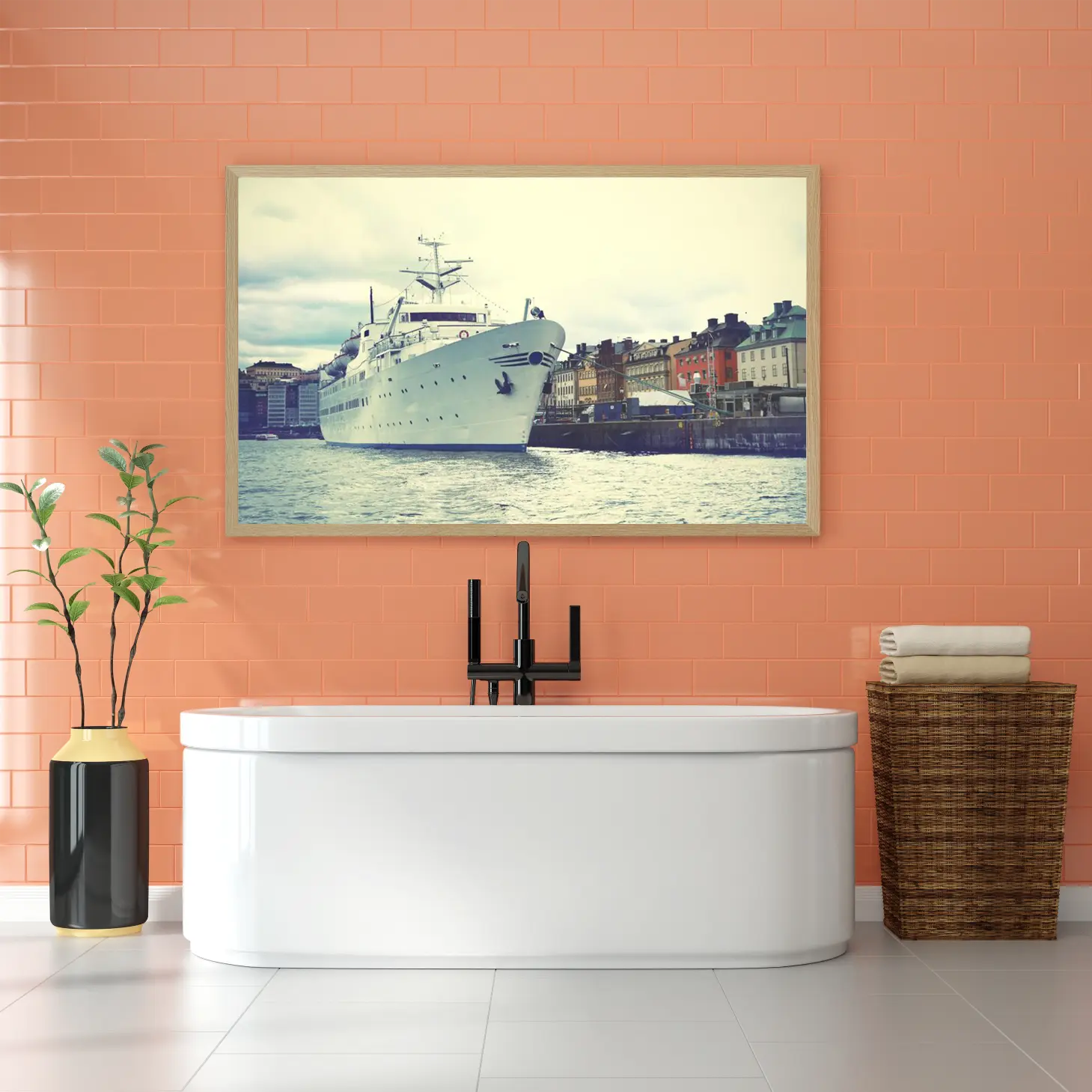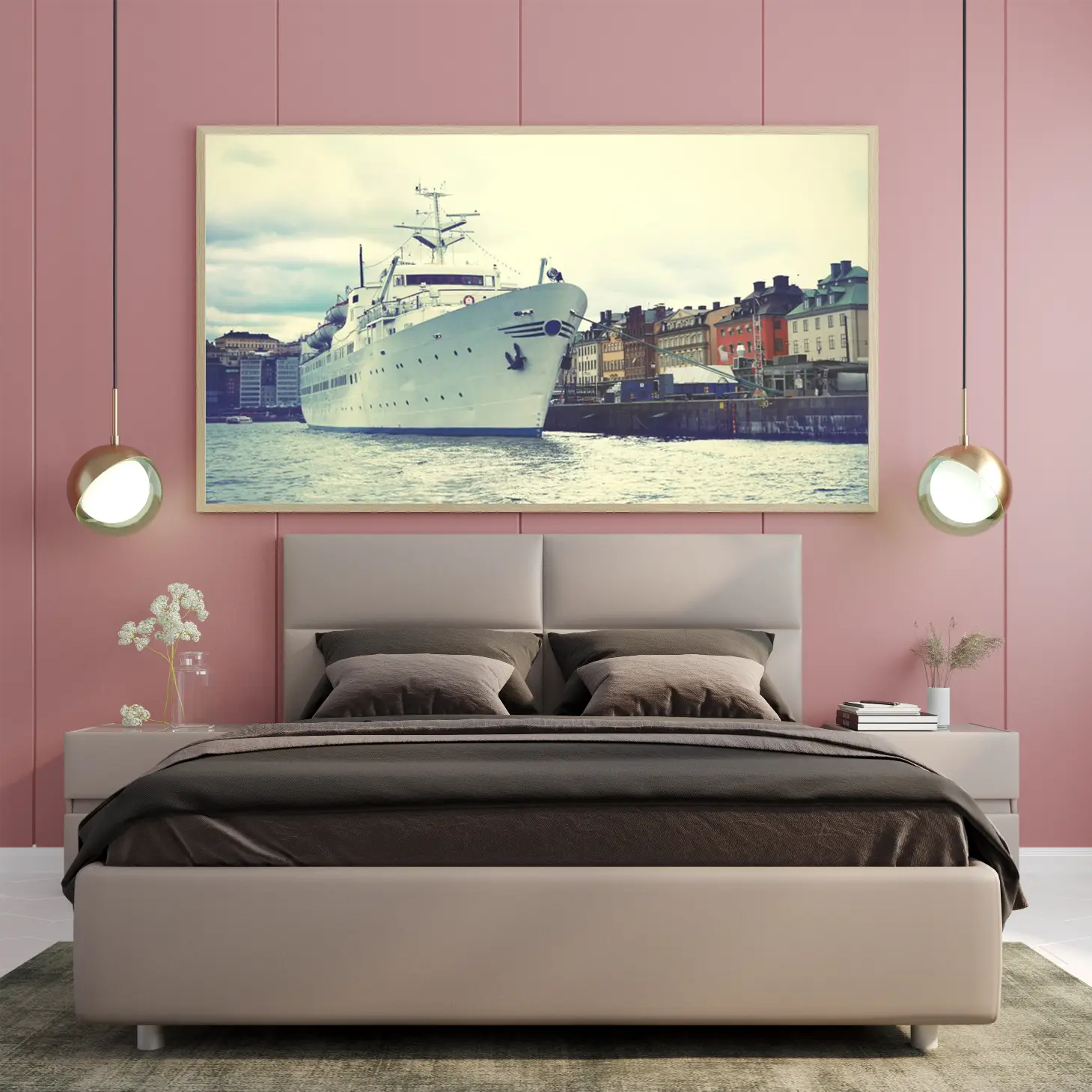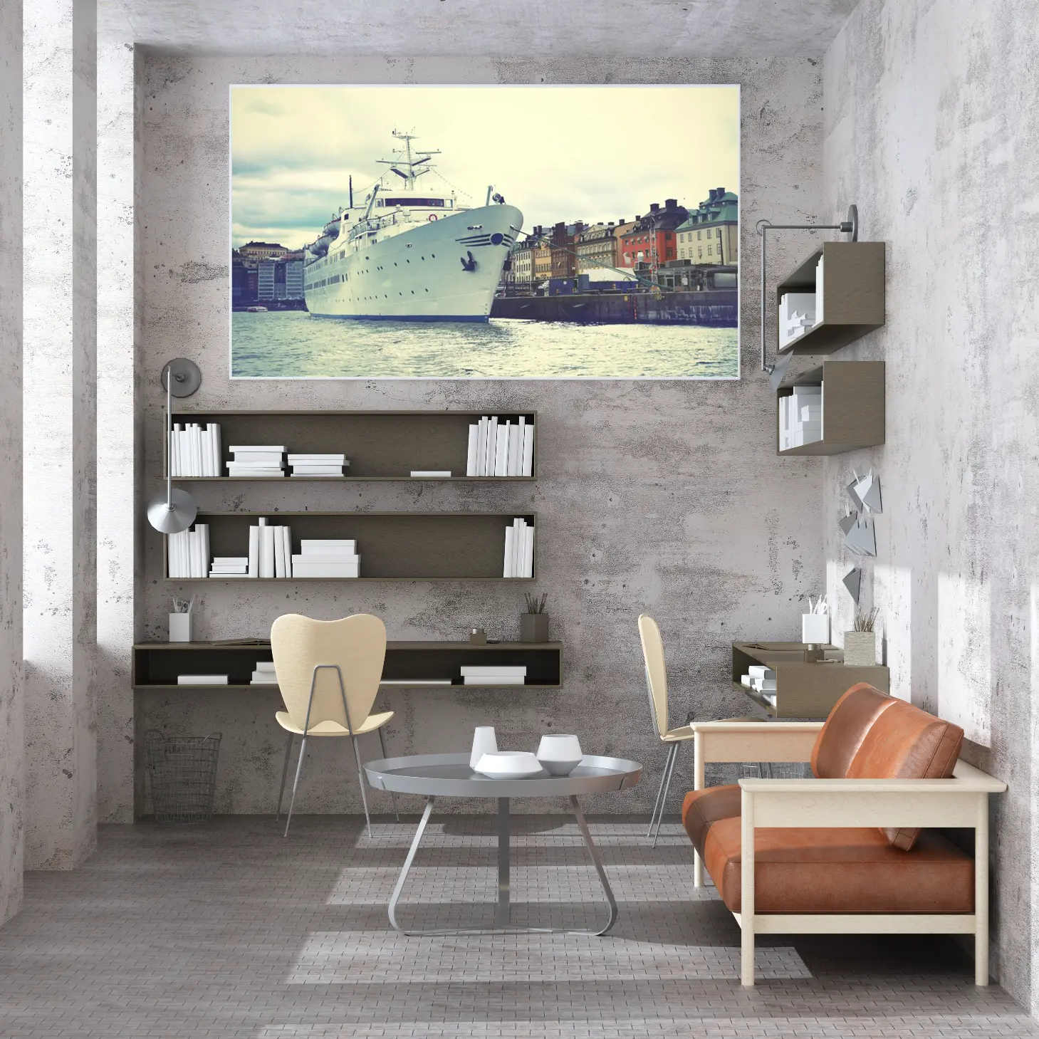 لوحة بحرية بسفينة بيضاء تبحر في مياه هادئة مع مباني ملونة في الخلفية، لوحات مناظر طبيعية، لوحات كانفاس.