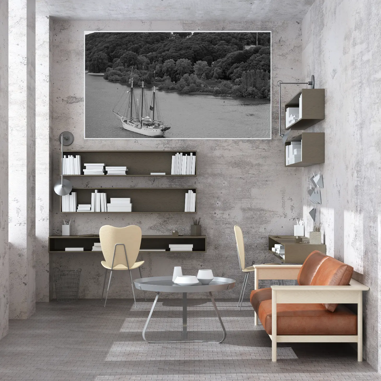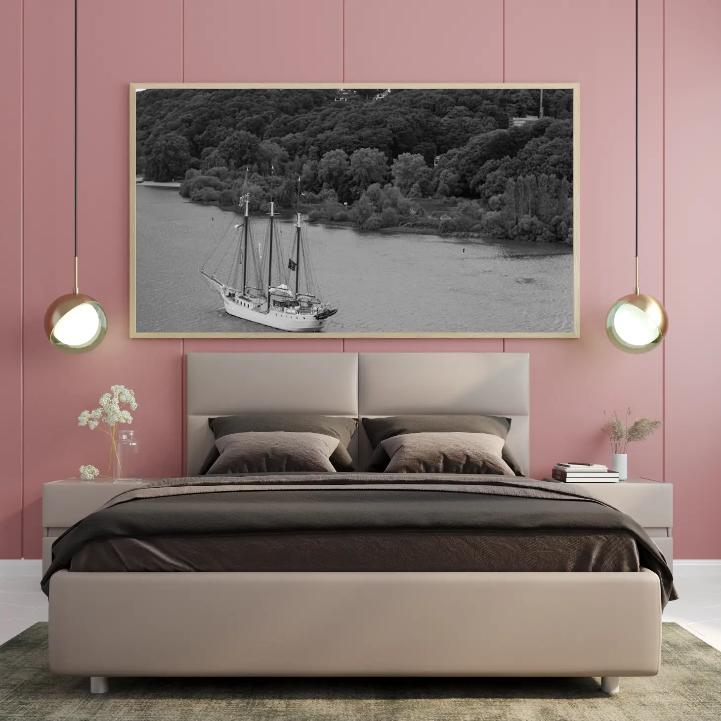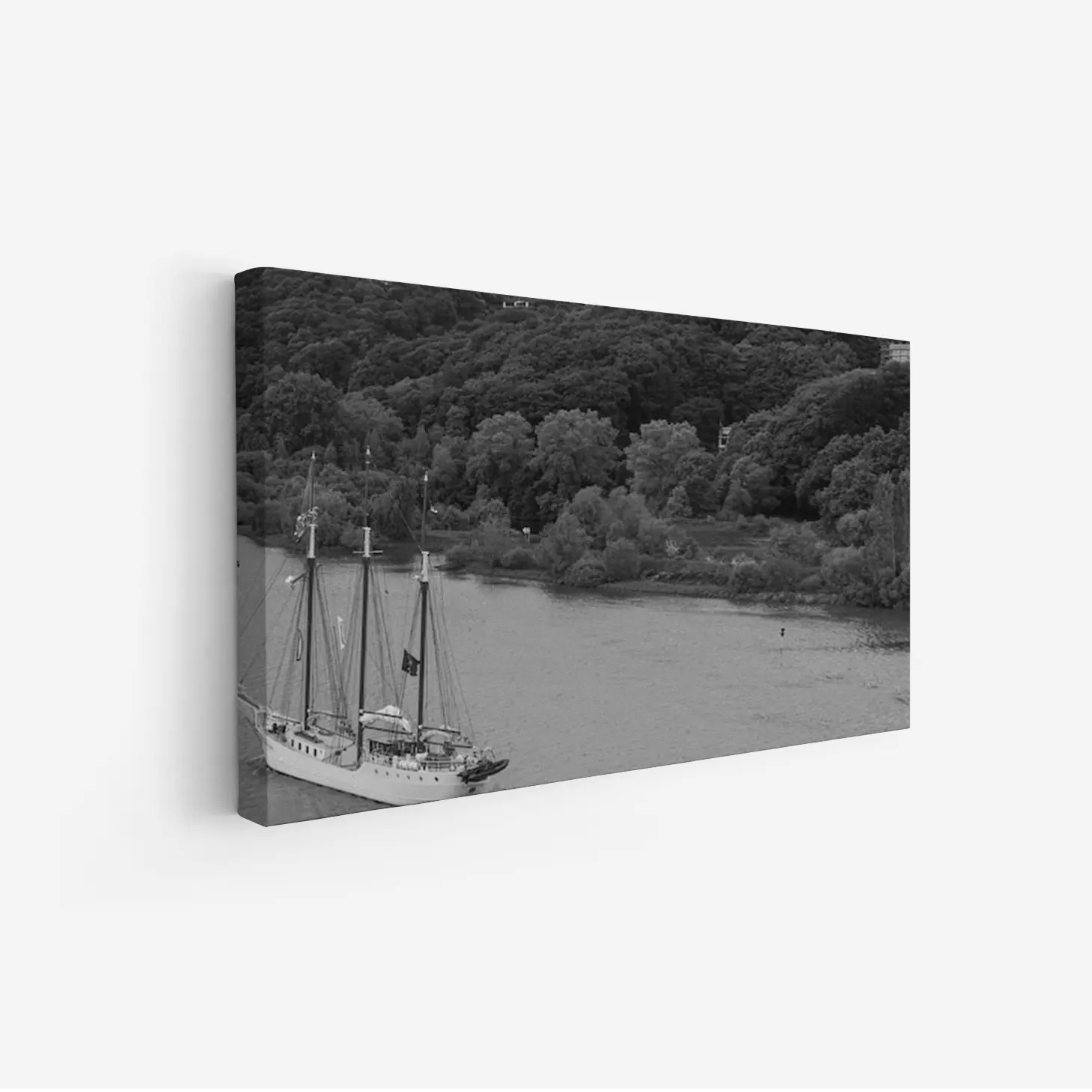 تجسد هذه اللوحة الفنية مشهدًا ساحرًا يجمع بين جمال الطبيعة وعبق التاريخ، حيث يبحر قارب أنيق في مياه هادئة محاطة بأشجار خضراء كثيفة. تعكس الألوان الأحادية عمق اللحظة، مما يضفي على المكان أجواءً من السكون والسكينة. إن هذا العمل الفني ليس مجرد قطعة ديكور، بل هو استثمار جمالي يضيف لمسة من الأناقة والتميز إلى أي مساحة.
