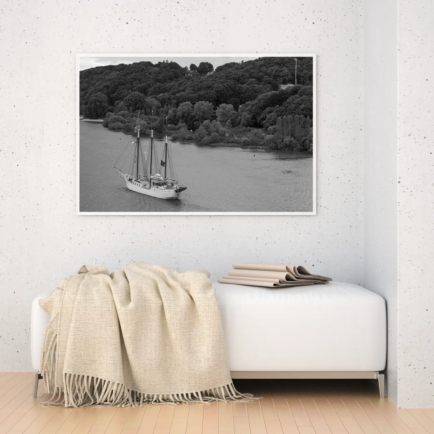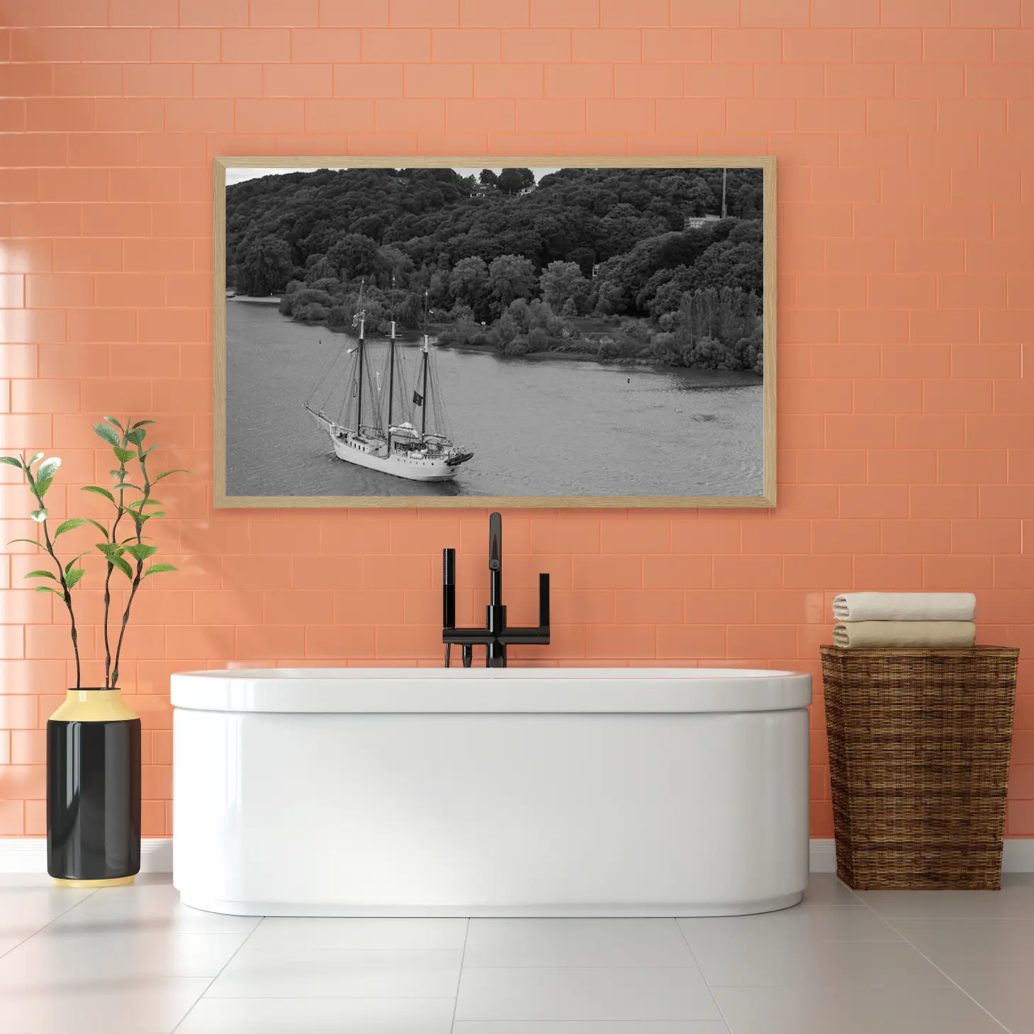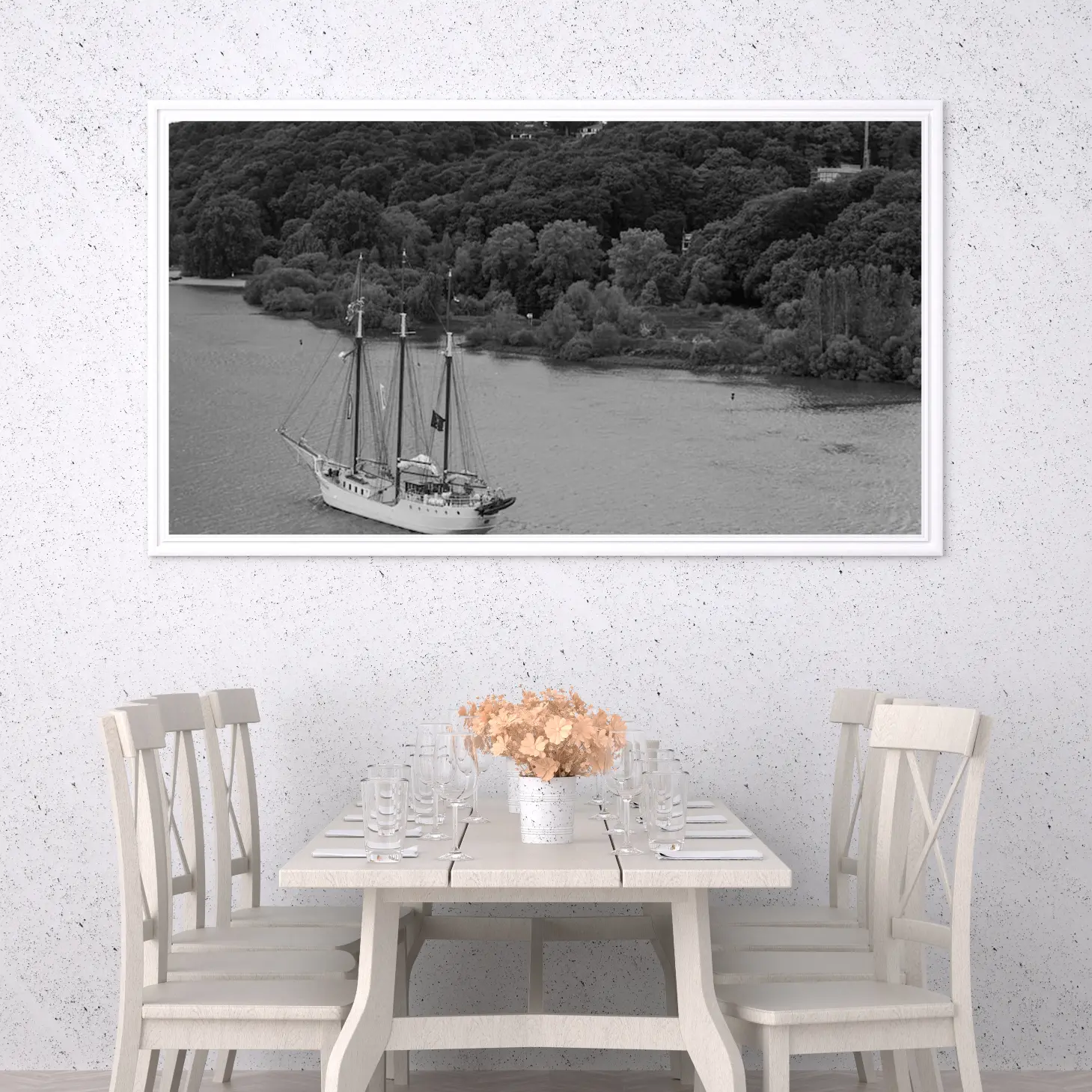 لوحة بحرية بسفينة تاريخية وسط مياه هادئة وأشجار خضراء، أجواء كلاسيكية ساحرة، لوحات طبيعة، لوحات كانفاس أنيقة