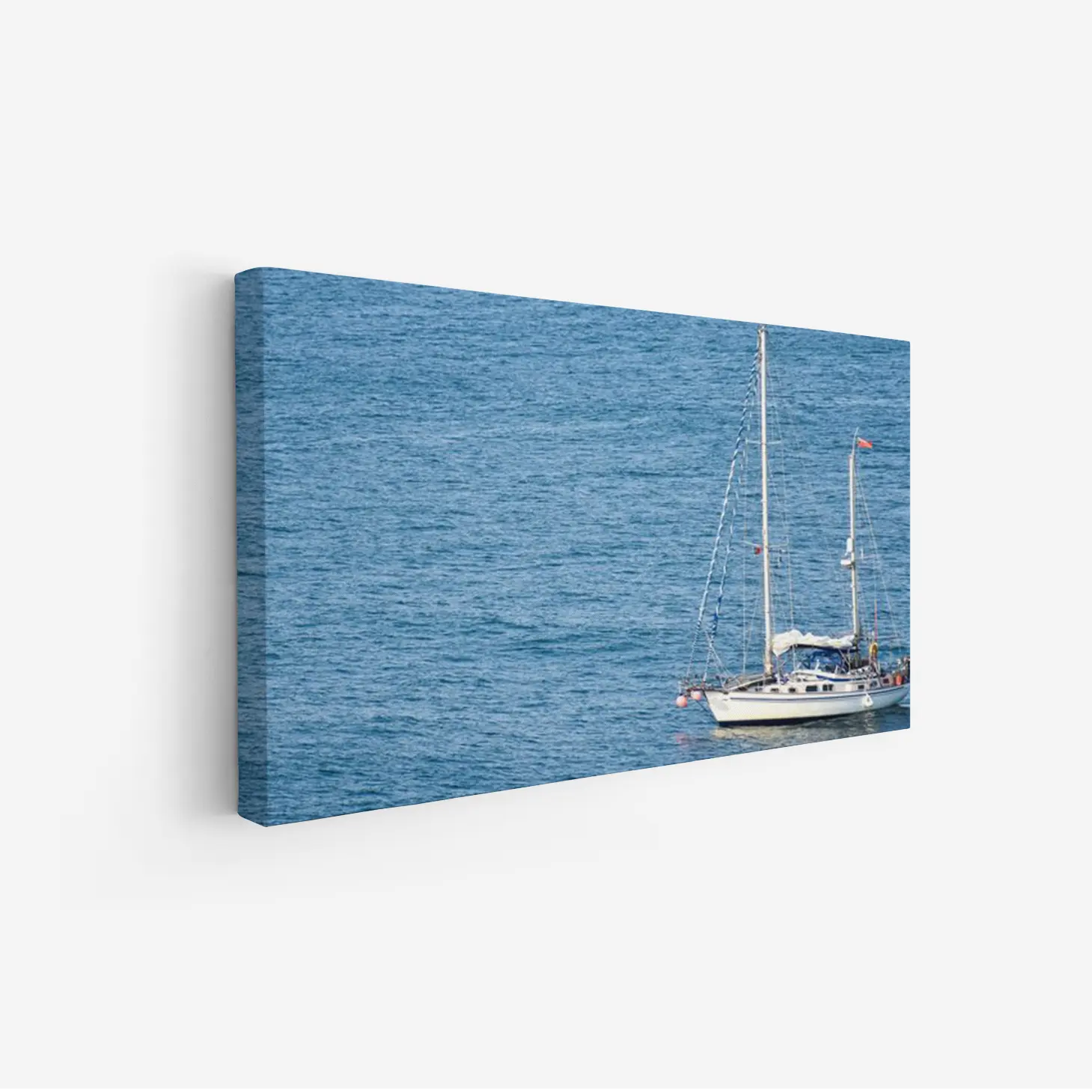لوحة بحرية بسفينة تبحر في مياه زرقاء هادئة تعكس السماء، أجواء مريحة ومنعشة، لوحات طبيعة، لوحات كانفاس.