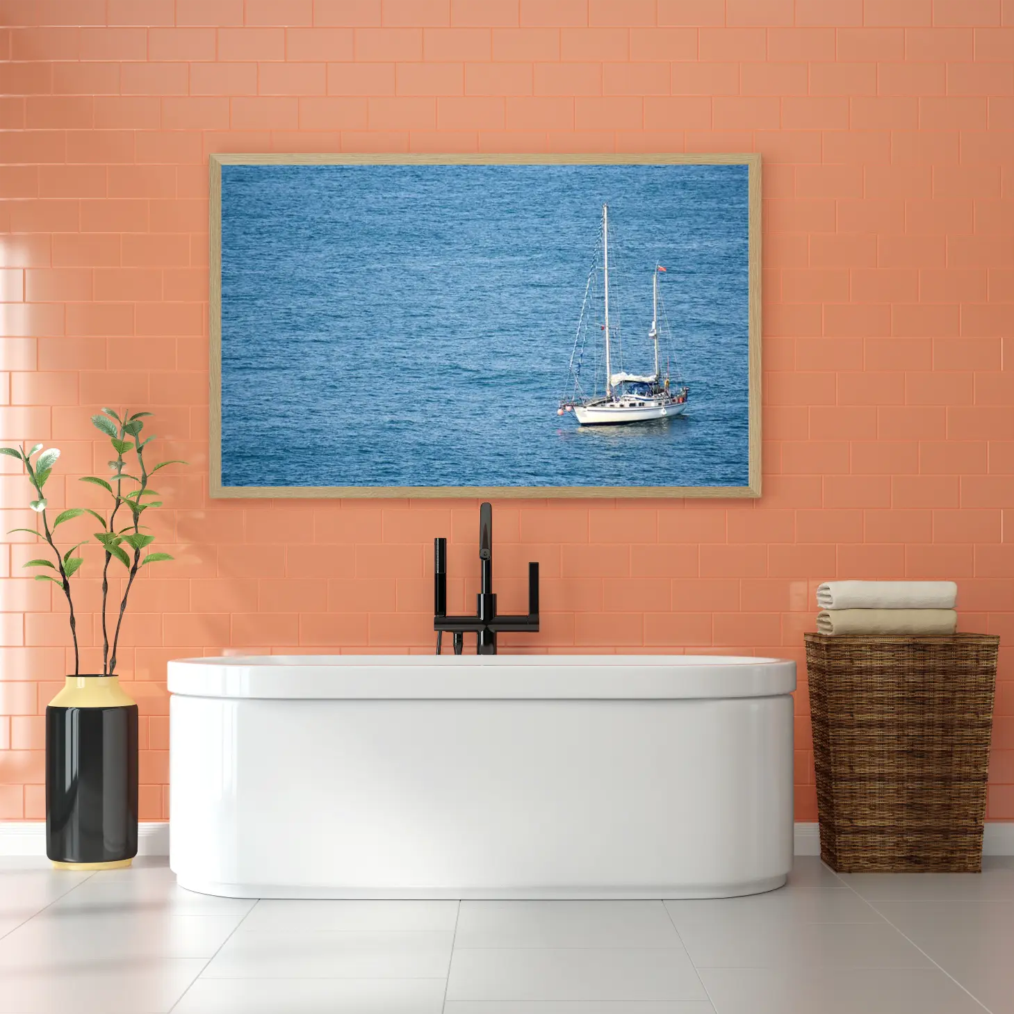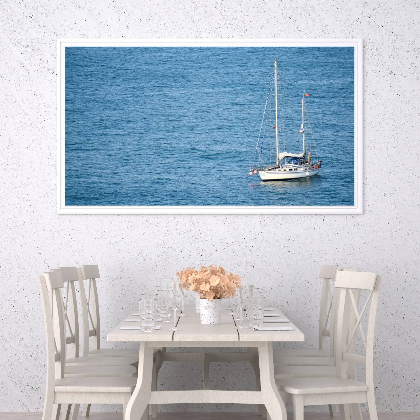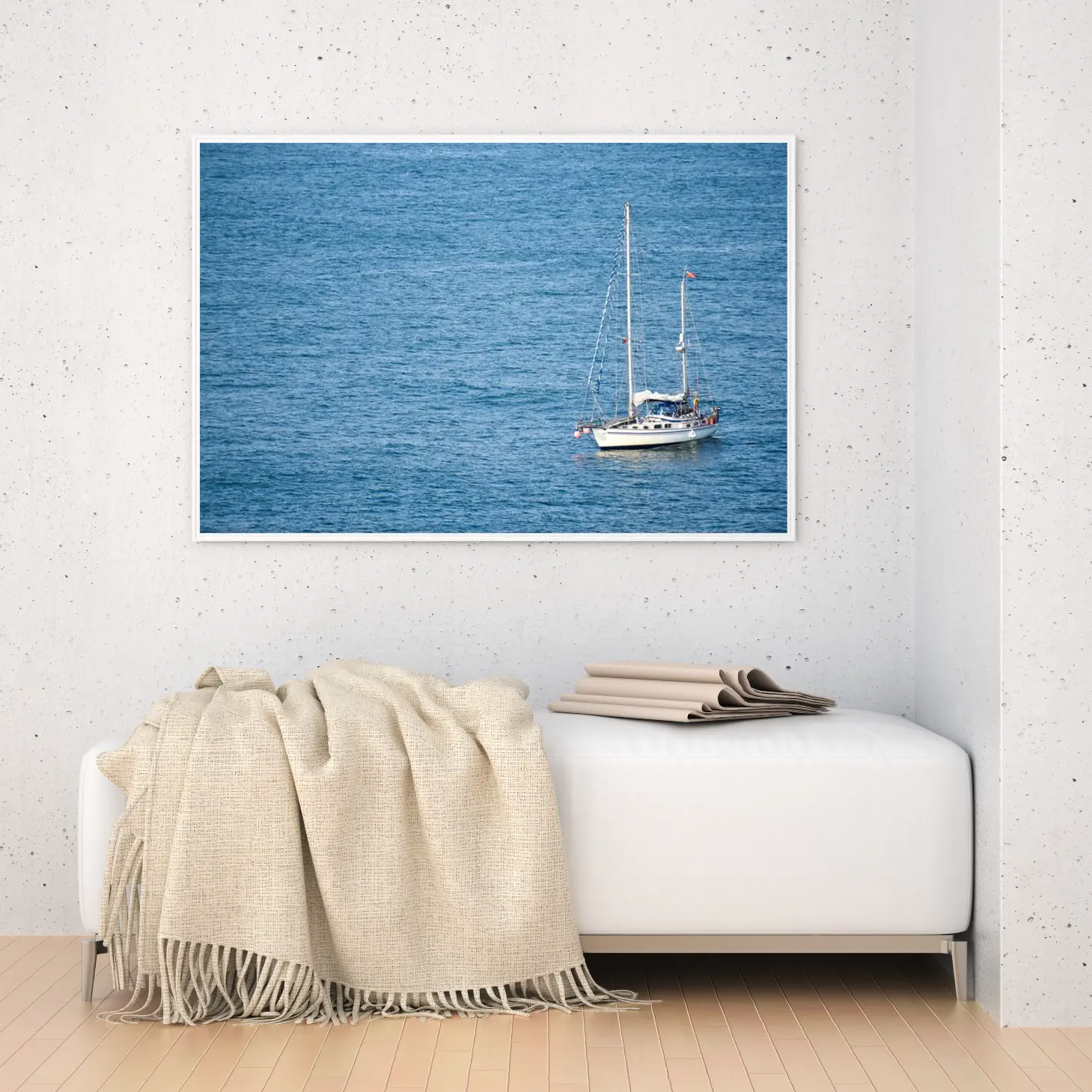 تجسد هذه اللوحة الفنية مشهداً بحرياً ساحراً، حيث تتناغم ألوان الأزرق العميق للمياه مع تفاصيل القارب الأبيض الذي يبحر برشاقة. تعكس الأجواء الهادئة شعوراً بالسكينة والحرية، مما يجعلها خياراً مثالياً لإضفاء لمسة من الجمال الطبيعي على أي مساحة. إن وجود هذه القطعة الفنية في منزلك أو مكتبك سيعزز من نمط الحياة العصري، ويخلق بيئة مريحة تدعو للاسترخاء والتأمل.
