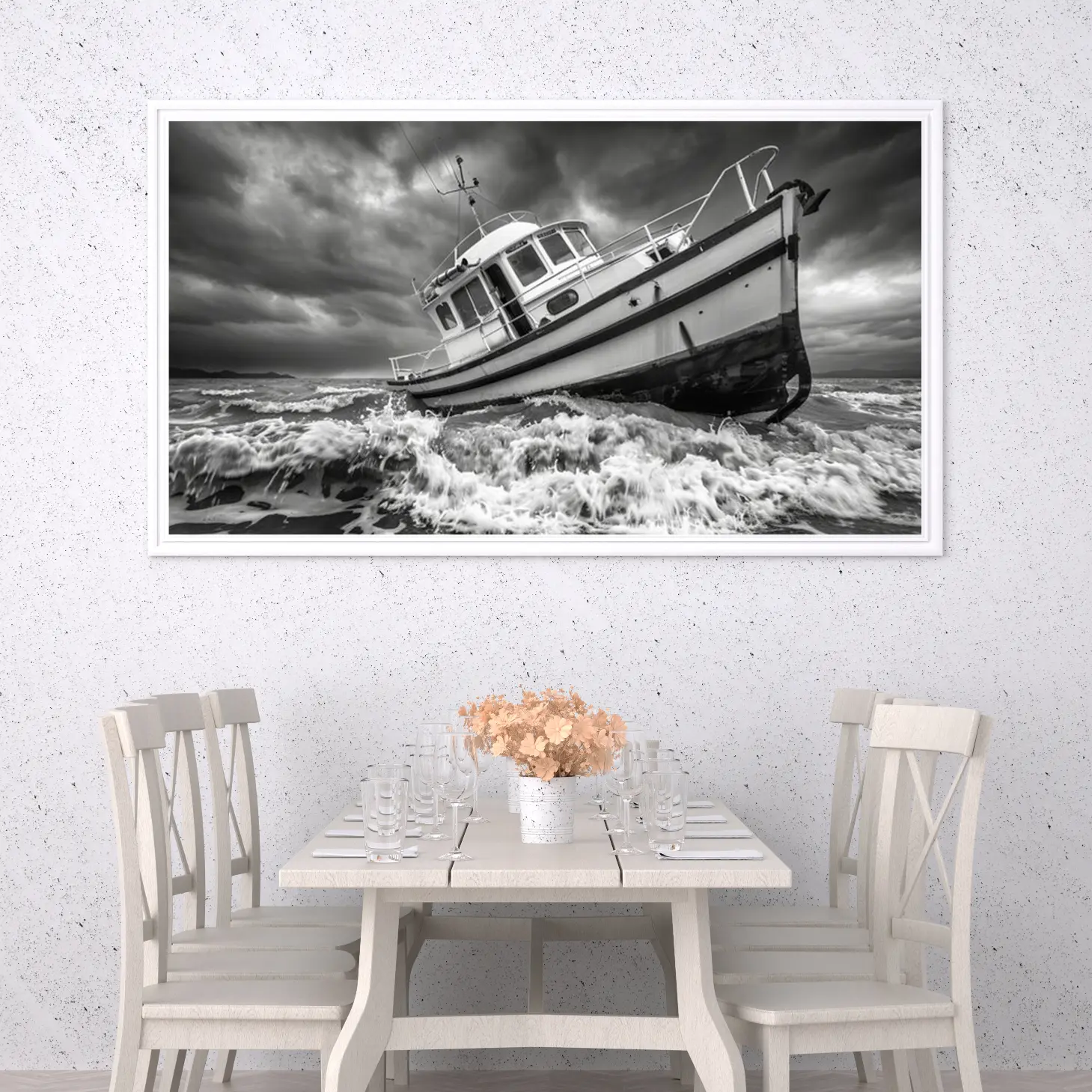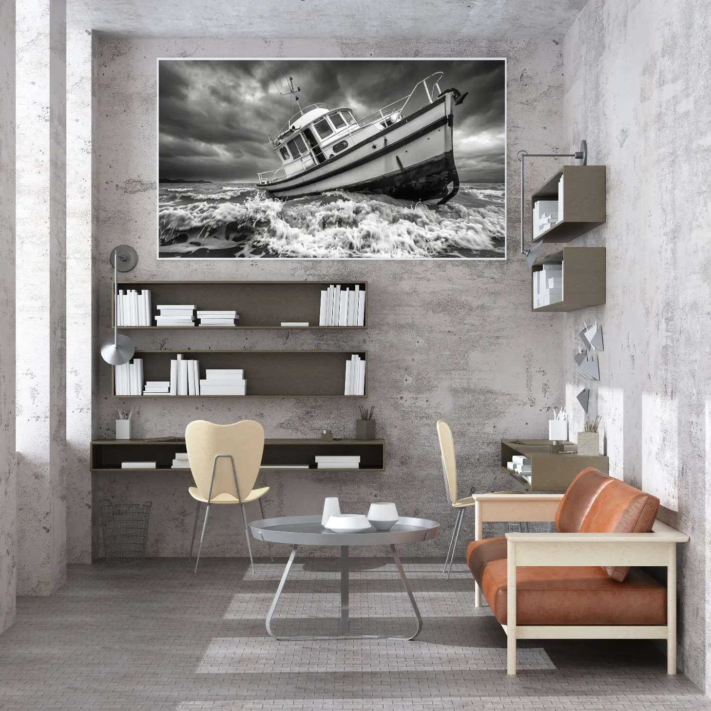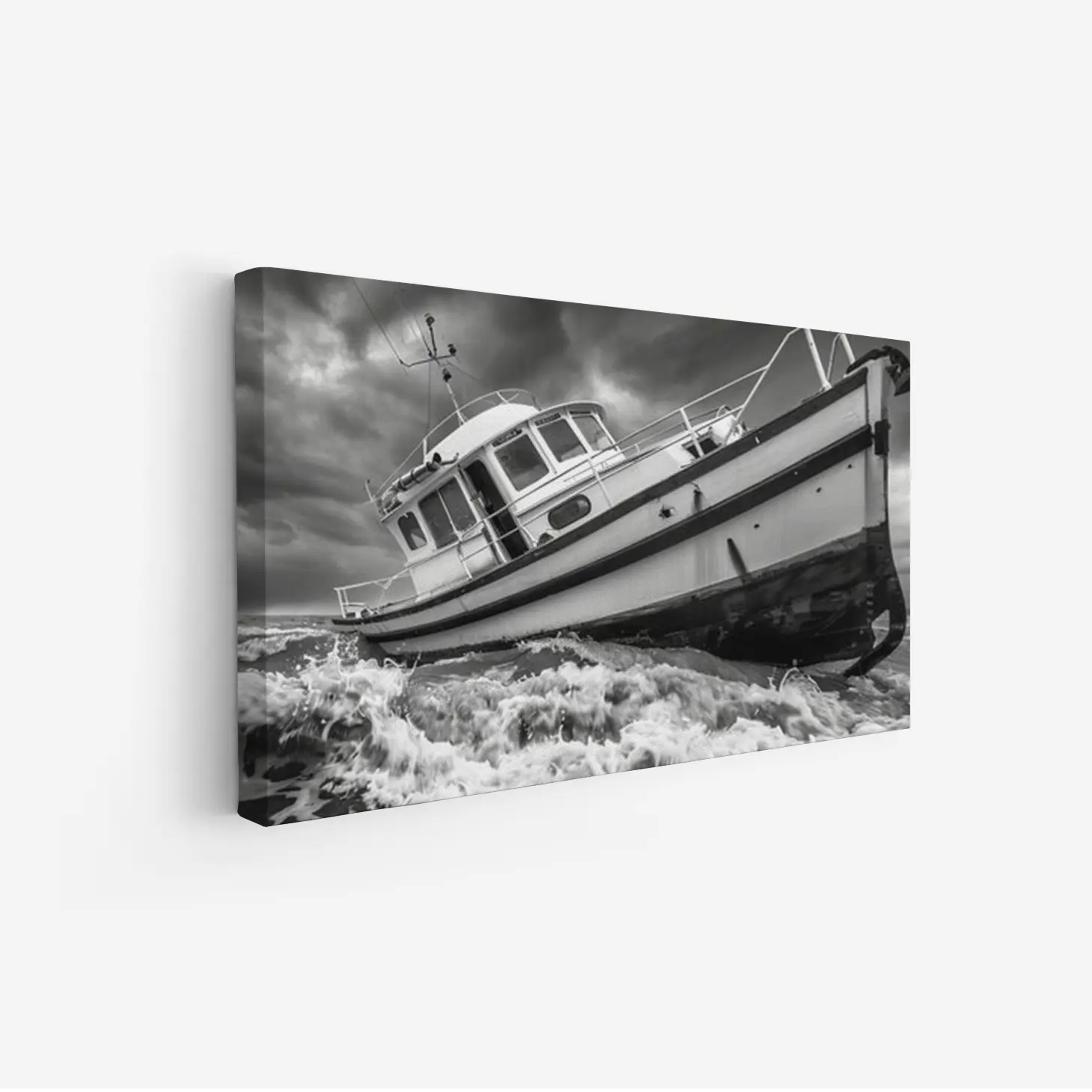 تجسد هذه اللوحة الفنية مشهداً بحرياً مهيباً، حيث يظهر قارب صغير يتحدى الأمواج العاتية تحت سماء ملبدة بالغيوم. تعكس الألوان الأحادية عمق المشاعر والتوتر الذي يعيشه القارب في مواجهة الطبيعة، مما يضفي على المكان أجواءً من القوة والجرأة. هذه القطعة الفنية ليست مجرد ديكور جداري، بل هي تعبير عن روح المغامرة والتحدي، مما يجعلها إضافة مثالية لأي مساحة تبحث عن لمسة فنية مميزة.