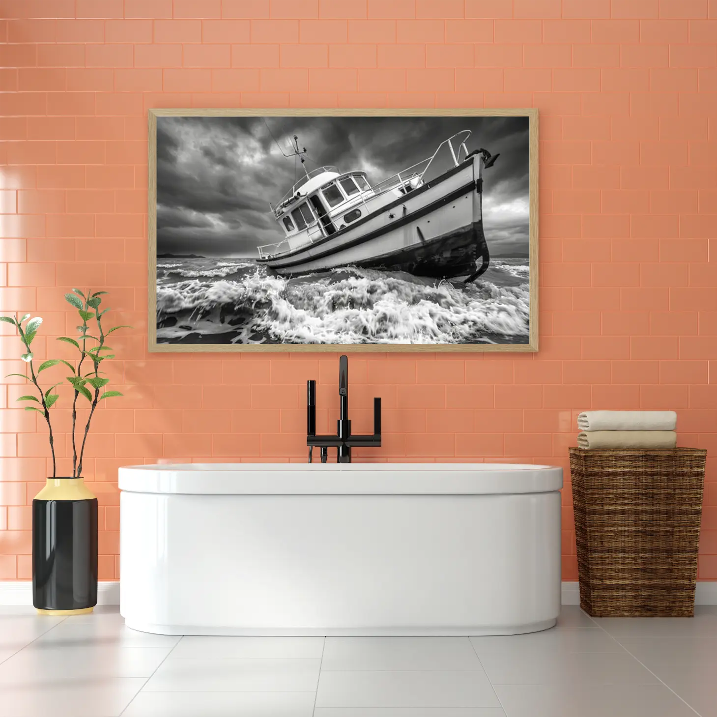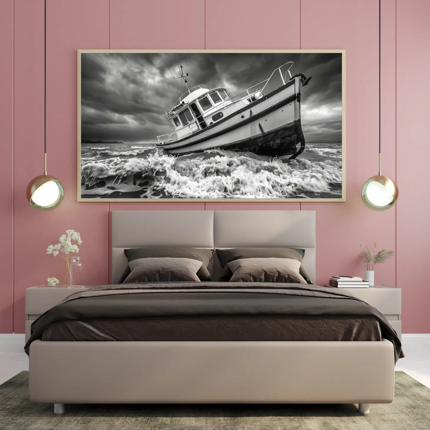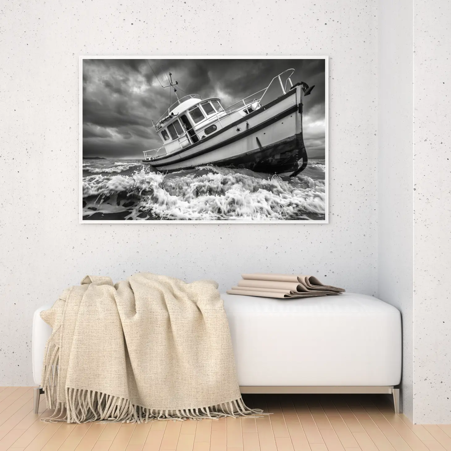 تجسد هذه اللوحة الفنية مشهداً بحرياً مهيباً، حيث يظهر قارب صغير يتحدى الأمواج العاتية تحت سماء ملبدة بالغيوم. تعكس الألوان الأحادية عمق المشاعر والتوتر الذي يعيشه القارب في مواجهة الطبيعة، مما يضفي على المكان أجواءً من القوة والجرأة. هذه القطعة الفنية ليست مجرد ديكور جداري، بل هي تعبير عن روح المغامرة والتحدي، مما يجعلها إضافة مثالية لأي مساحة تبحث عن لمسة فنية مميزة.