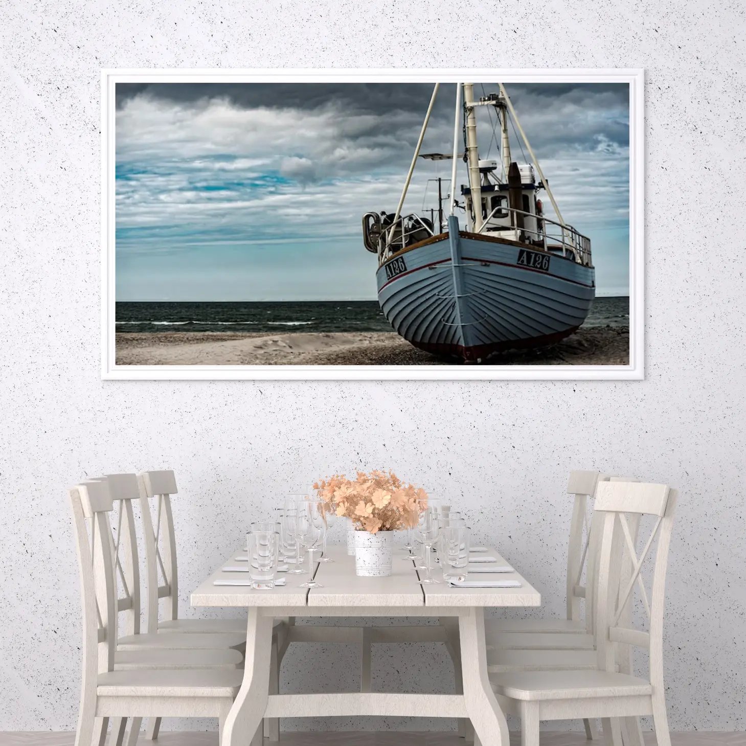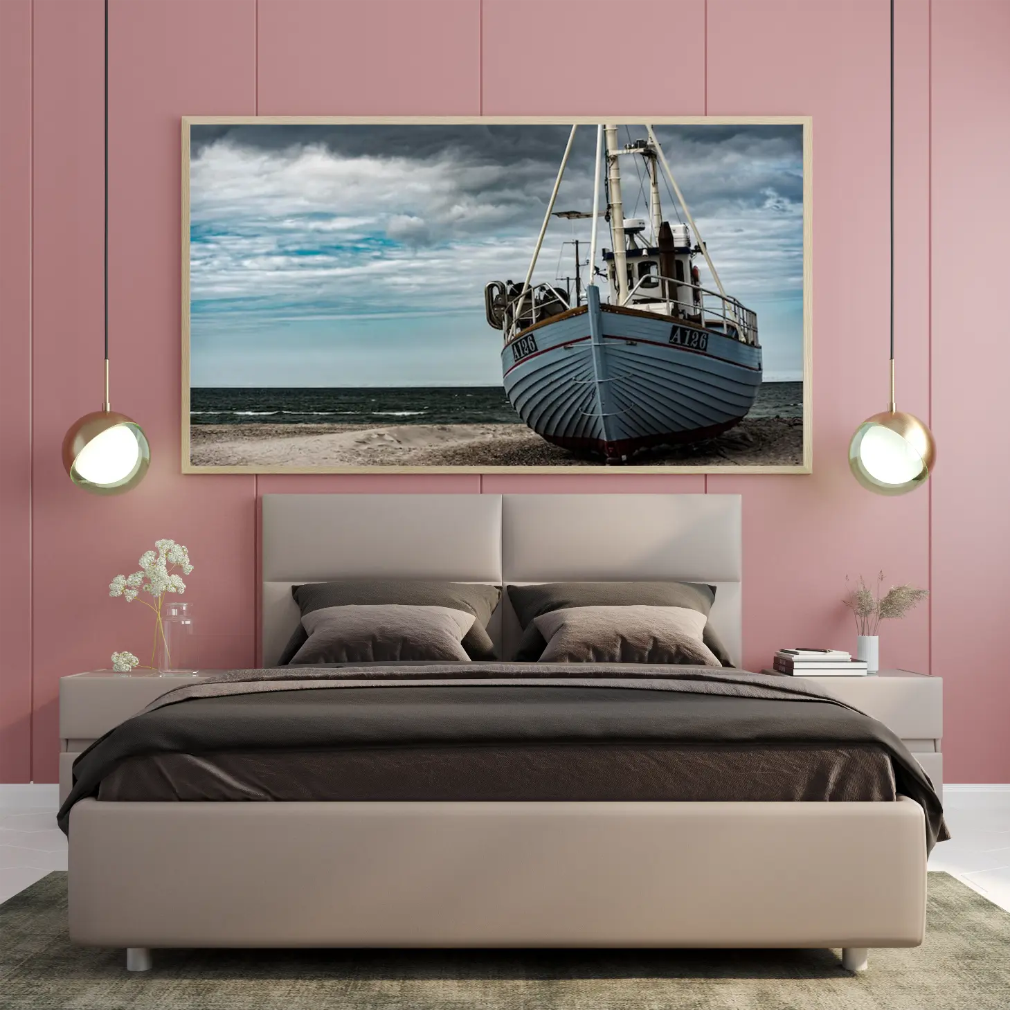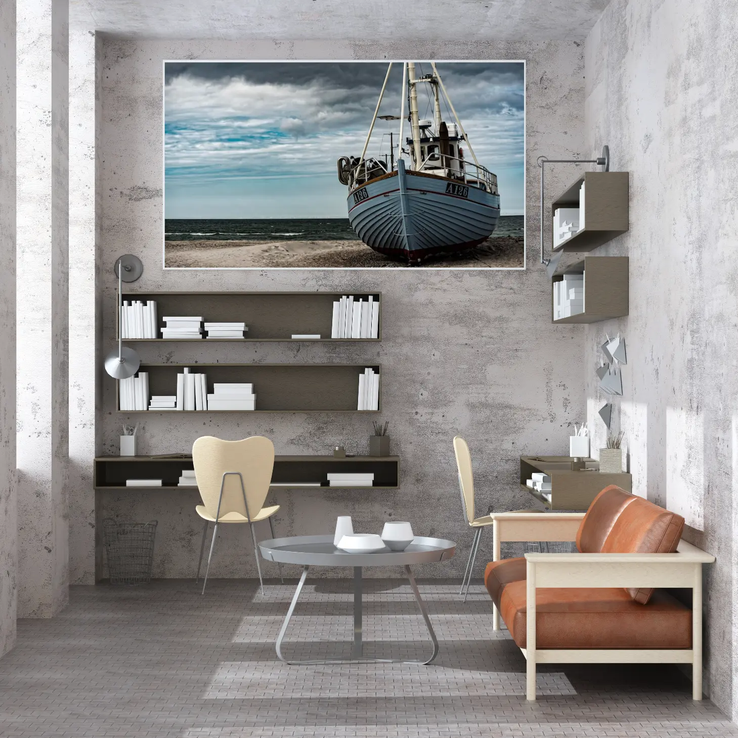 لوحة بحرية بسفينة تقف على الشاطئ تحت سماء غائمة، تعكس ألوان الأزرق والرمادي، لوحات طبيعة، لوحات كانفاس.