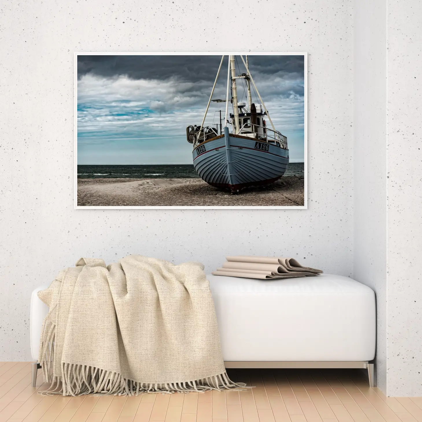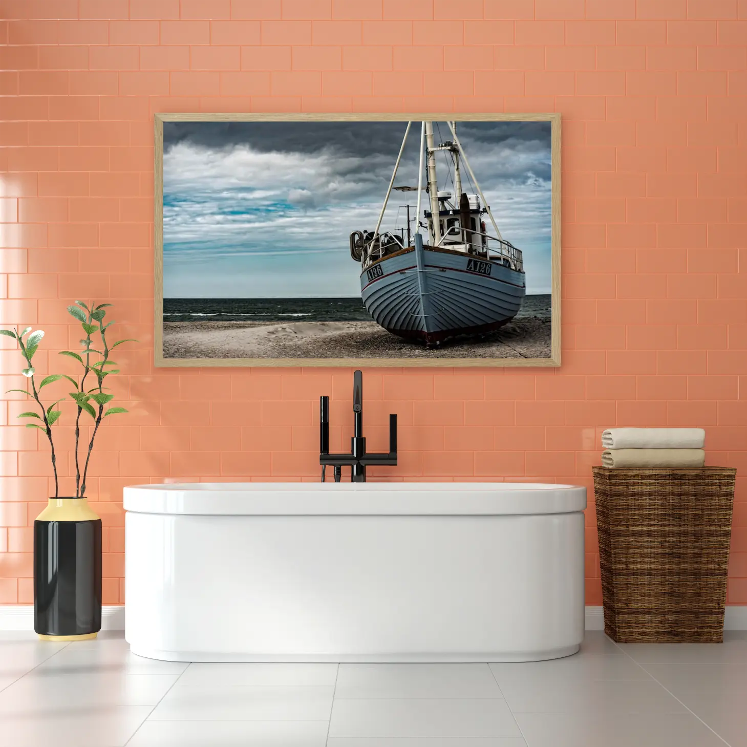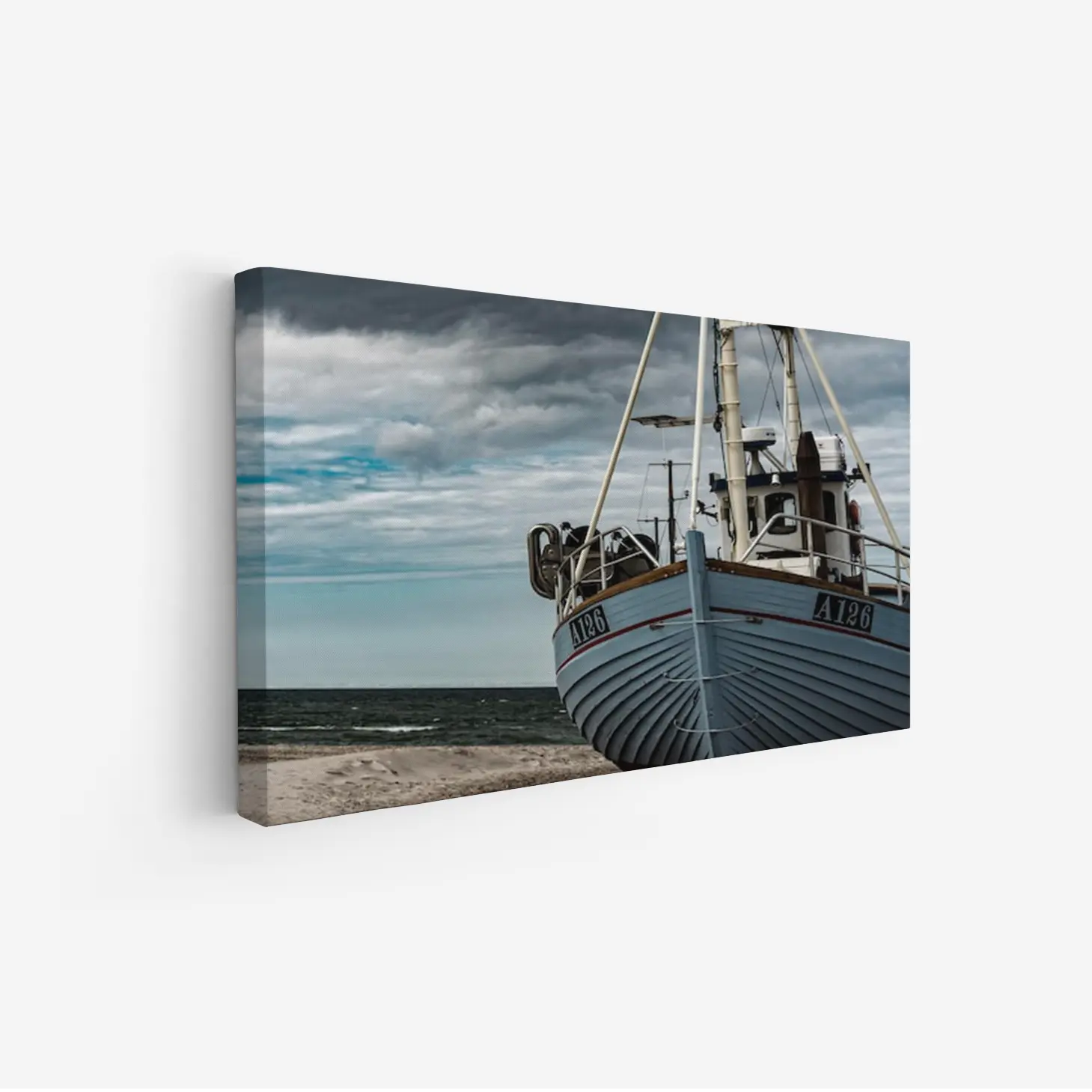 لوحة بحرية بسفينة تقف على الشاطئ تحت سماء غائمة، تعكس ألوان الأزرق والرمادي، لوحات طبيعة، لوحات كانفاس.