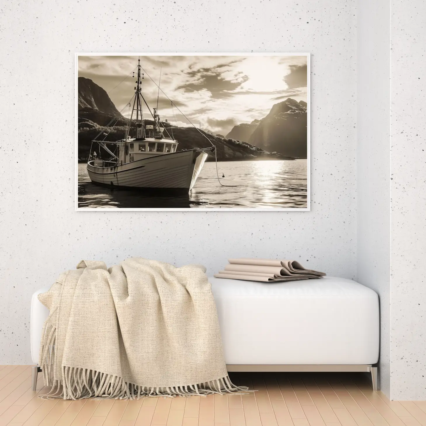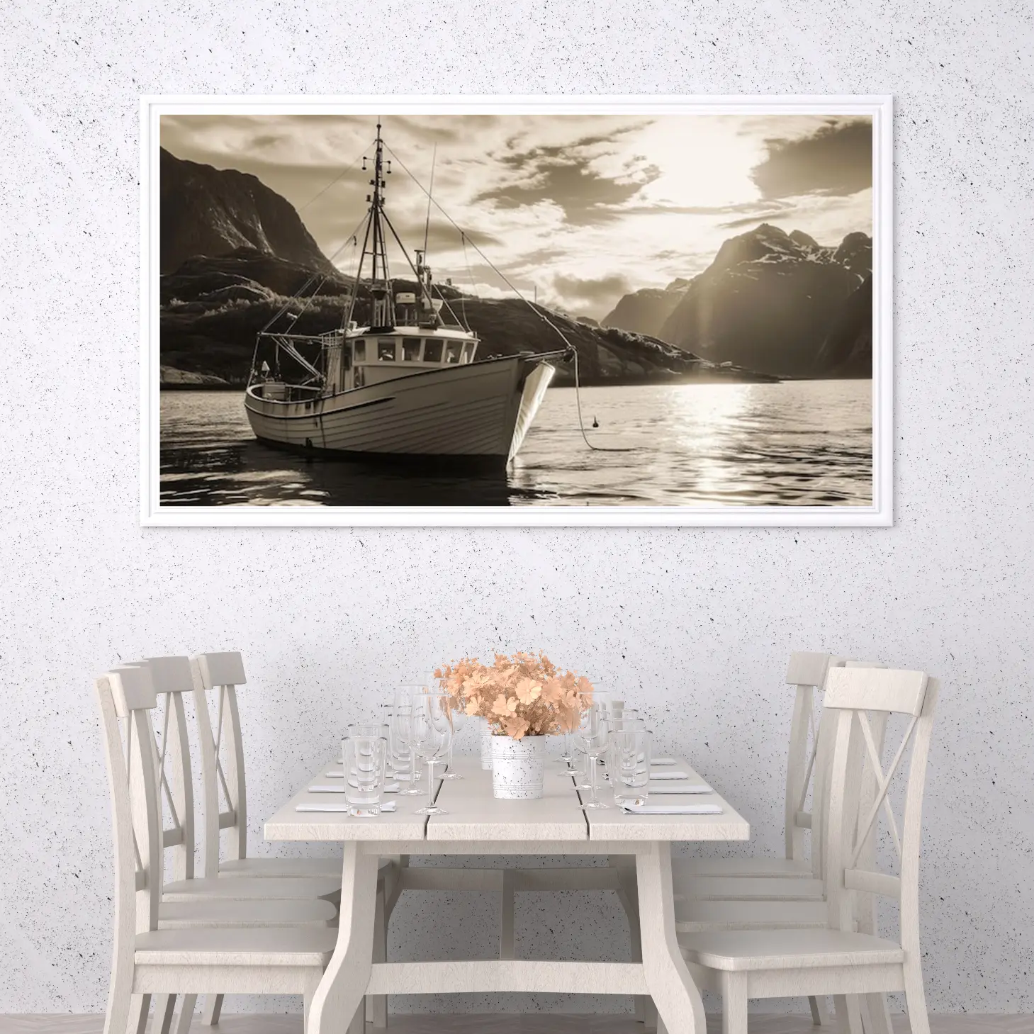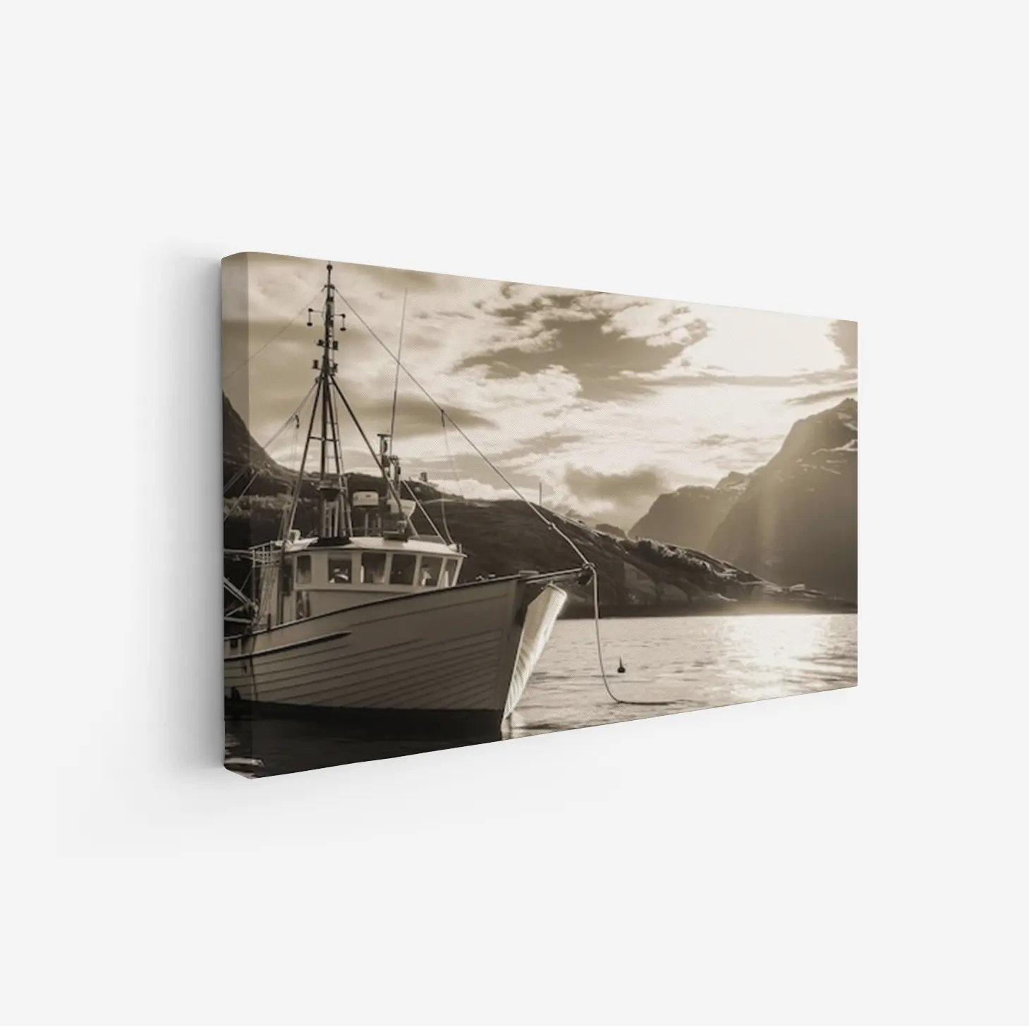 تجسد هذه اللوحة الفنية مشهدًا بحريًا ساحرًا، حيث يبرز قارب تقليدي يرسو بهدوء على سطح مياه هادئة، محاطًا بتضاريس جبلية خلابة. الألوان الدافئة والظلال الناعمة تخلق إحساسًا بالسكينة والهدوء، مما يجعلها إضافة مثالية لأي مساحة. تعكس اللوحة نمط حياة مفعم بالبساطة والجمال الطبيعي، مما يضفي على المكان أجواءً من الاسترخاء والراحة.