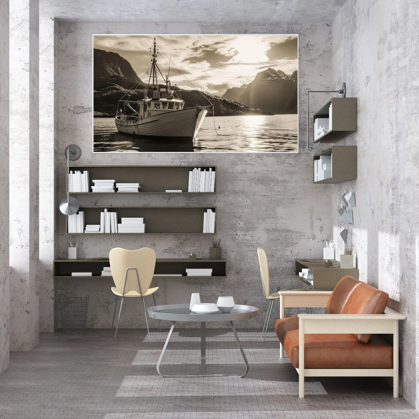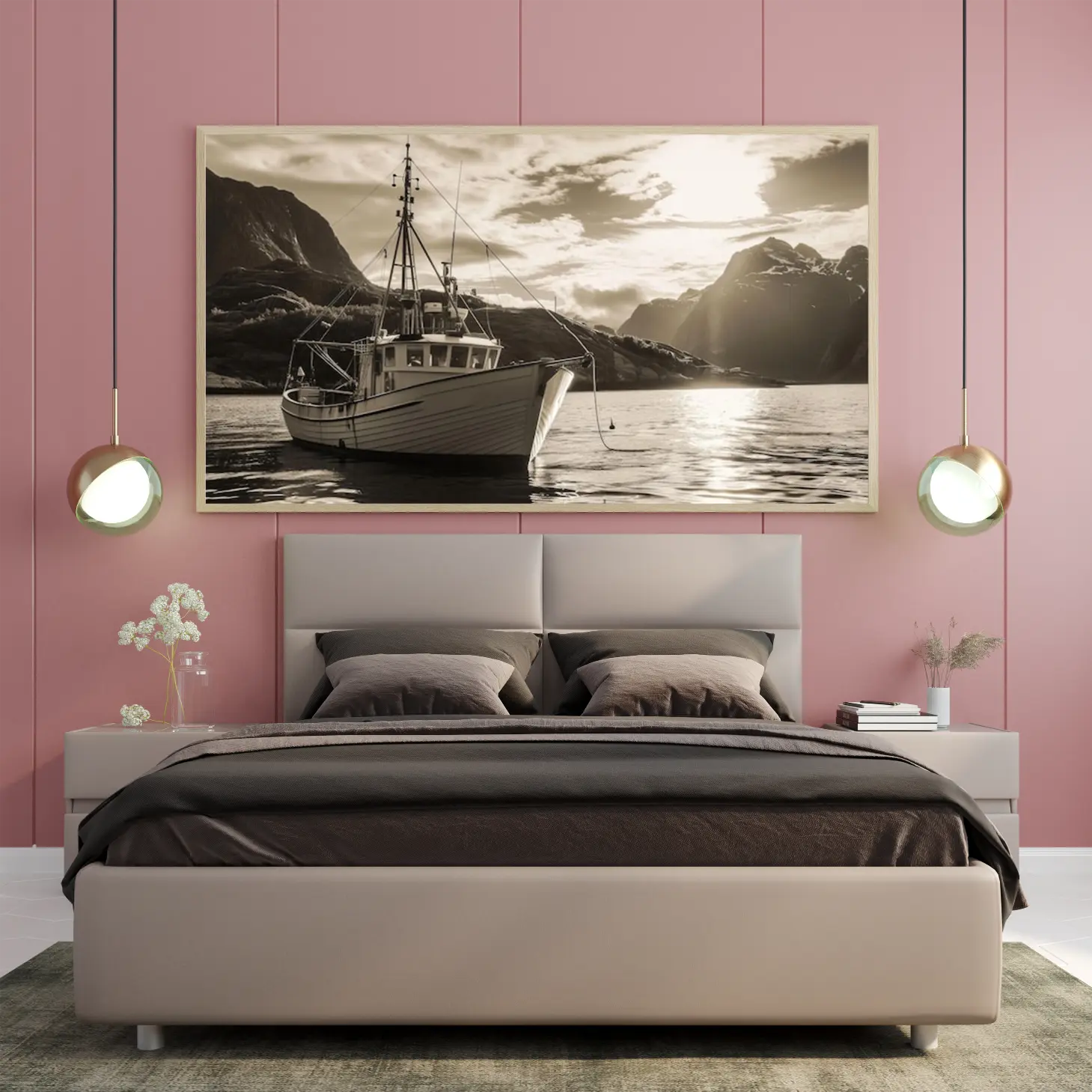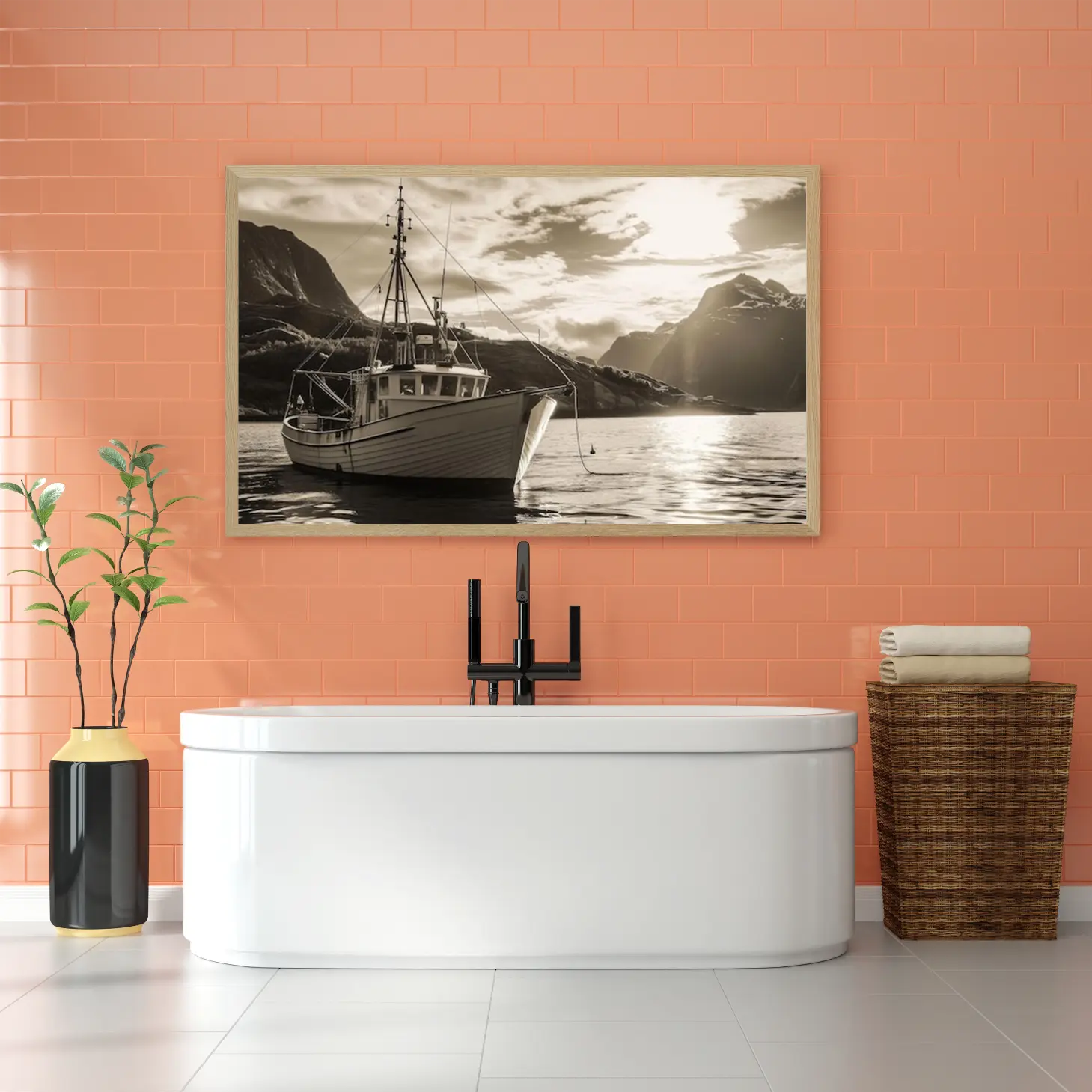 تجسد هذه اللوحة الفنية مشهدًا بحريًا ساحرًا، حيث يبرز قارب تقليدي يرسو بهدوء على سطح مياه هادئة، محاطًا بتضاريس جبلية خلابة. الألوان الدافئة والظلال الناعمة تخلق إحساسًا بالسكينة والهدوء، مما يجعلها إضافة مثالية لأي مساحة. تعكس اللوحة نمط حياة مفعم بالبساطة والجمال الطبيعي، مما يضفي على المكان أجواءً من الاسترخاء والراحة.