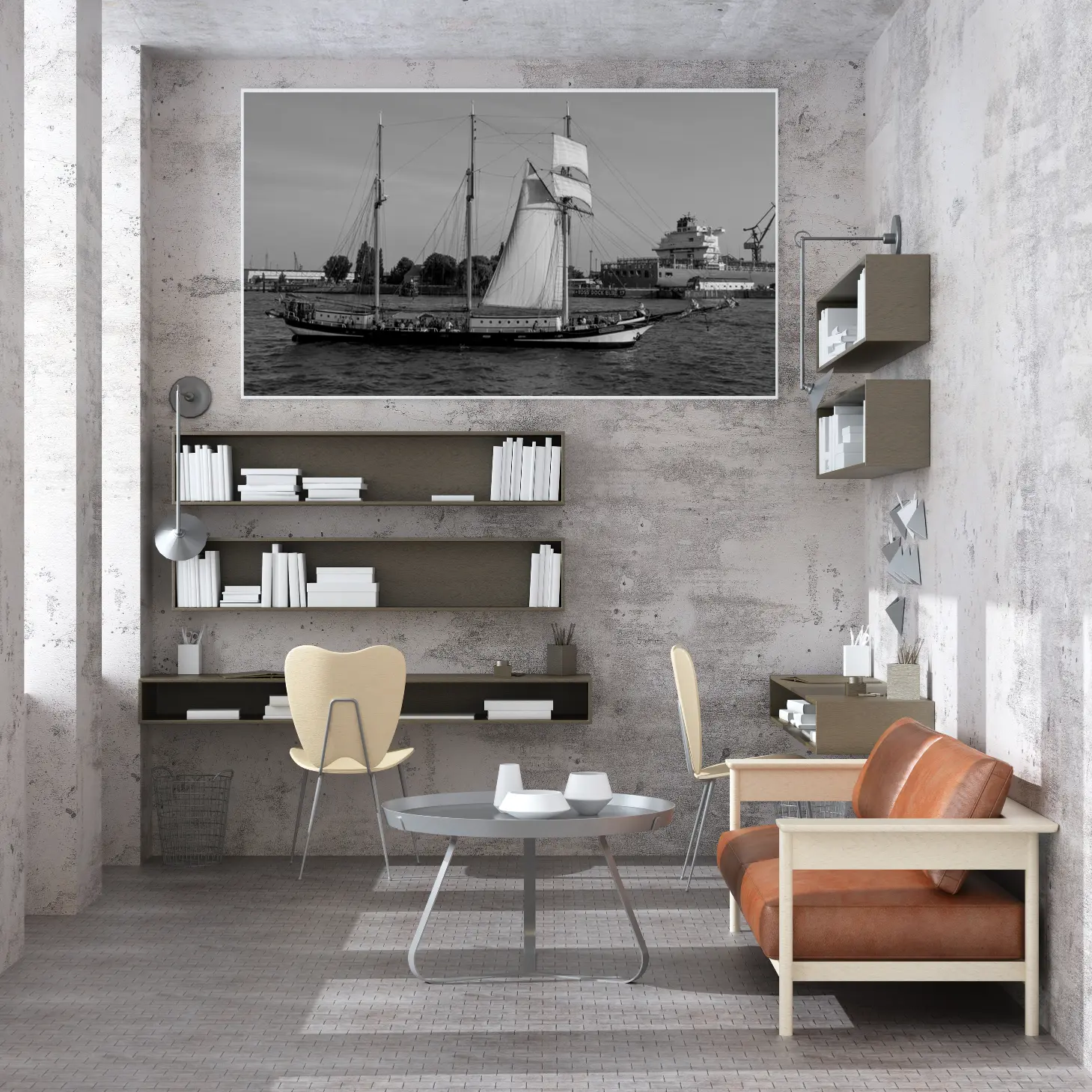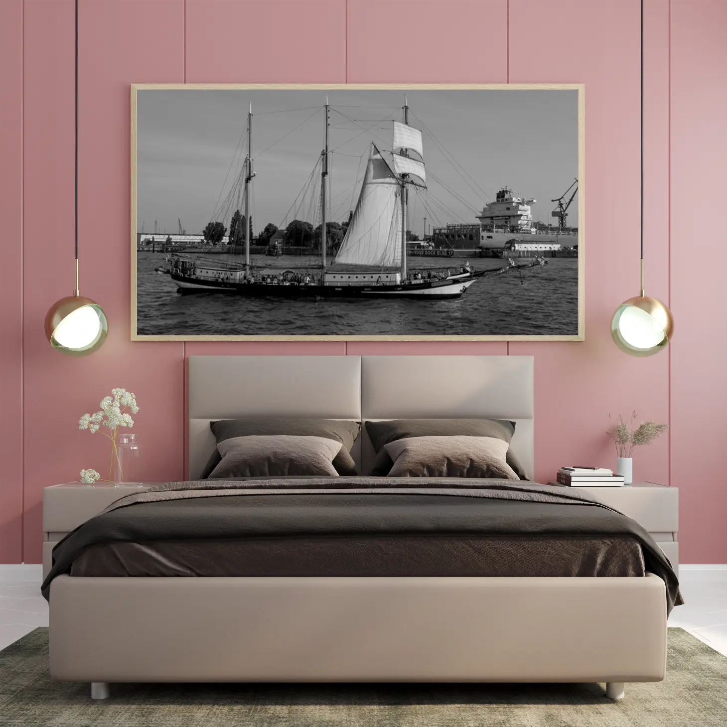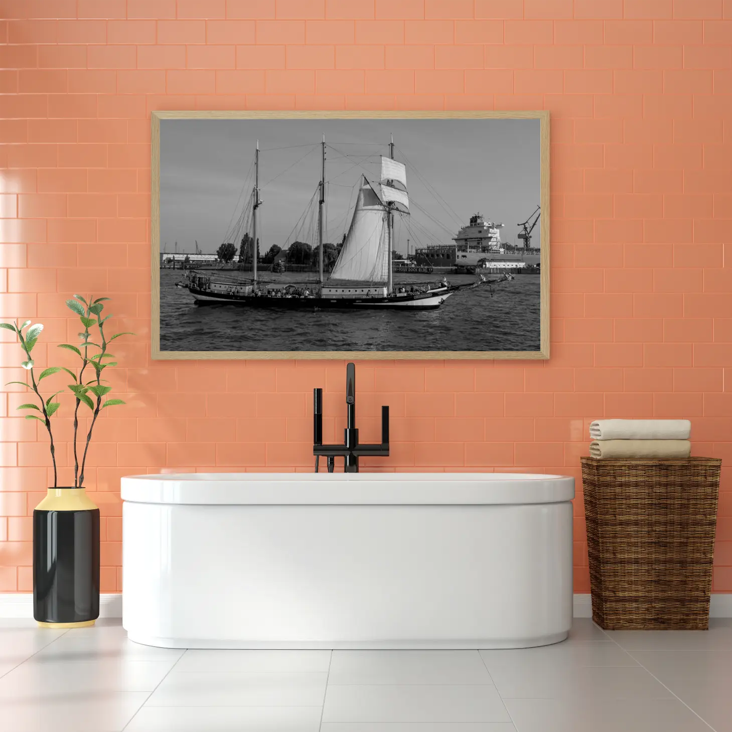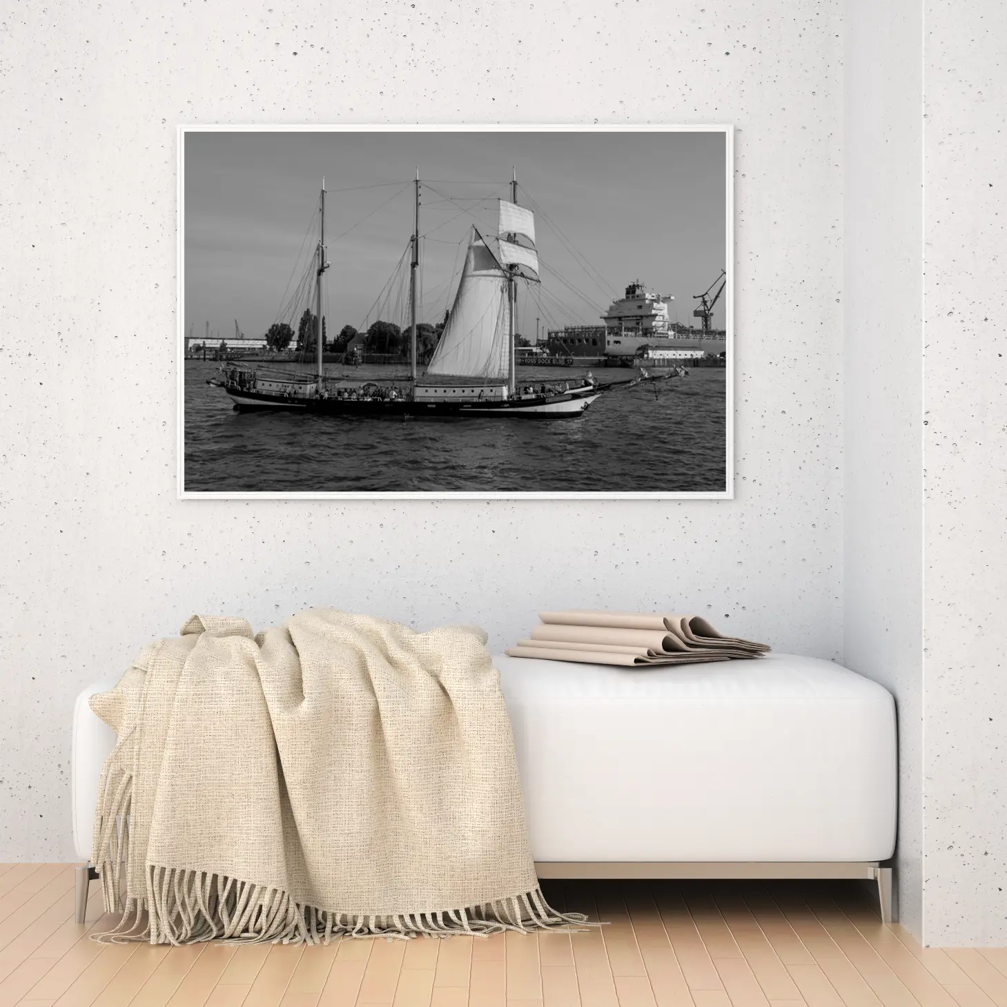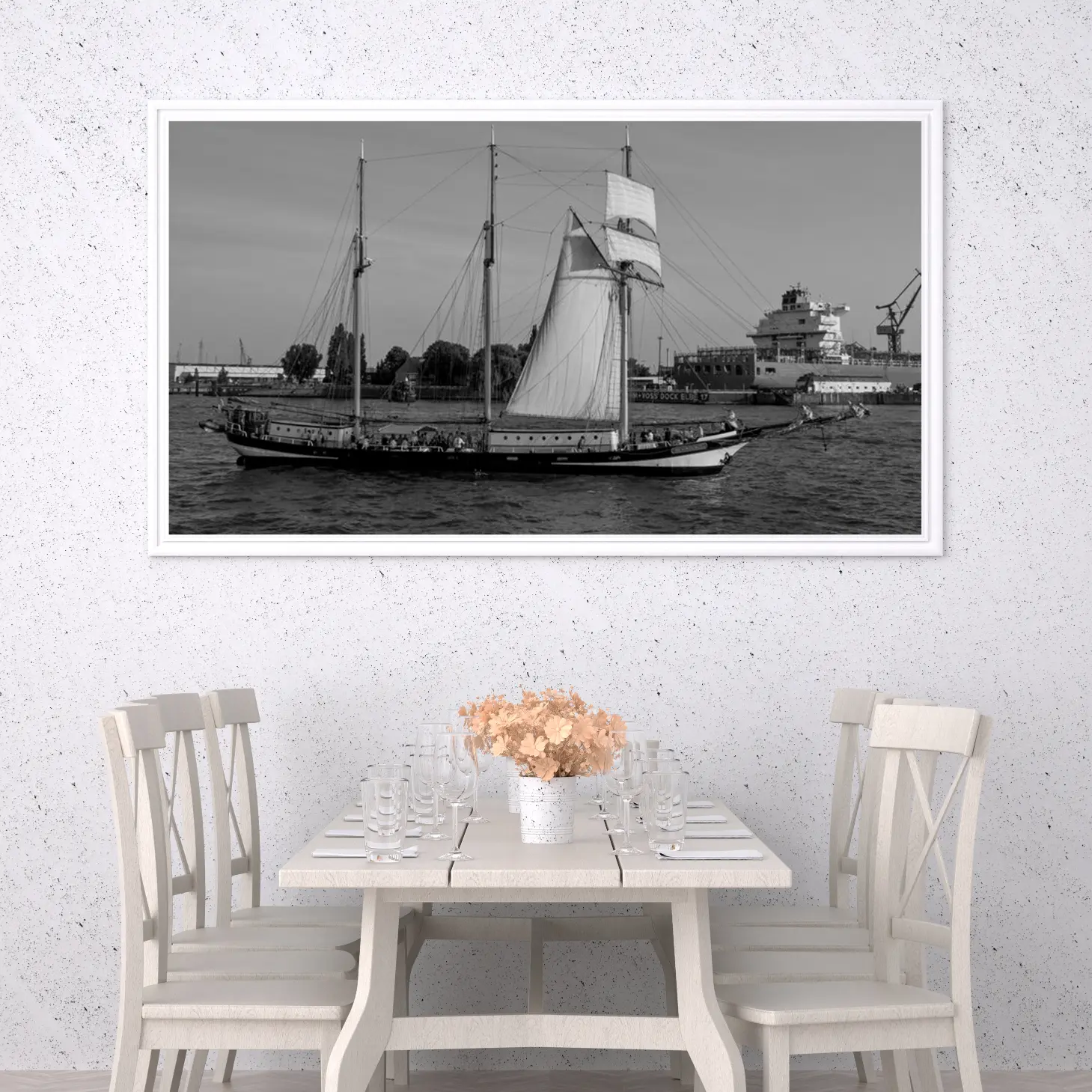 تجسد هذه اللوحة الفنية مشهدًا بحريًا ساحرًا، حيث تتناغم تفاصيل السفينة الشراعية مع حركة المياه الهادئة. تعكس الأجواء العامة إحساسًا بالهدوء والسكينة، مما يجعلها خيارًا مثاليًا لإضفاء لمسة من الرقي على أي مساحة. تخلق الألوان الأحادية تباينًا جذابًا، مما يساهم في تعزيز جماليات المكان ويعكس نمط حياة متوازن ومتناغم.