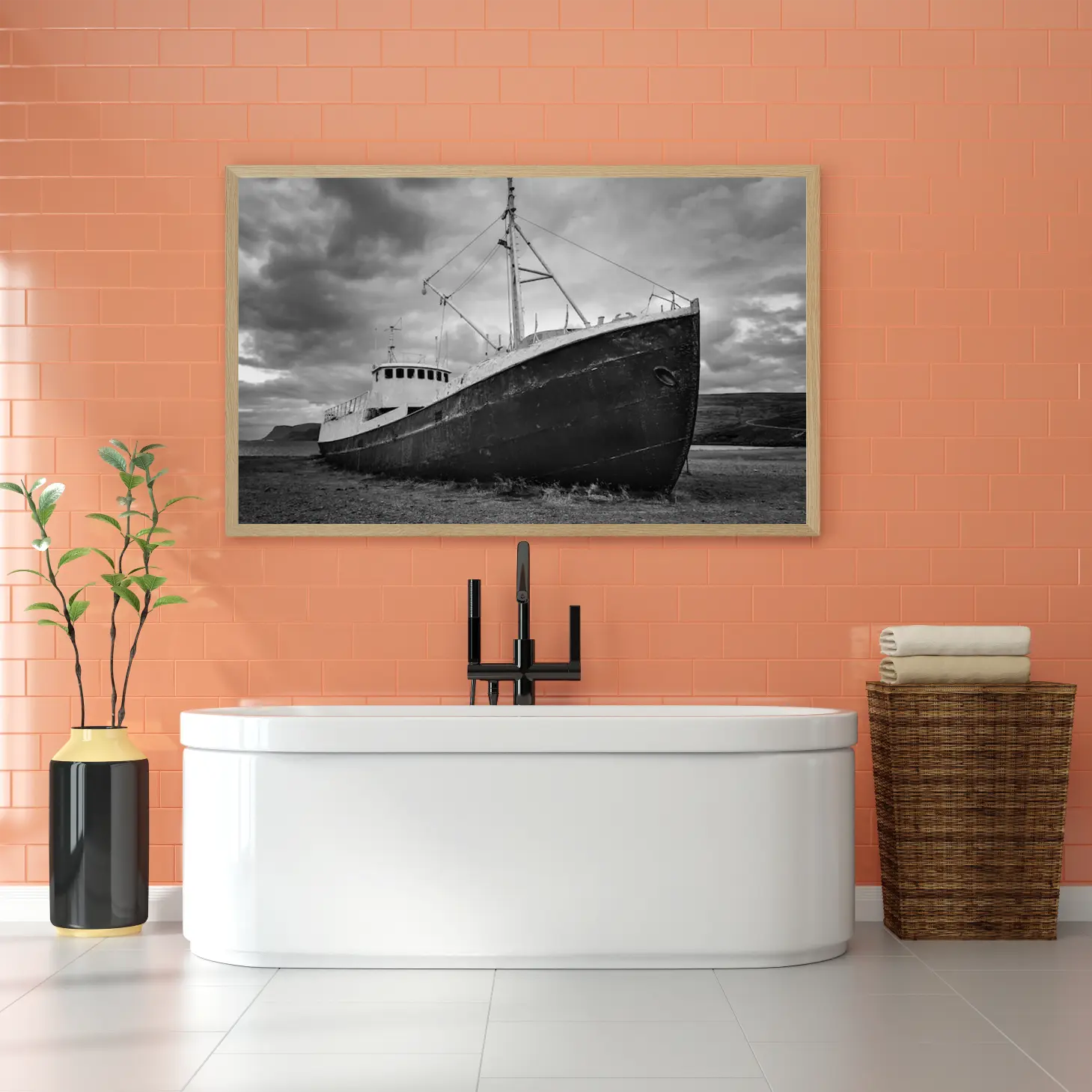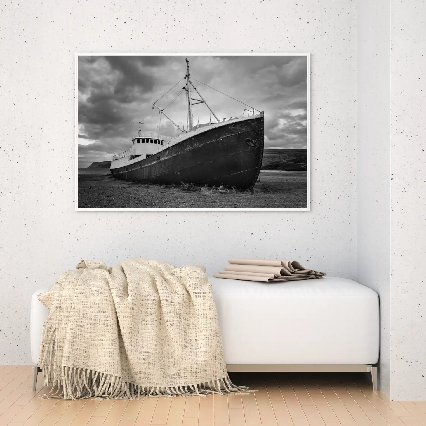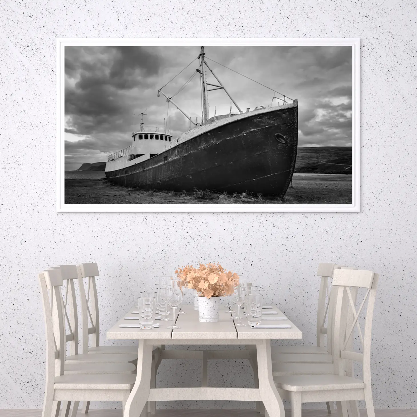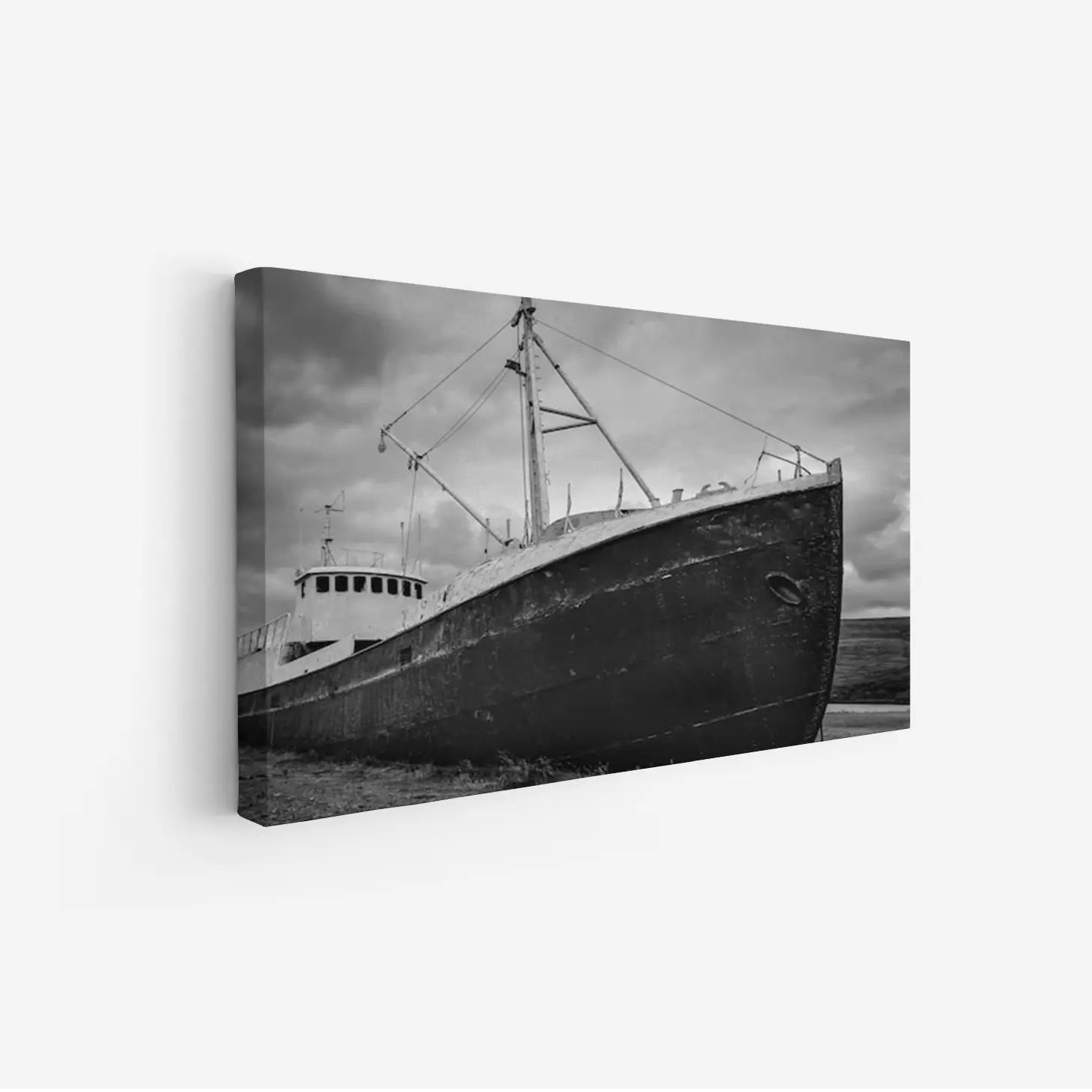 تجسد هذه اللوحة الفنية مشهدًا بحريًا يعبّر عن عمق التاريخ وجمال الطبيعة، حيث يبرز قارب قديم متوقف على ضفاف البحر تحت سماء ملبدة بالغيوم. تعكس الألوان الرمادية الداكنة والأضواء الخافتة إحساسًا بالهدوء والتأمل، مما يضفي على المكان لمسة من الأناقة والعمق. إن هذه القطعة الفنية ليست مجرد ديكور جداري، بل هي نافذة إلى عالم من الذكريات والمغامرات البحرية، مما يجعلها خيارًا مثاليًا لمن يسعى لإضفاء طابع خاص على مساحاته.