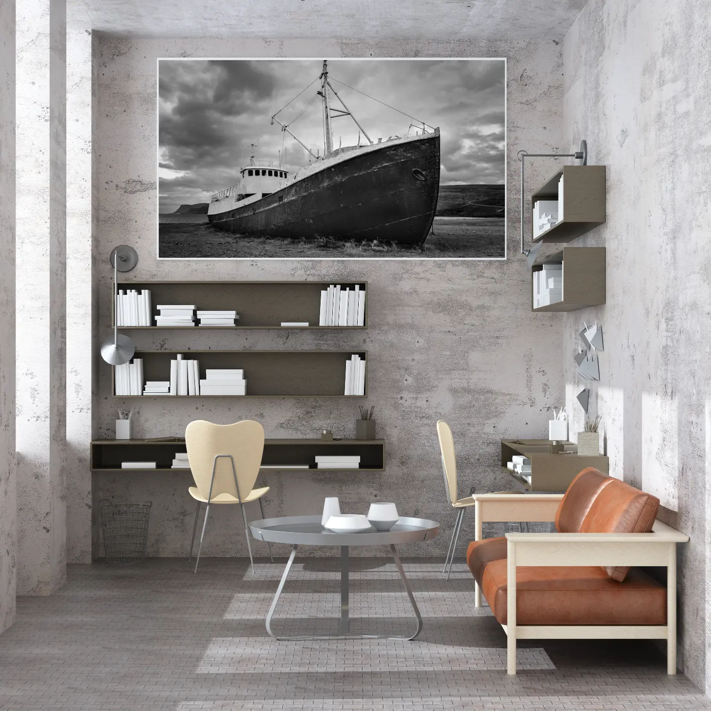 لوحة بحرية بسفينة قديمة تحت سماء غائمة بألوان رمادية، تعكس شعور الحنين والهدوء، لوحات طبيعة، لوحات كانفاس.