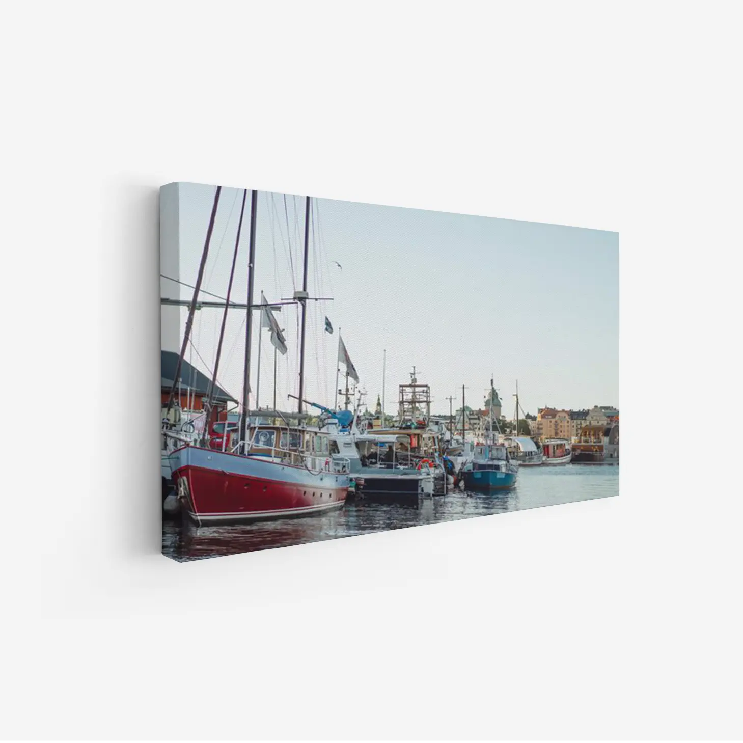 لوحة بحرية تضم قوارب ملونة تعكس ألوان السماء الزرقاء، مع أجواء هادئة ومريحة، لوحات طبيعة، لوحات كانفاس.