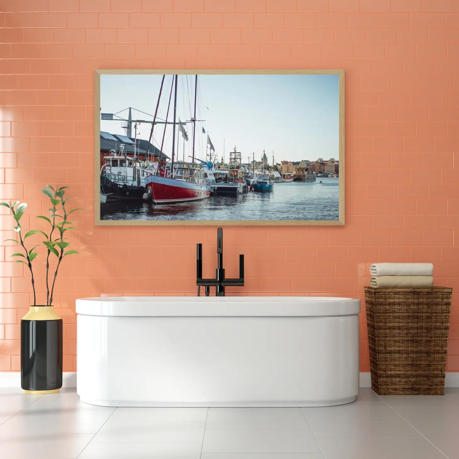 تتجلى في هذه اللوحة جماليات البحر والحياة البحرية، حيث تتناغم الألوان الزاهية للقوارب مع صفاء السماء، مما يخلق أجواءً من الهدوء والسكينة. تعكس اللوحة نمط حياة مفعم بالحيوية، حيث تلتقي الطبيعة مع النشاط البشري في مشهد يبعث على الإلهام. إن وجود هذه القطعة الفنية في أي مساحة من شأنه أن يضفي لمسة من الأناقة والرقي، مما يجعلها نقطة محورية تجذب الأنظار وتثير المشاعر الإيجابية.