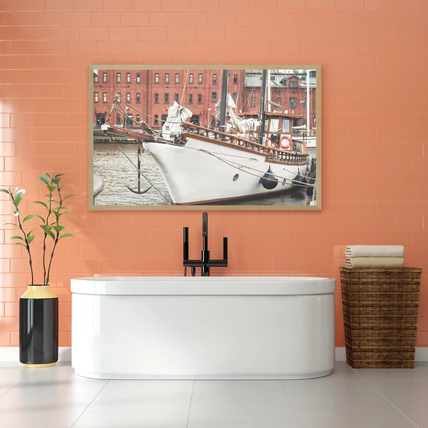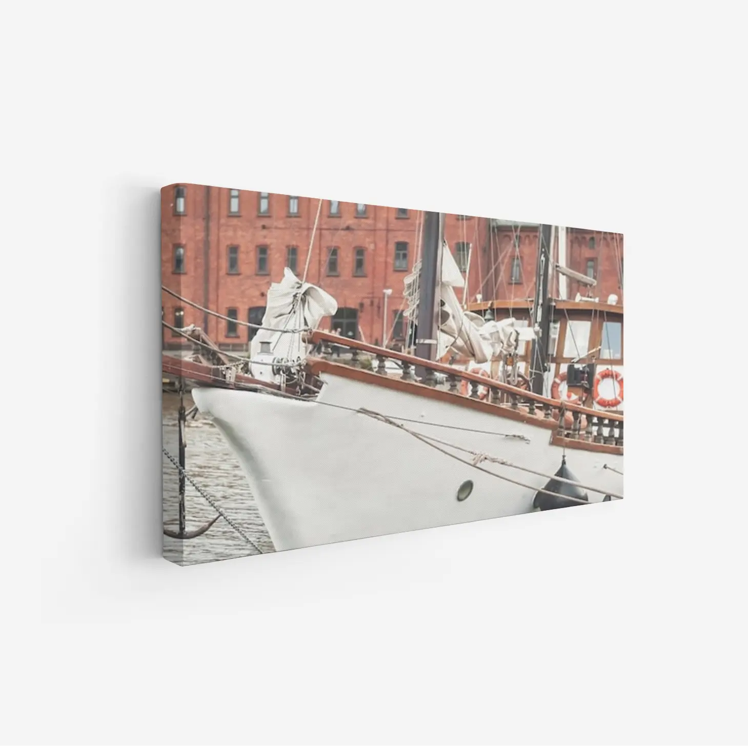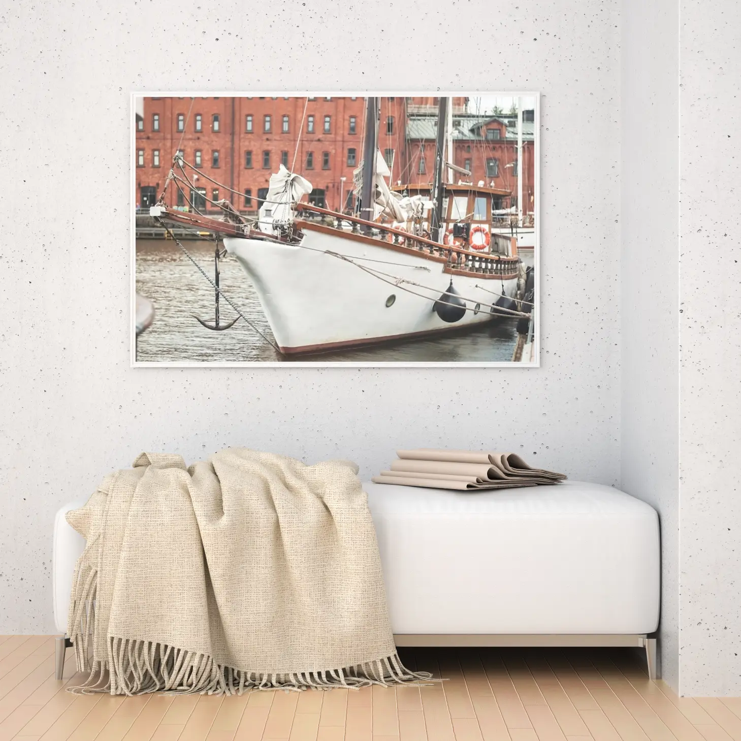 تجسد هذه اللوحة الفنية مشهدًا بحريًا ساحرًا، حيث تتناغم الألوان الهادئة مع تفاصيل القارب الأبيض الذي يرسو بهدوء على ضفاف الماء. تعكس الخلفية المعمارية الحمراء للمباني المحيطة أجواءً تاريخية غنية، مما يضفي على المكان لمسة من الأصالة والعمق. إن هذا المشهد لا يقتصر على كونه مجرد ديكور جداري، بل هو استثمار جمالي يضيف لمسة من الأناقة والهدوء إلى أي مساحة.