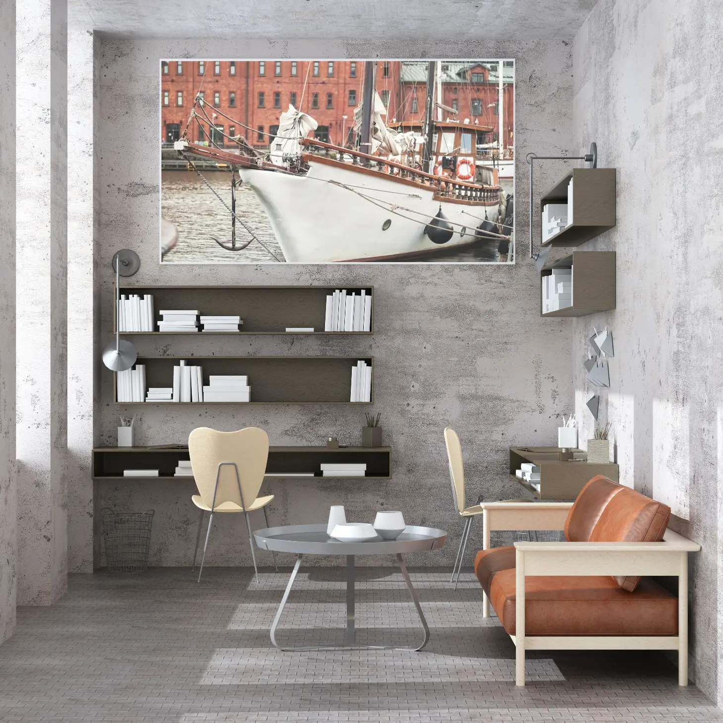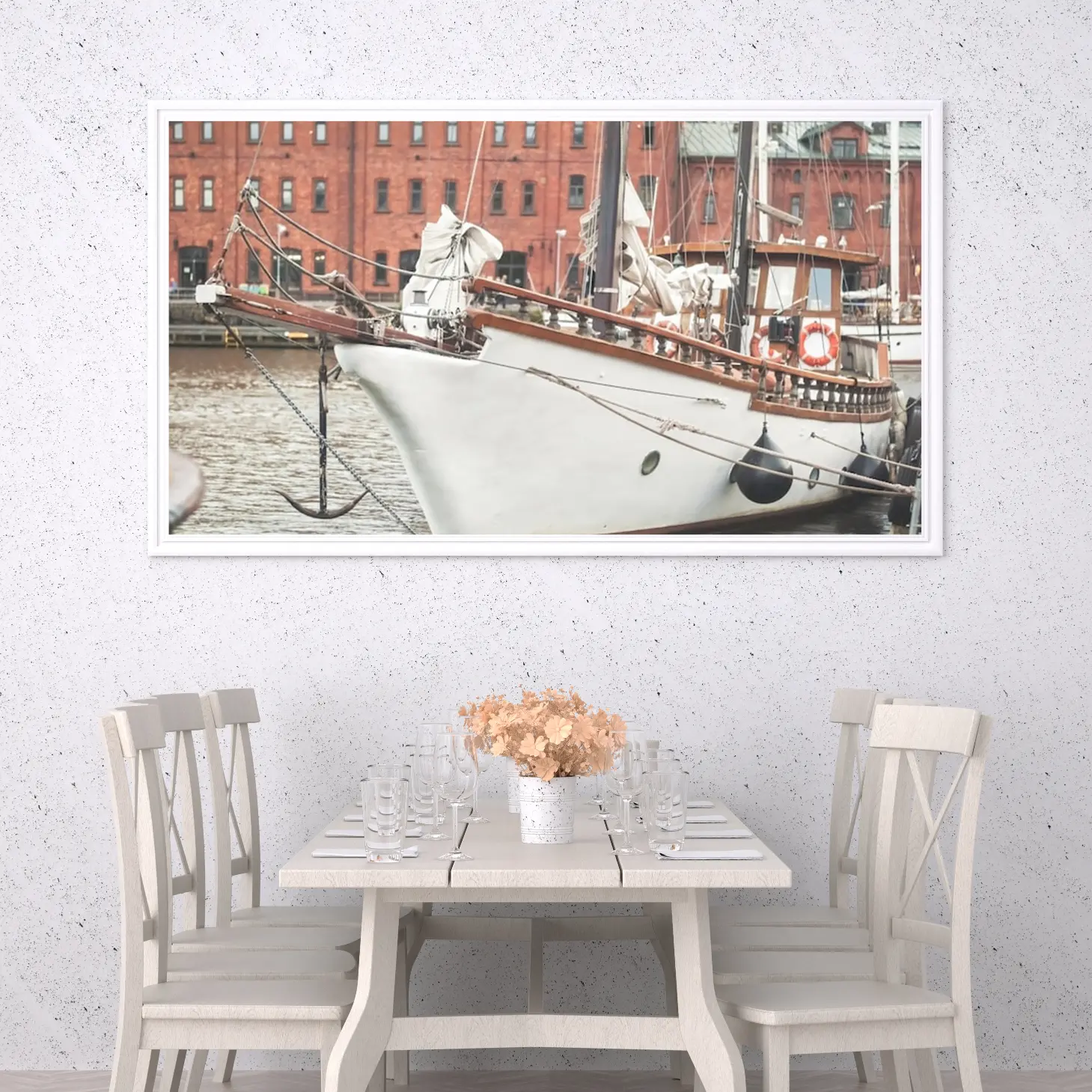 لوحة بحرية تظهر قاربًا أبيض يرسو بجانب مباني حمراء، أجواء هادئة ومريحة، لوحات طبيعة، لوحات كانفاس أنيقة