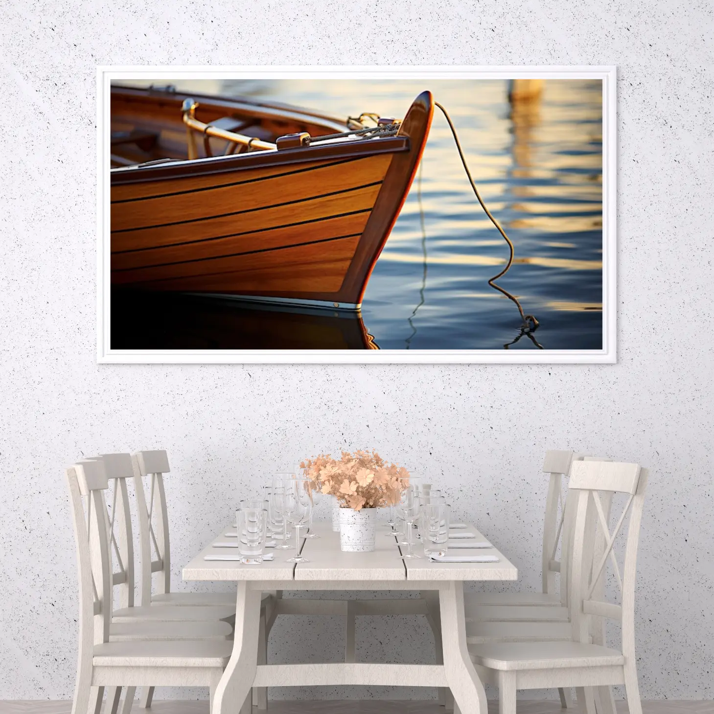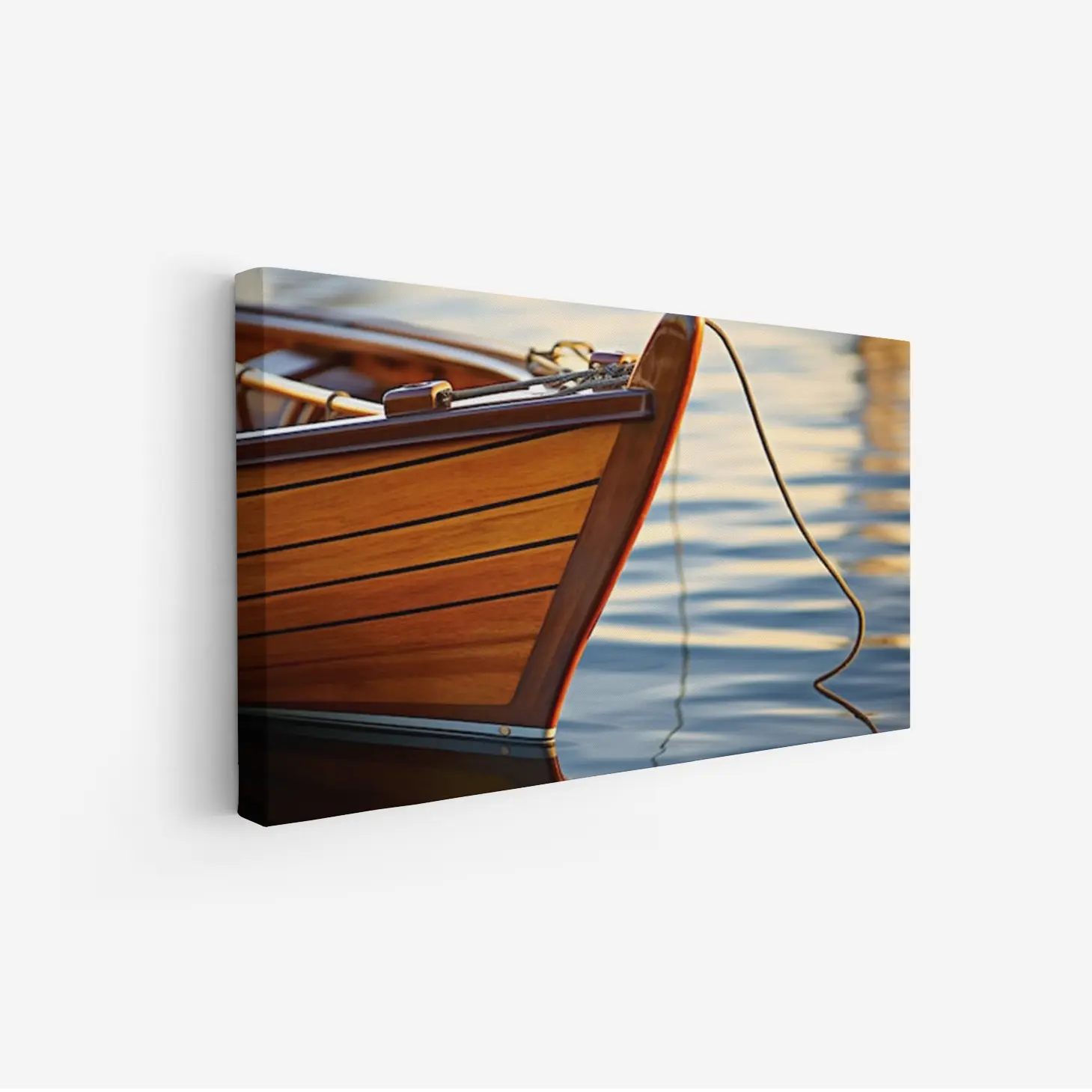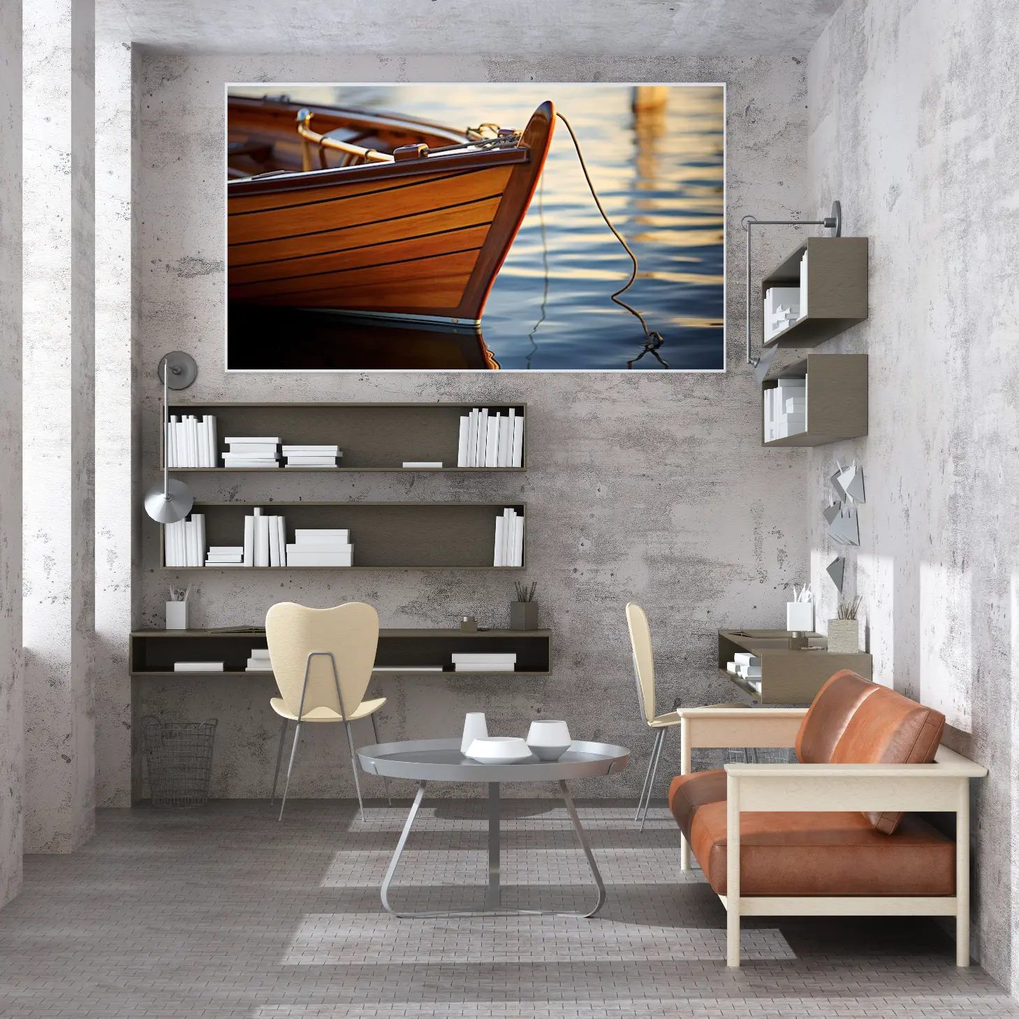 لوحة بحرية تظهر قاربًا خشبيًا بألوان دافئة تعكس ضوء الشمس على سطح الماء الهادئ، لوحات جمادات ومعالم، لوحات كانفاس.