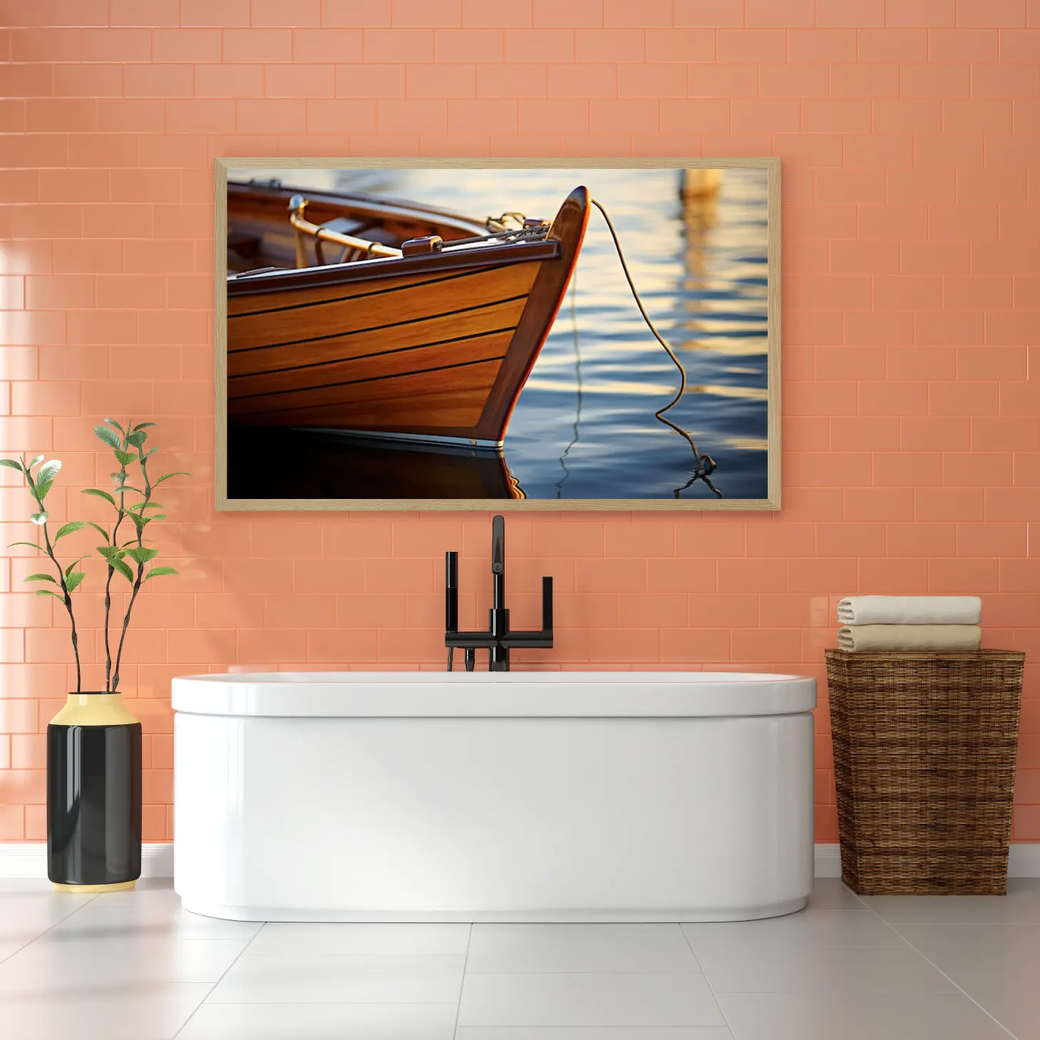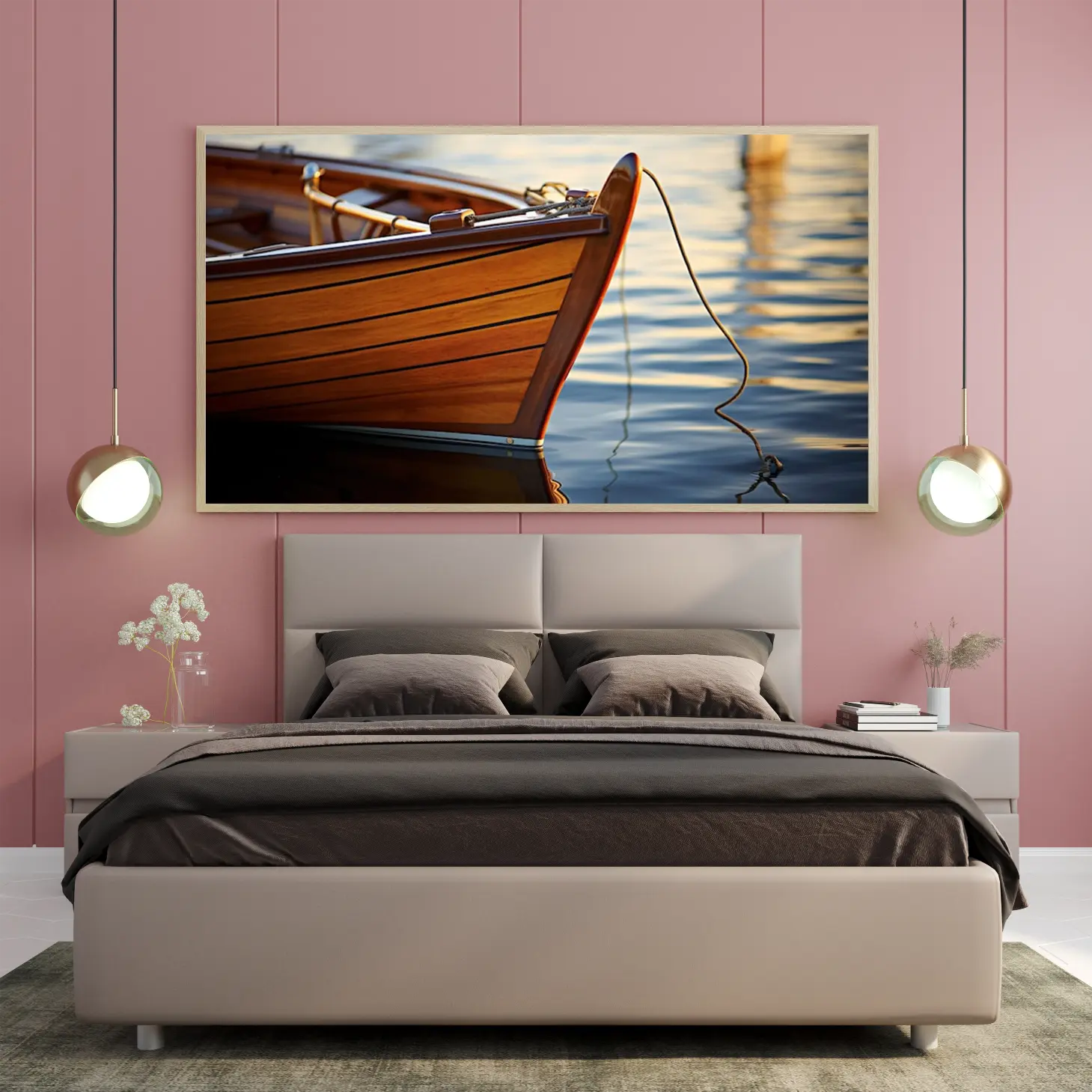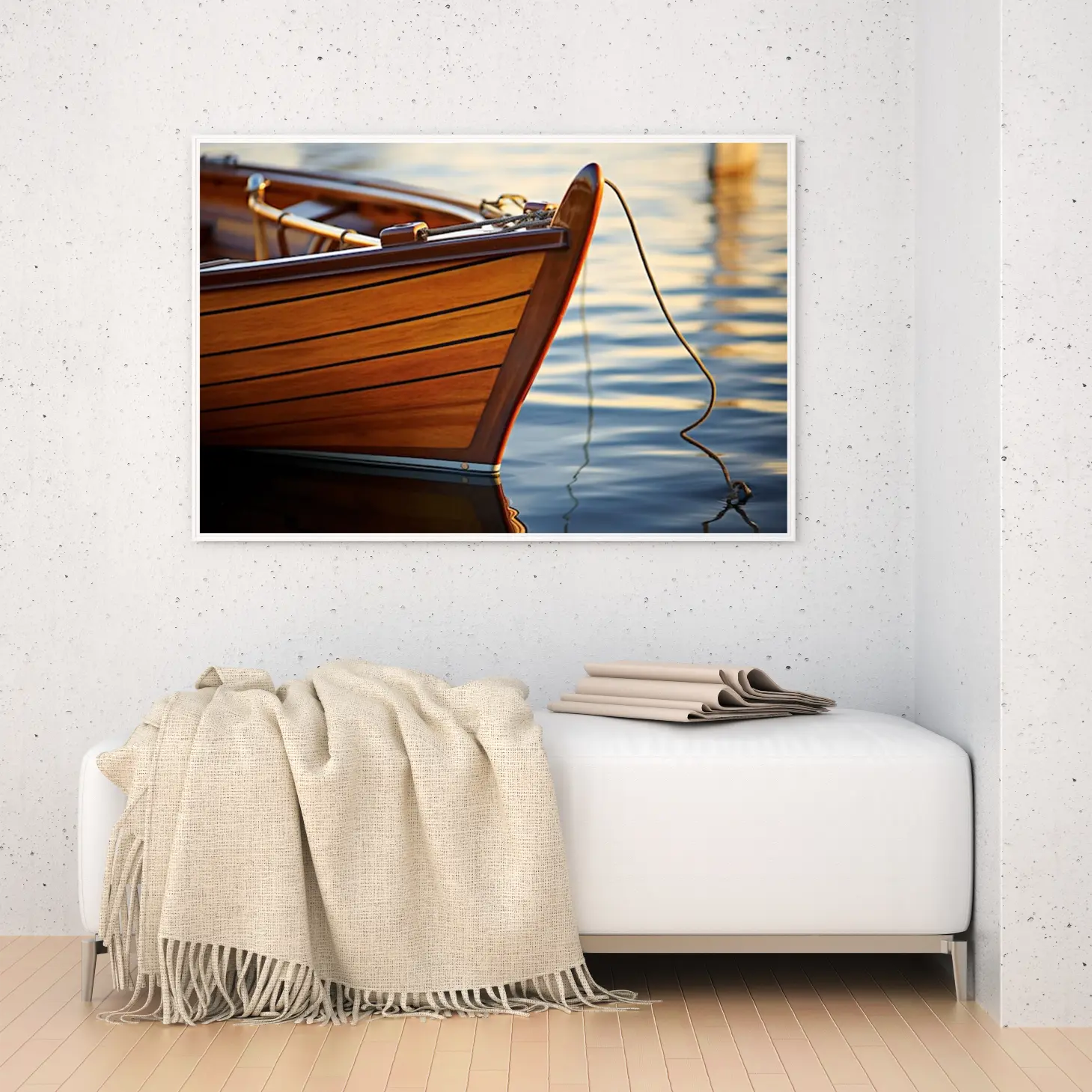 لوحة بحرية تظهر قاربًا خشبيًا بألوان دافئة تعكس ضوء الشمس على سطح الماء الهادئ، لوحات جمادات ومعالم، لوحات كانفاس.