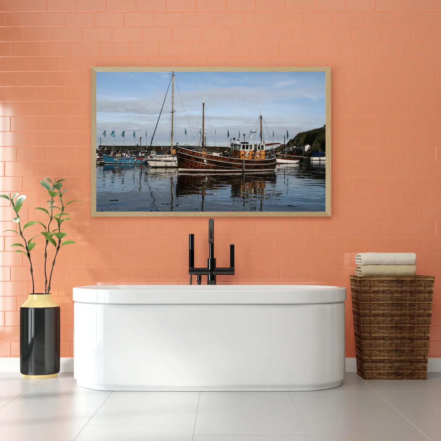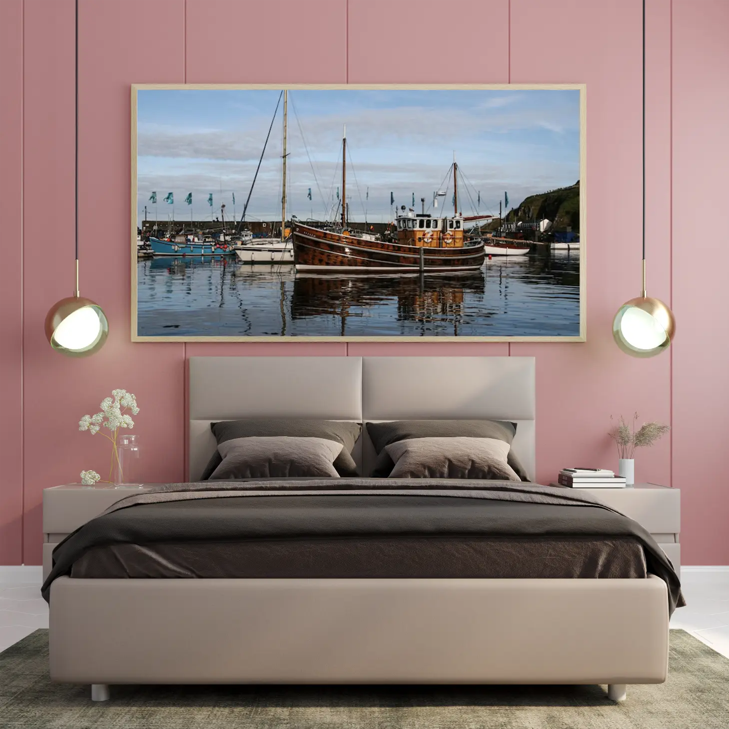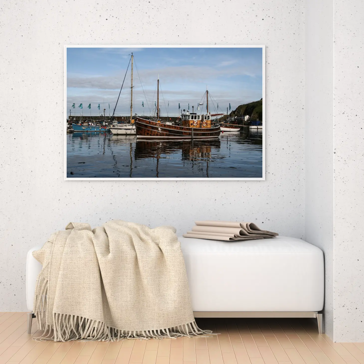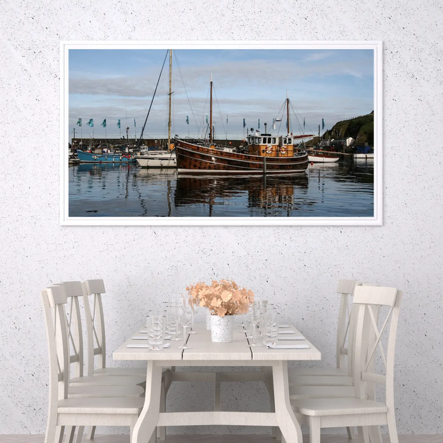 تجسد هذه اللوحة الفنية مشهدًا بحريًا ساحرًا، حيث تتناغم الألوان الهادئة مع تفاصيل القوارب الخشبية التي تعكس جمال الطبيعة. يضفي المشهد إحساسًا بالهدوء والسكينة، مما يجعله خيارًا مثاليًا لإضفاء لمسة من الرقي على أي مساحة. إن وجود هذه القطعة الفنية في منزلك أو مكتبك سيعزز من أجواء المكان، ويعكس نمط حياة متوازن ومليء بالذوق الرفيع.