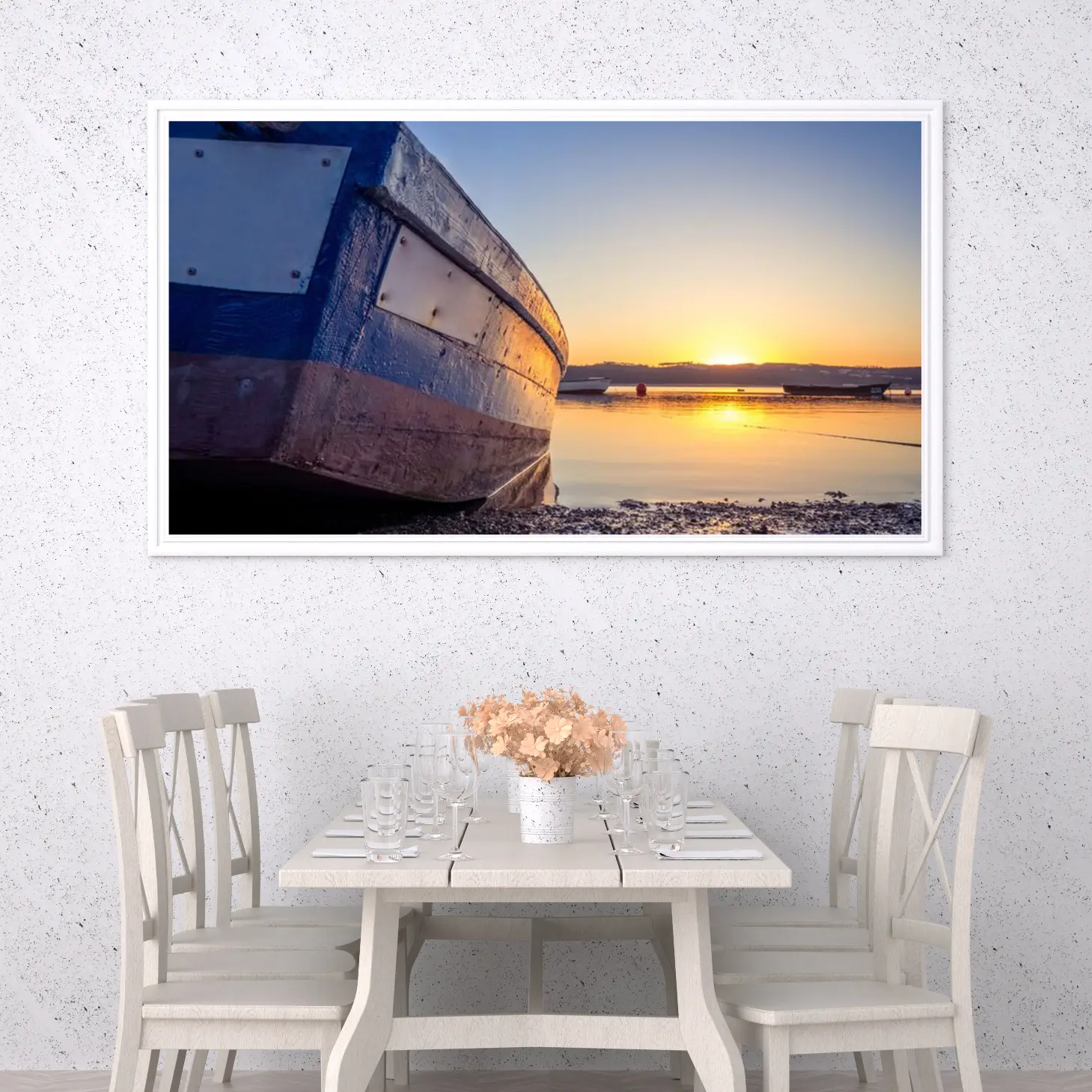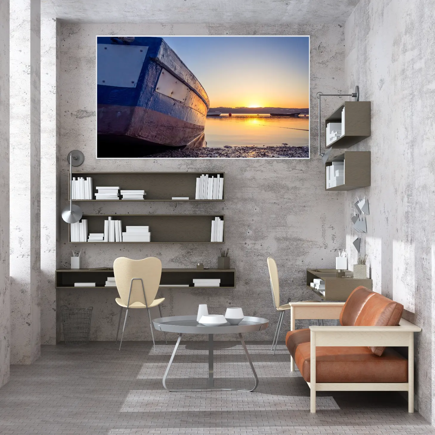 تتجلى في هذه اللوحة الفنية مشهد ساحر يجسد لحظة غروب الشمس، حيث تتناغم الألوان الدافئة مع صفاء المياه، مما يخلق أجواءً من السكون والسكينة. يبرز القارب بتفاصيله الدقيقة، مما يضفي لمسة من الحنين إلى الماضي ويعكس نمط حياة هادئ ومريح. هذه القطعة الفنية ليست مجرد ديكور جداري، بل هي استثمار جمالي يضيف لمسة من الأناقة إلى أي مساحة، مما يجعلها خيارًا مثاليًا لمن يسعى لإضفاء لمسة فنية على منزله.