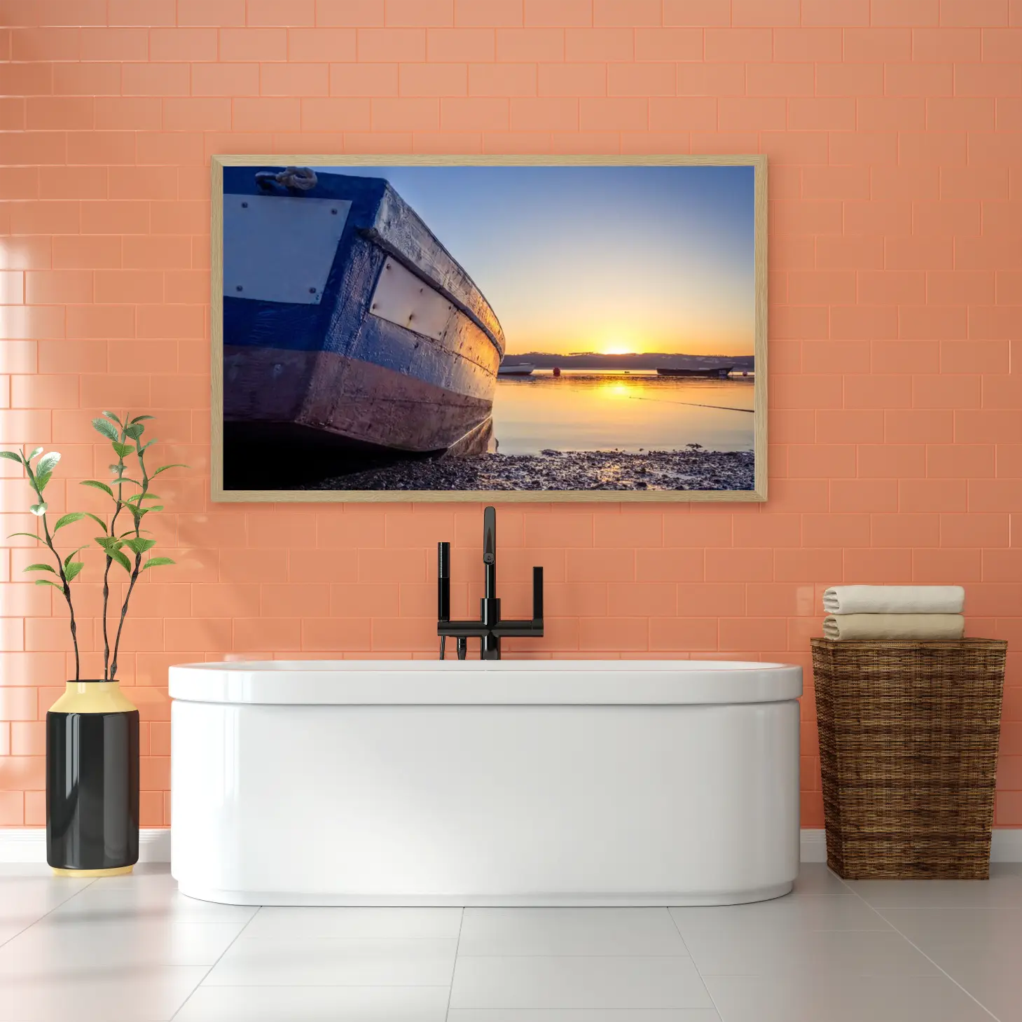 لوحة بحرية تظهر قاربًا قديمًا بلون أزرق مع غروب الشمس الدافئ وانعكاساته على الماء، لوحات جمادات ومعالم، لوحات كانفاس.