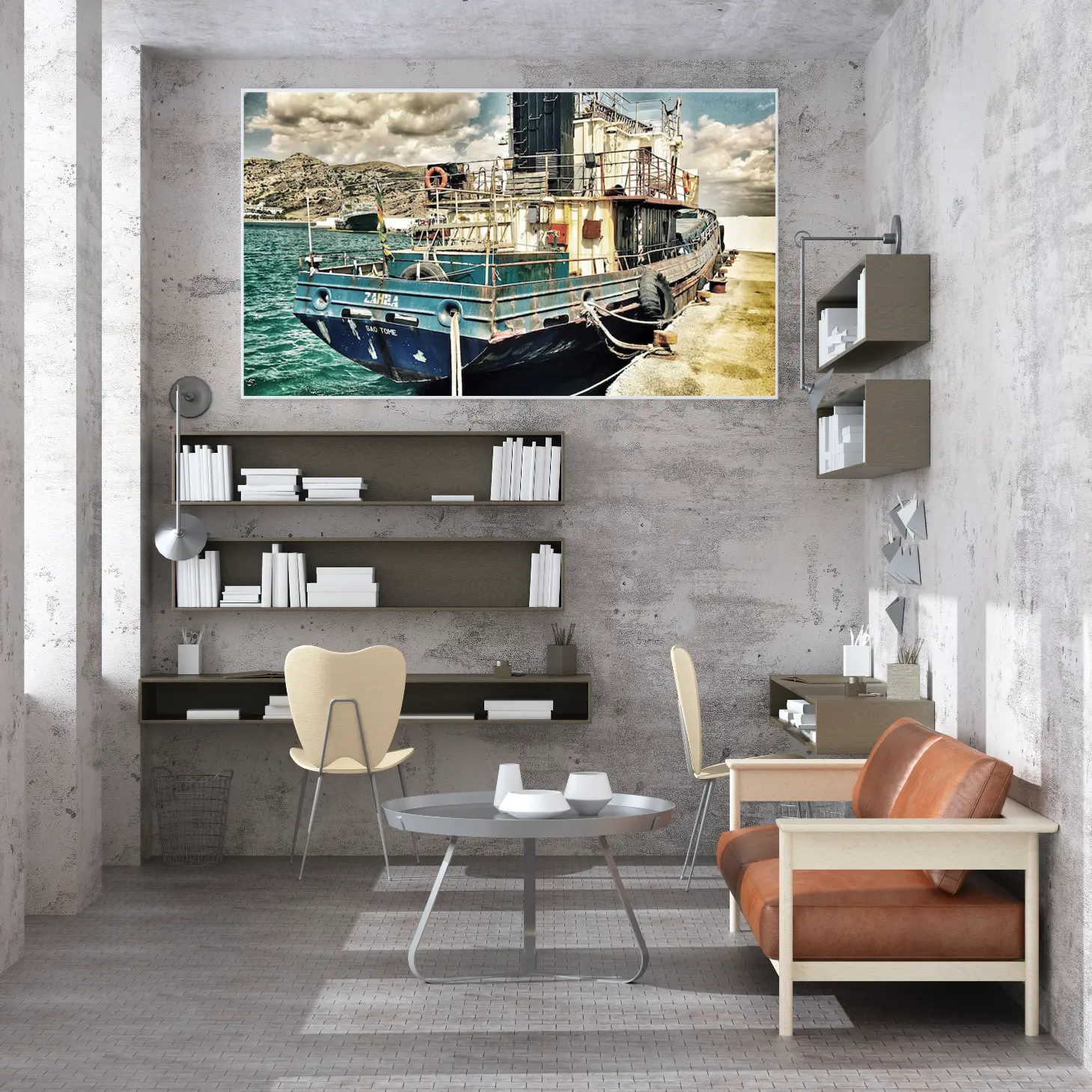 لوحة بحرية تظهر قاربًا قديمًا بلون أزرق مع تفاصيل معدنية، تحت سماء غائمة، تعكس أجواء المغامرة، لوحات جدارية، لوحات كانفاس.