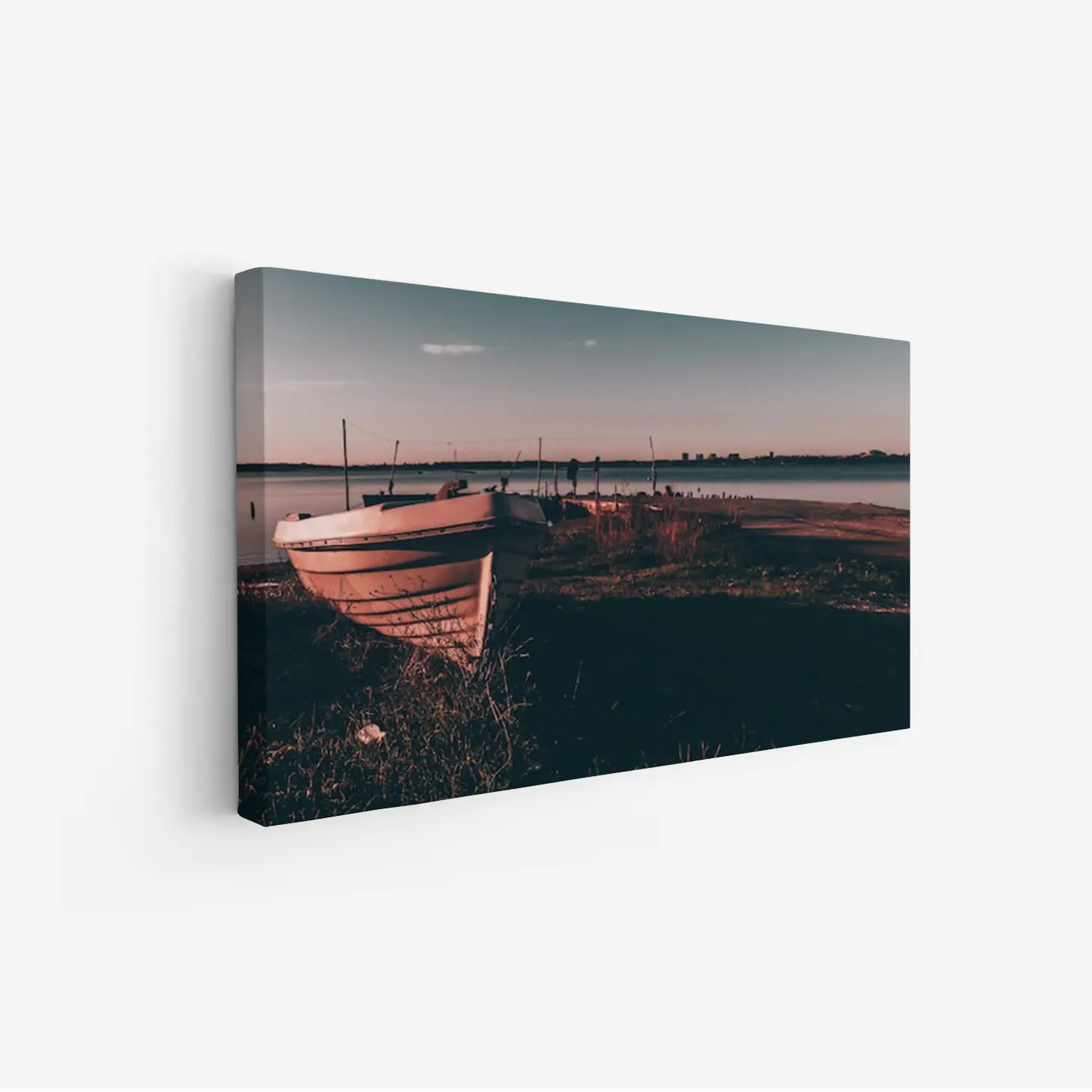 لوحة بحرية تظهر قاربًا قديمًا على ضفاف مائية هادئة بألوان دافئة وجو رومانسي، لوحات طبيعة، لوحات كانفاس.
