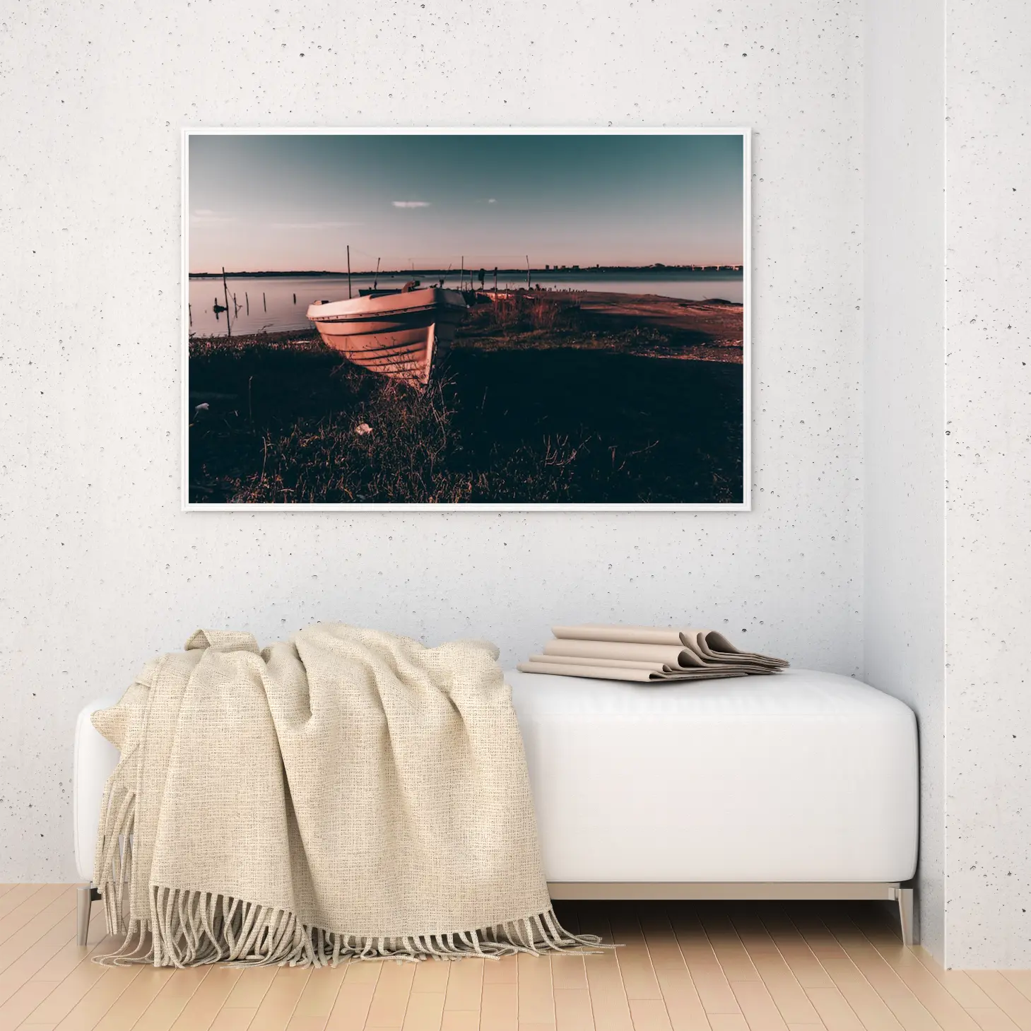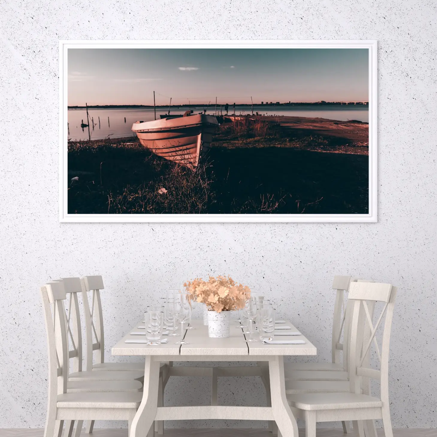 تجسد هذه اللوحة الفنية لحظة ساحرة من الطبيعة، حيث تتناغم ألوان الغروب مع تفاصيل القارب الراسي على ضفاف الماء. تعكس الأجواء الهادئة شعورًا بالسكينة والراحة، مما يجعلها خيارًا مثاليًا لإضفاء لمسة من الجمال على أي مساحة. تساهم هذه القطعة في خلق بيئة مريحة، تجعل من كل نظرة إليها تجربة فريدة تنقل المشاهد إلى عالم من الهدوء والتأمل.