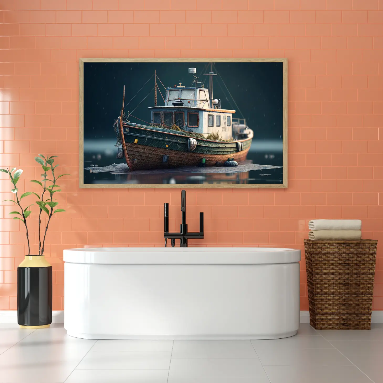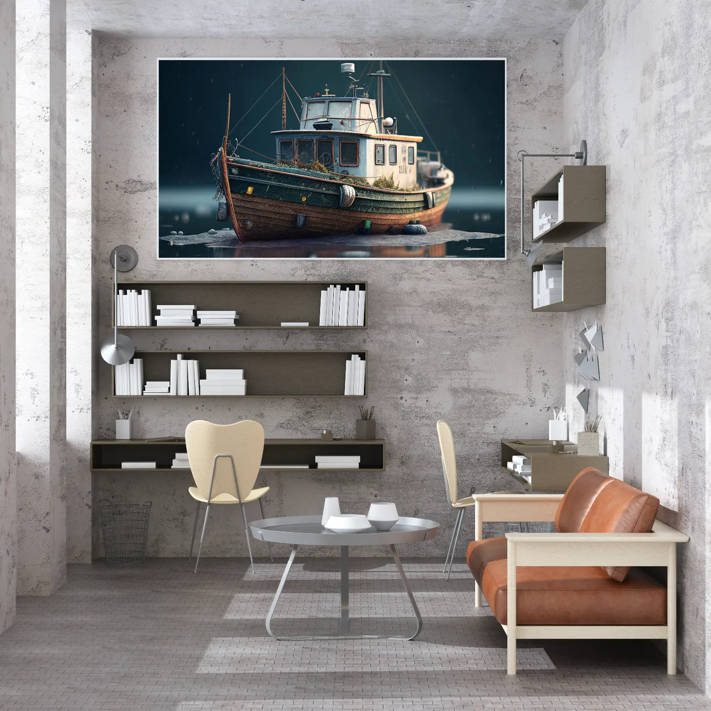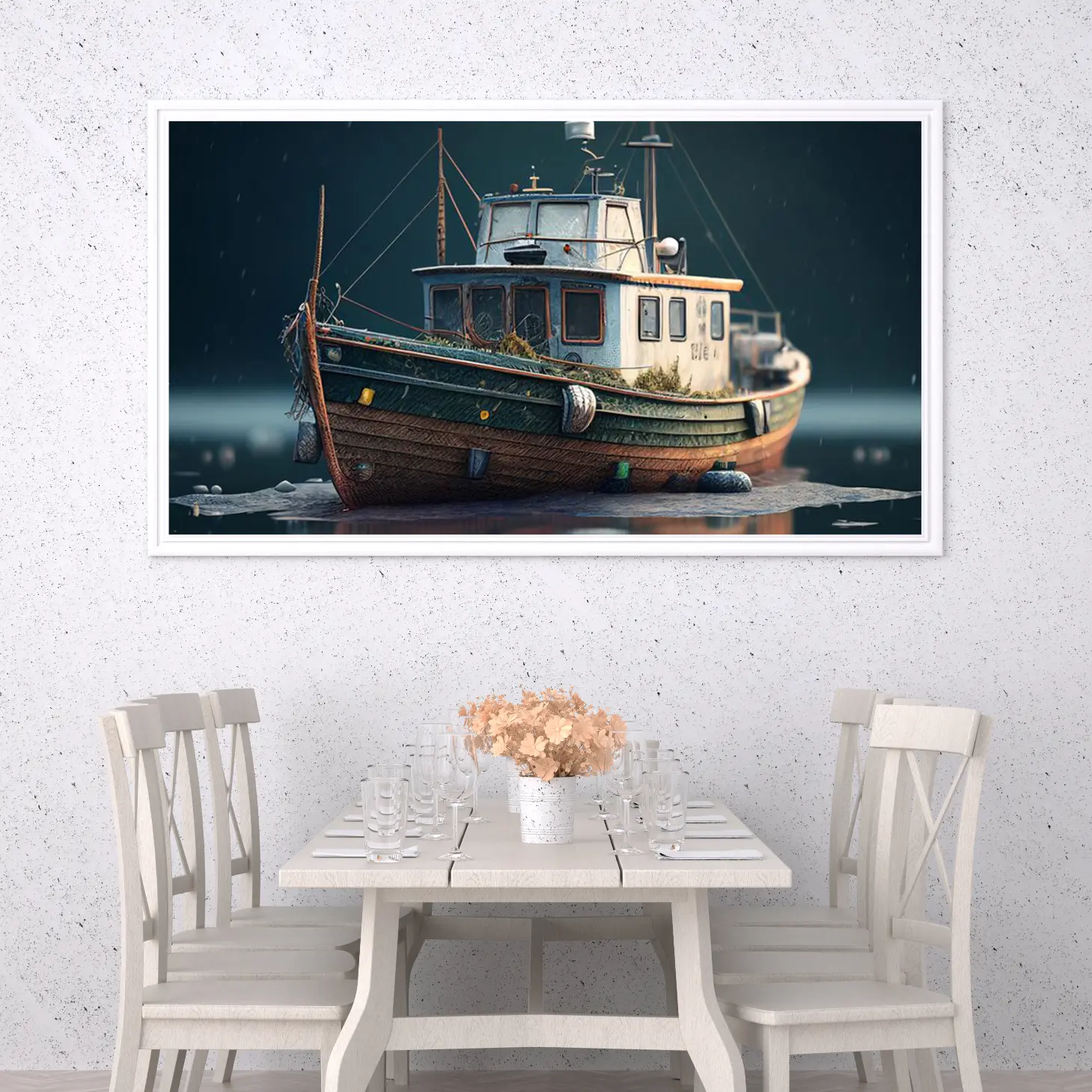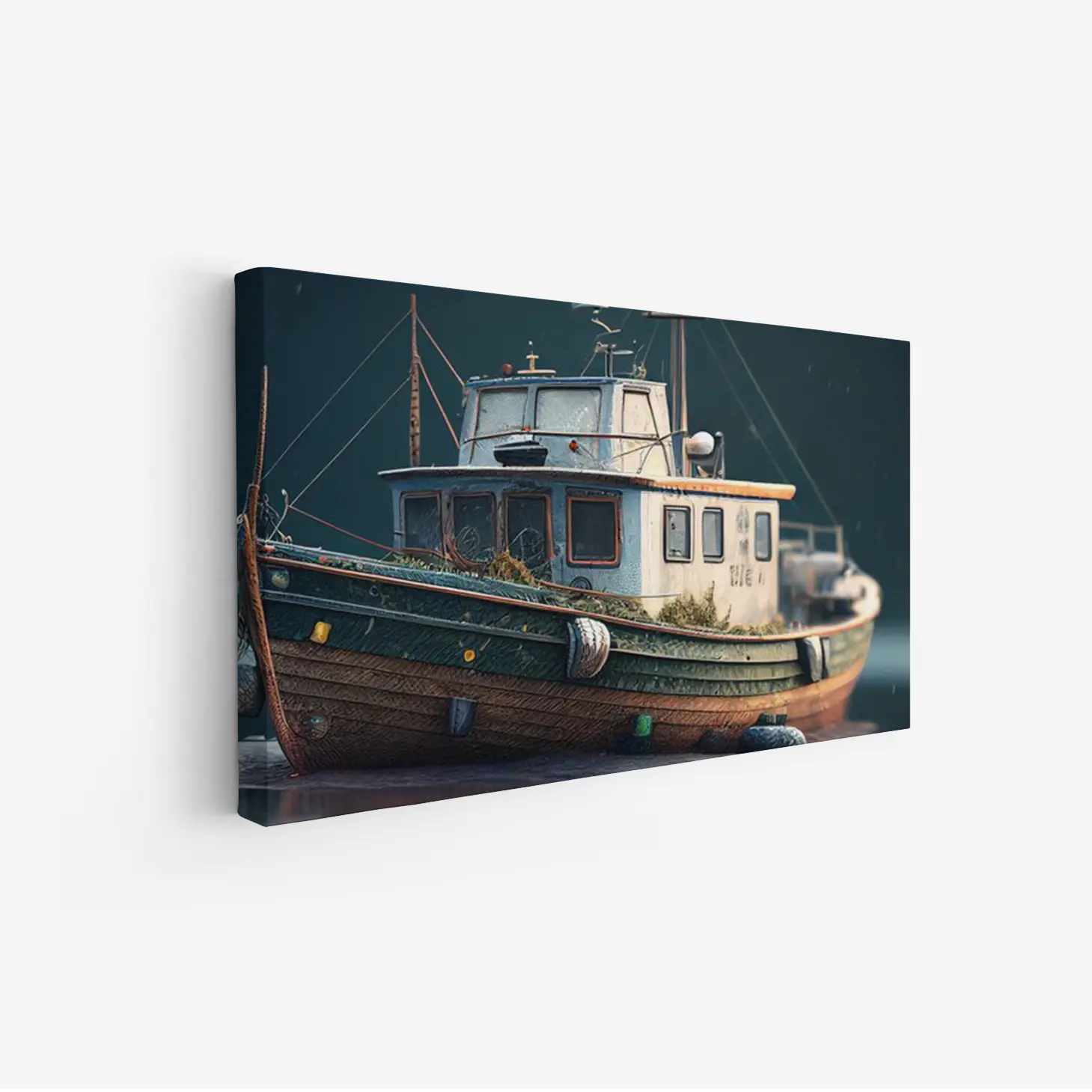 تجسد هذه اللوحة الفنية مشهدًا بحريًا ساحرًا، حيث يبرز قارب قديم يتناغم مع ألوان البحر الداكنة. تنقل الأجواء العامة شعورًا بالهدوء والسكينة، مما يجعلها إضافة مثالية لأي مساحة. تعكس تفاصيل القارب العتيق حكايات الزمن، مما يضفي لمسة من الأصالة والعمق على الديكور المنزلي. إن وجود هذه القطعة الفنية في المكان يعزز من نمط الحياة العصري، ويخلق بيئة مريحة وملهمة.