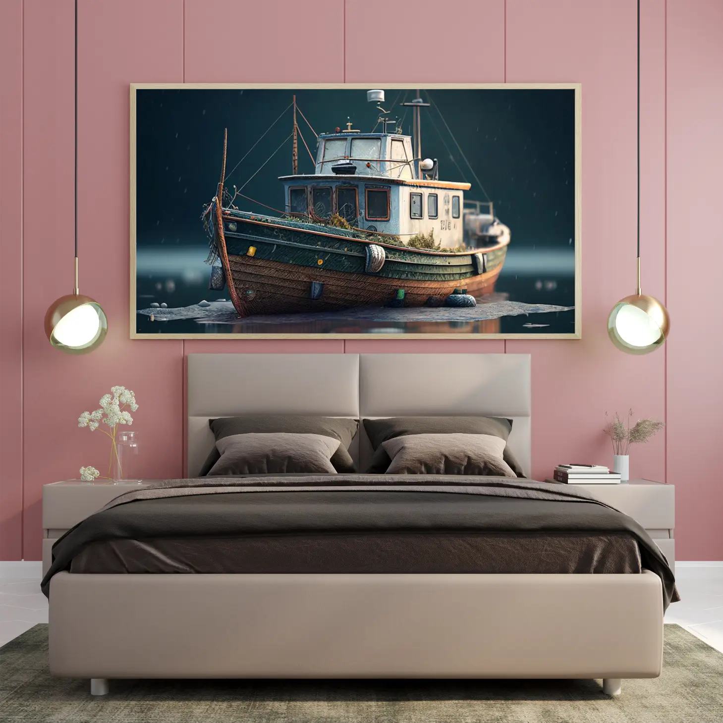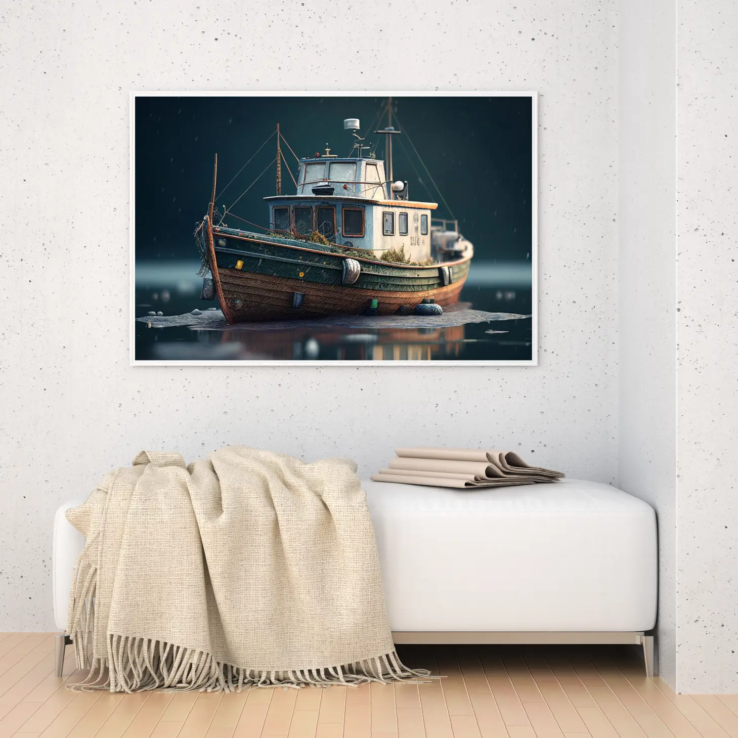 لوحة بحرية تظهر قاربًا قديمًا محاطًا بالمياه الهادئة، بألوان دافئة وجو هادئ، لوحات طبيعة، لوحات كانفاس.