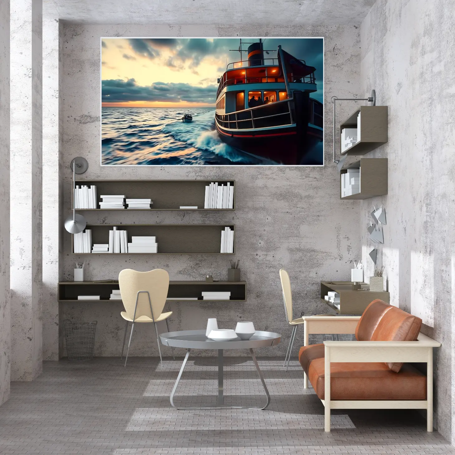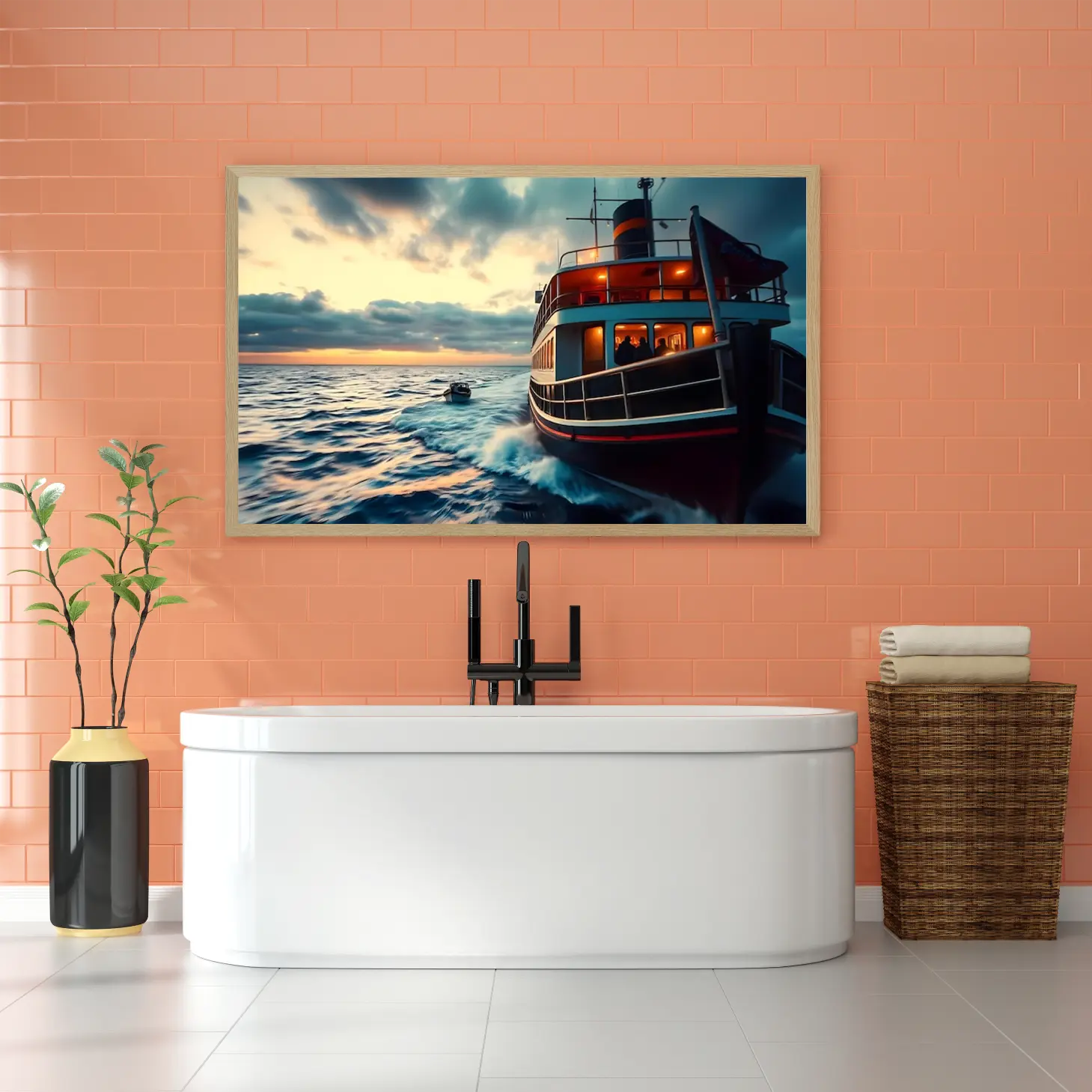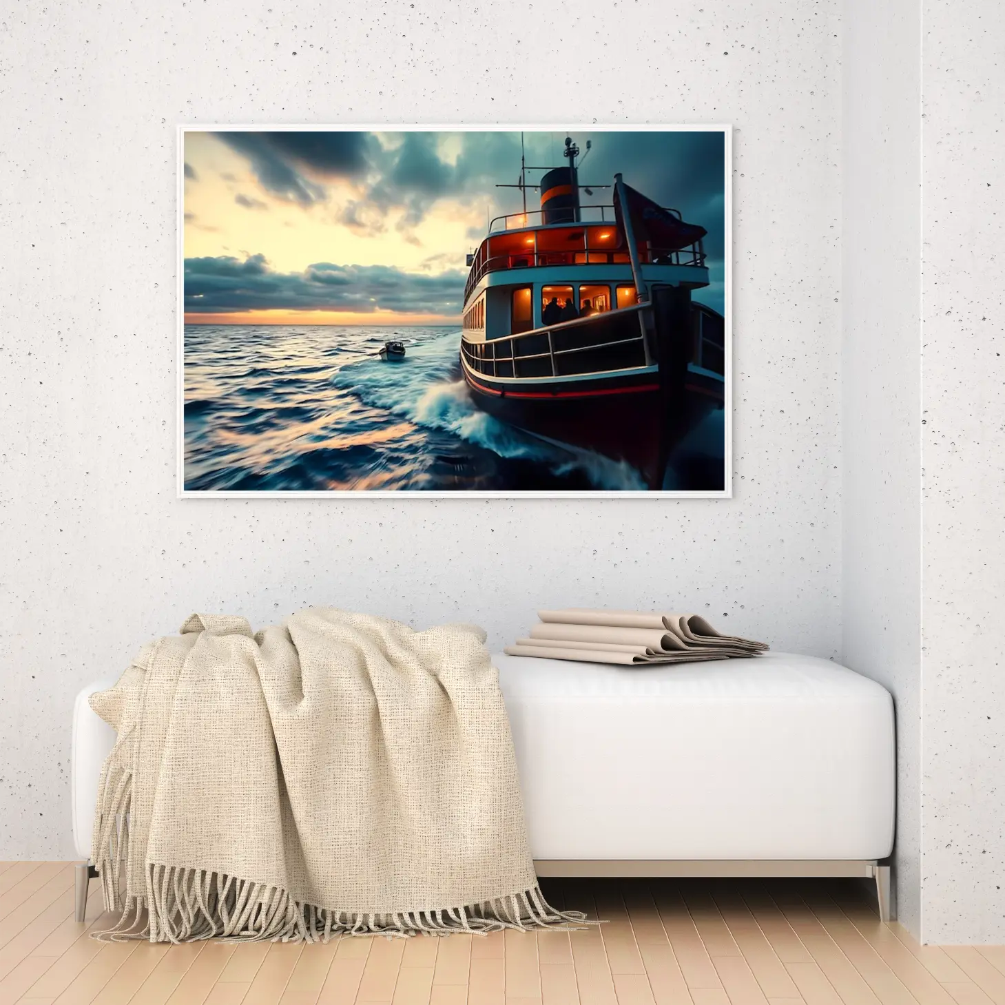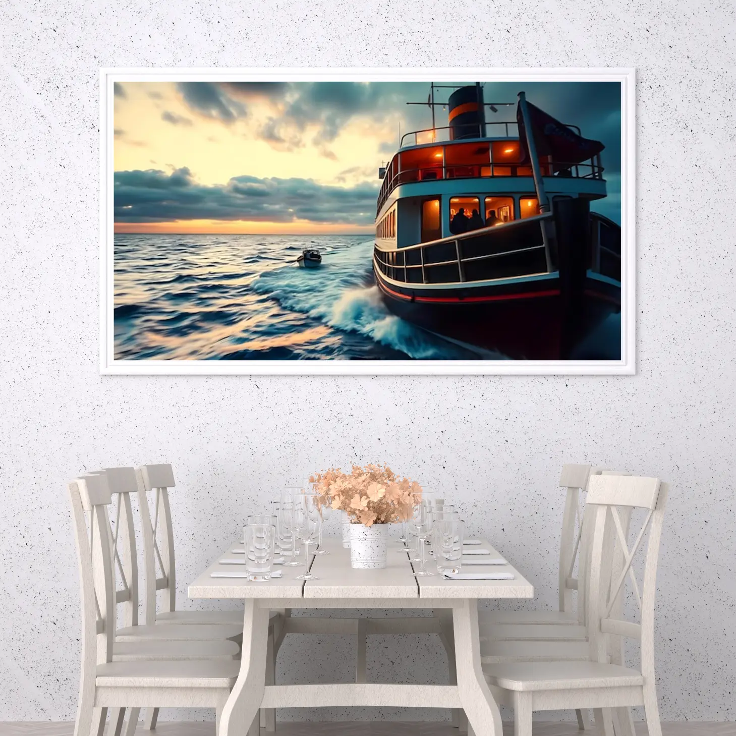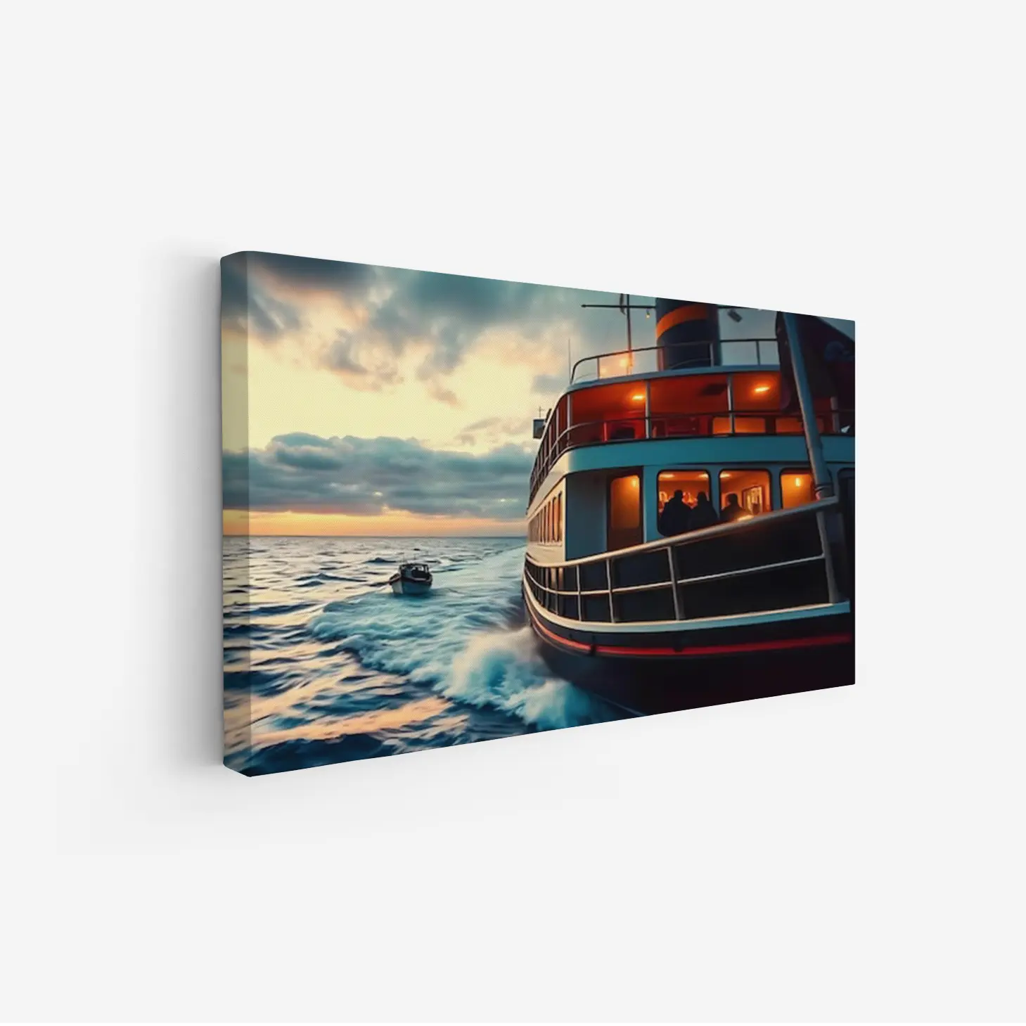 تجسد هذه اللوحة الفنية مشهدًا بحريًا ساحرًا، حيث تتناغم ألوان الغروب مع أمواج البحر الهادئة، مما يخلق إحساسًا بالهدوء والسكينة. تبرز تفاصيل القارب الكبير الذي يبحر برشاقة، محاطًا بأضواء دافئة تعكس جمال اللحظة. إن هذا العمل الفني لا يضيف فقط لمسة جمالية للمكان، بل يخلق أيضًا أجواءً من الاسترخاء والراحة، مما يجعله خيارًا مثاليًا لتزيين المساحات المختلفة.